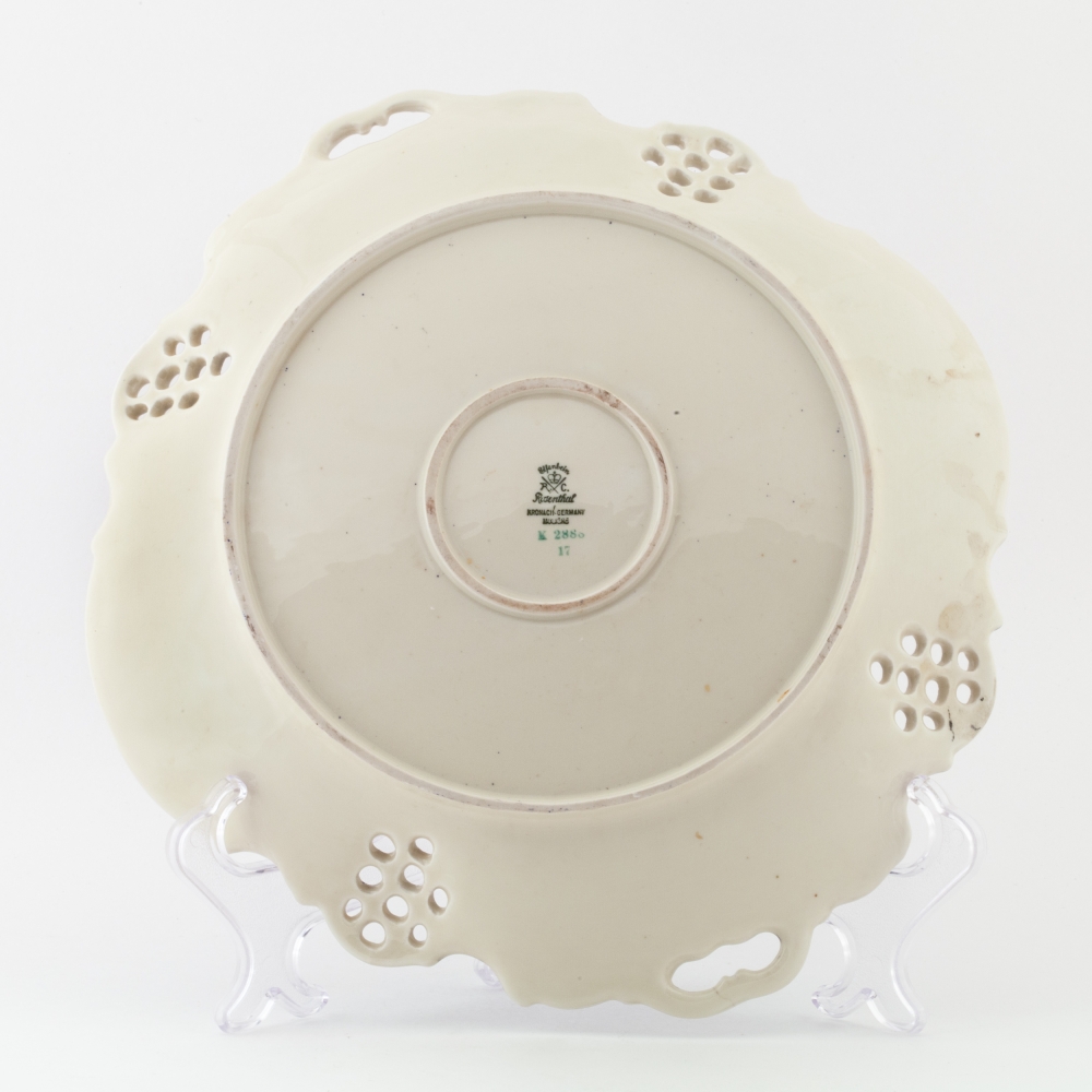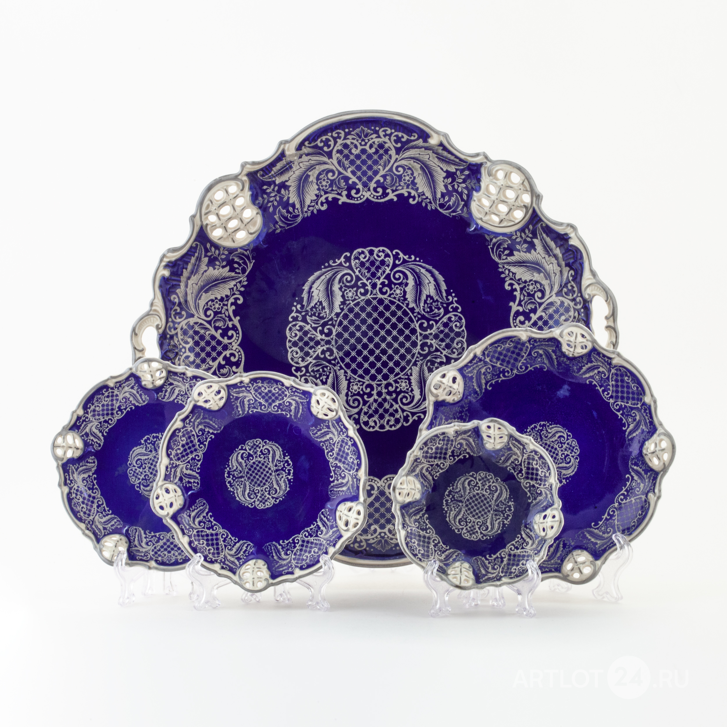 Фарфор, рельеф, крытье синим, монохромная деколь, зеленые печатные подглазурные клейма фарфорового завода Филиппа Розенталя «Rosenthal & Co» в Кронахе, Бавария, Германия, 1901-1933 годы, диаметр блюда - 29,5 см, пирожковой тарелки - 15,5 см; двух блюдец -