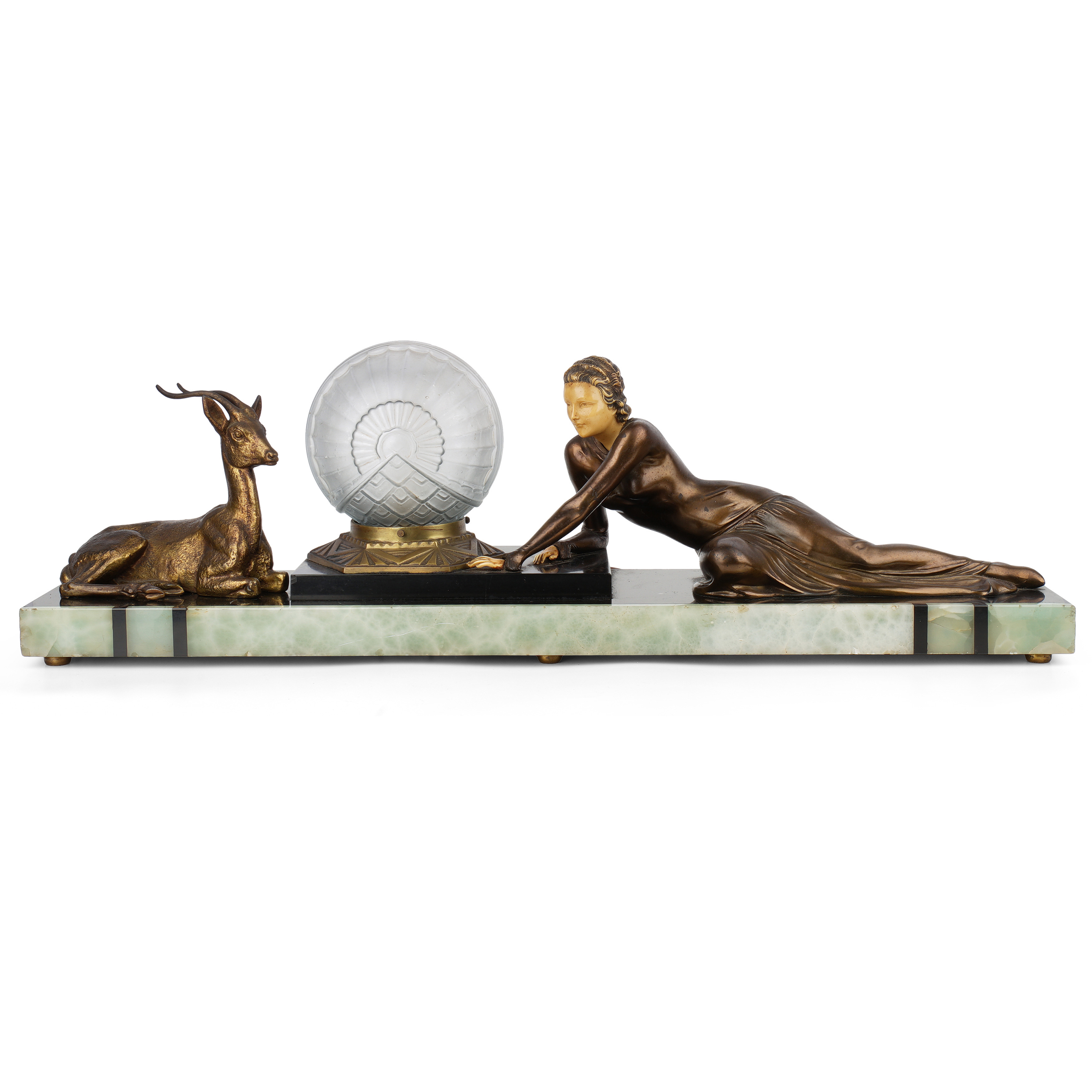 Кабинетная скульптура с лампой в стиле ар-деко. Бронза, литье, окраска, мрамор, оникс, матовое стекло,размер (в/ш/г): 24 х 77 х 17 см