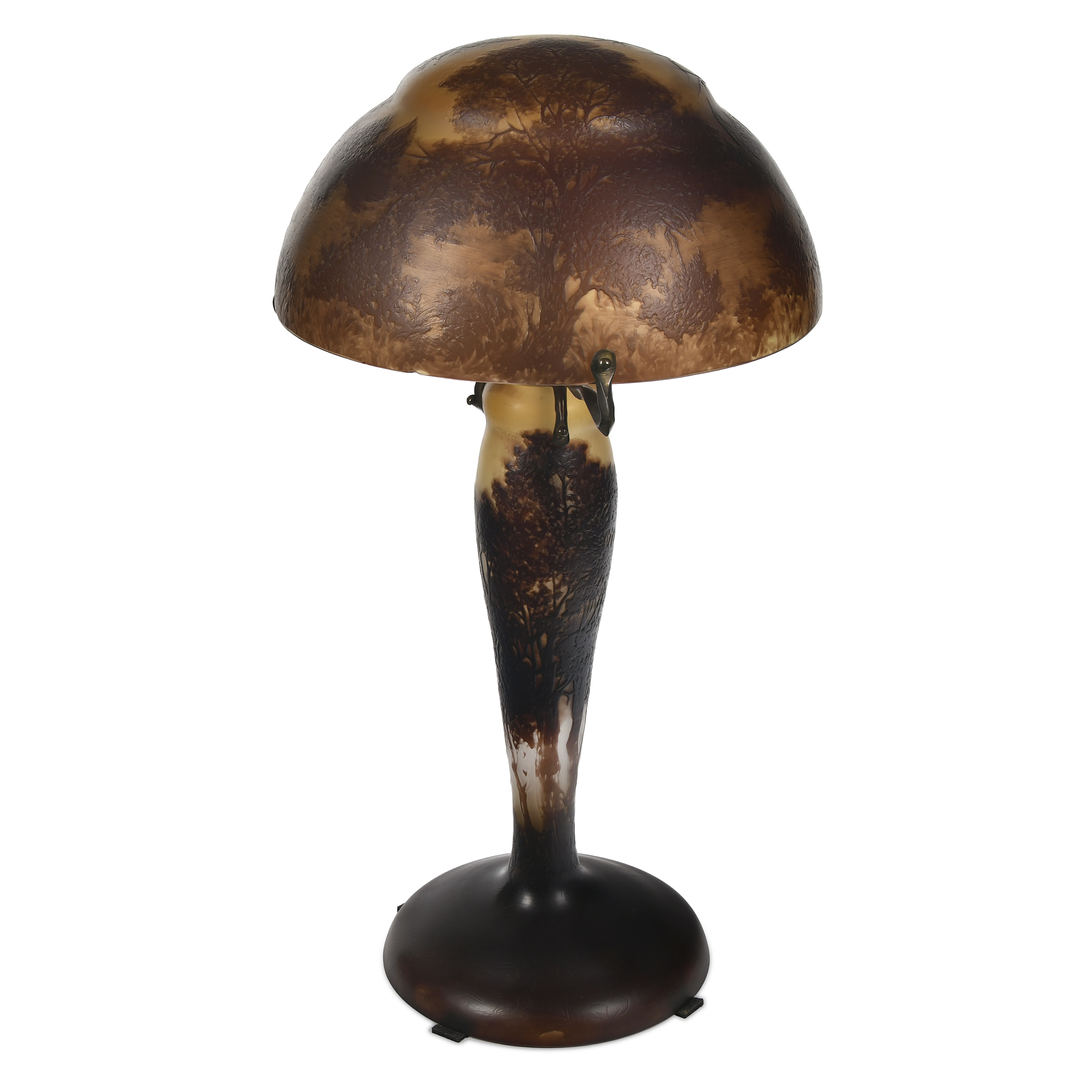Декор лампы построен на мотиве лесного пейзажа, выполненного в технике камео-стекла: на нескольких слоях цветной массы травлением создается рельефный силуэт деревьев и ветвей. Переходы от насыщенного коричневого к мягким оранжевым оттенкам дают выразительный эффект рассветного или закатного света — при включении лампа усиливает эту градацию и создает характерное для нансийского стекла ощущение глубины пространства. Ножка выполнена в почти монохромной гамме, построенной на сочетании прозрачных и матированных участков. Грибовидная форма лампы, плавные переходы масс перекликаются с формами природного происхождения, что было одним из ключевых принципов декоративного искусства в Лотарингии начала XX века.