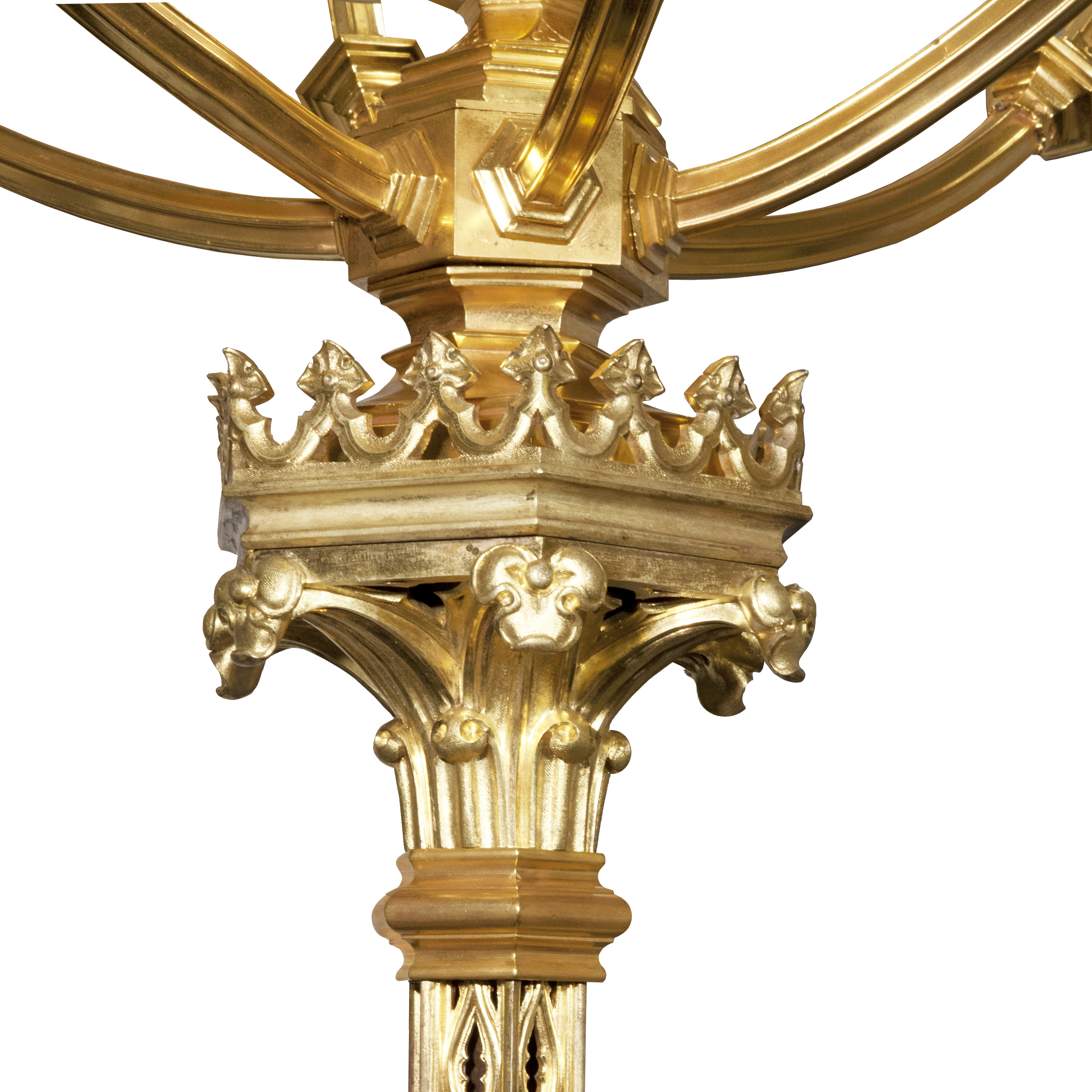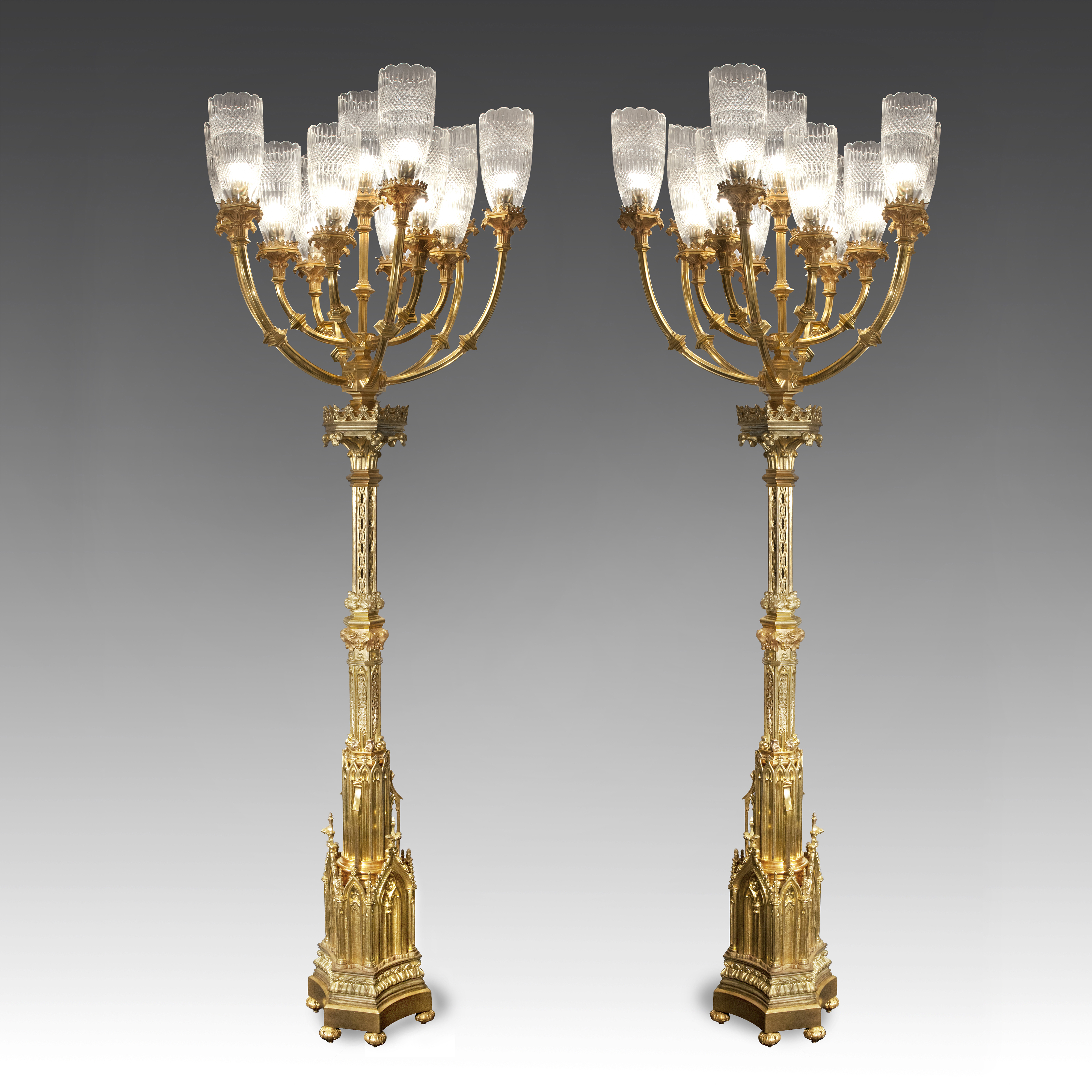 Торшера на 13 свечей с основаниями, декоративно решенными в виде порталов готического собора. Бронза, литье, чеканка, плафоны бесцветного стекла, выдувание, прессование, резьба; высота - 205 см, диаметр по рожкам – 70 см, высота плафона - 25 см