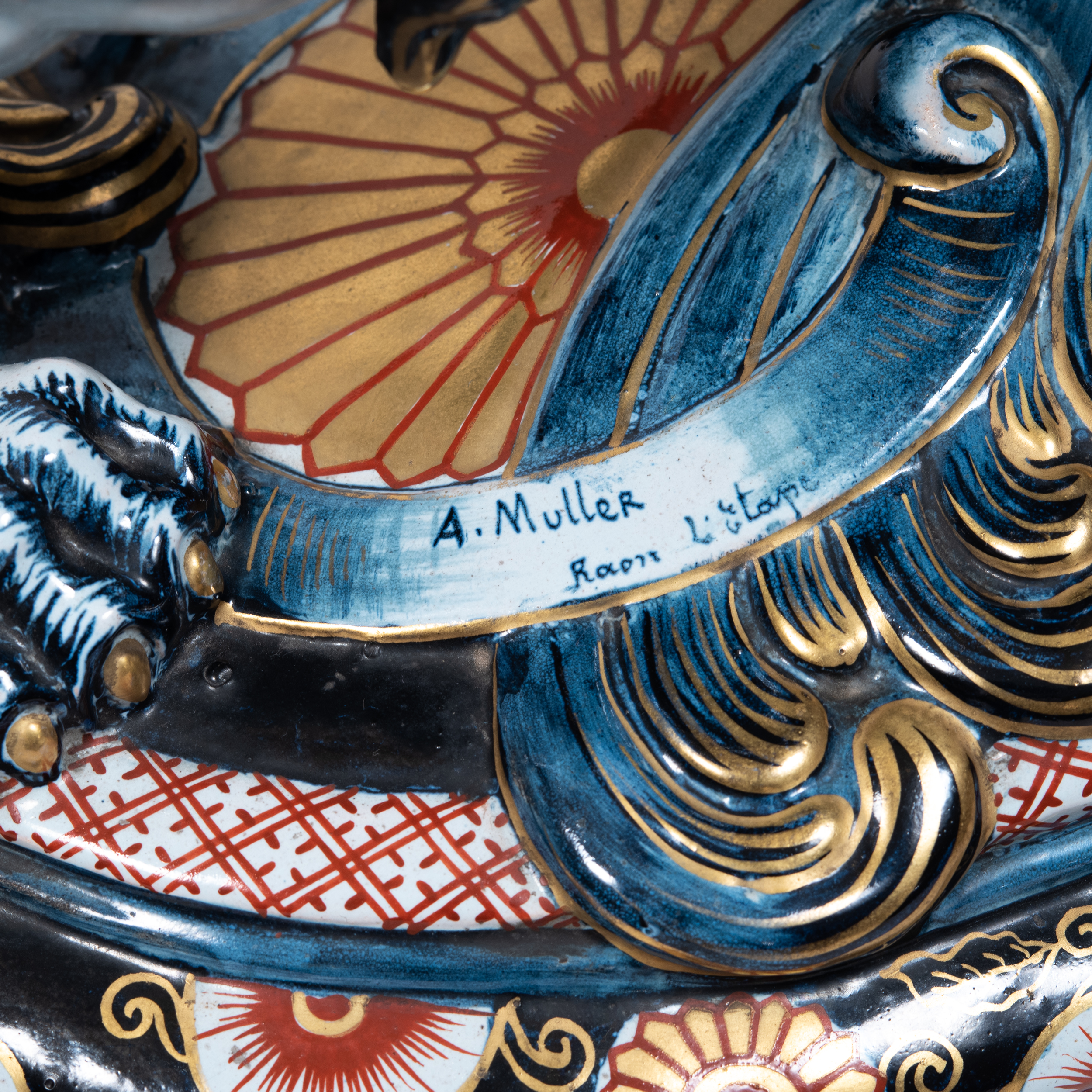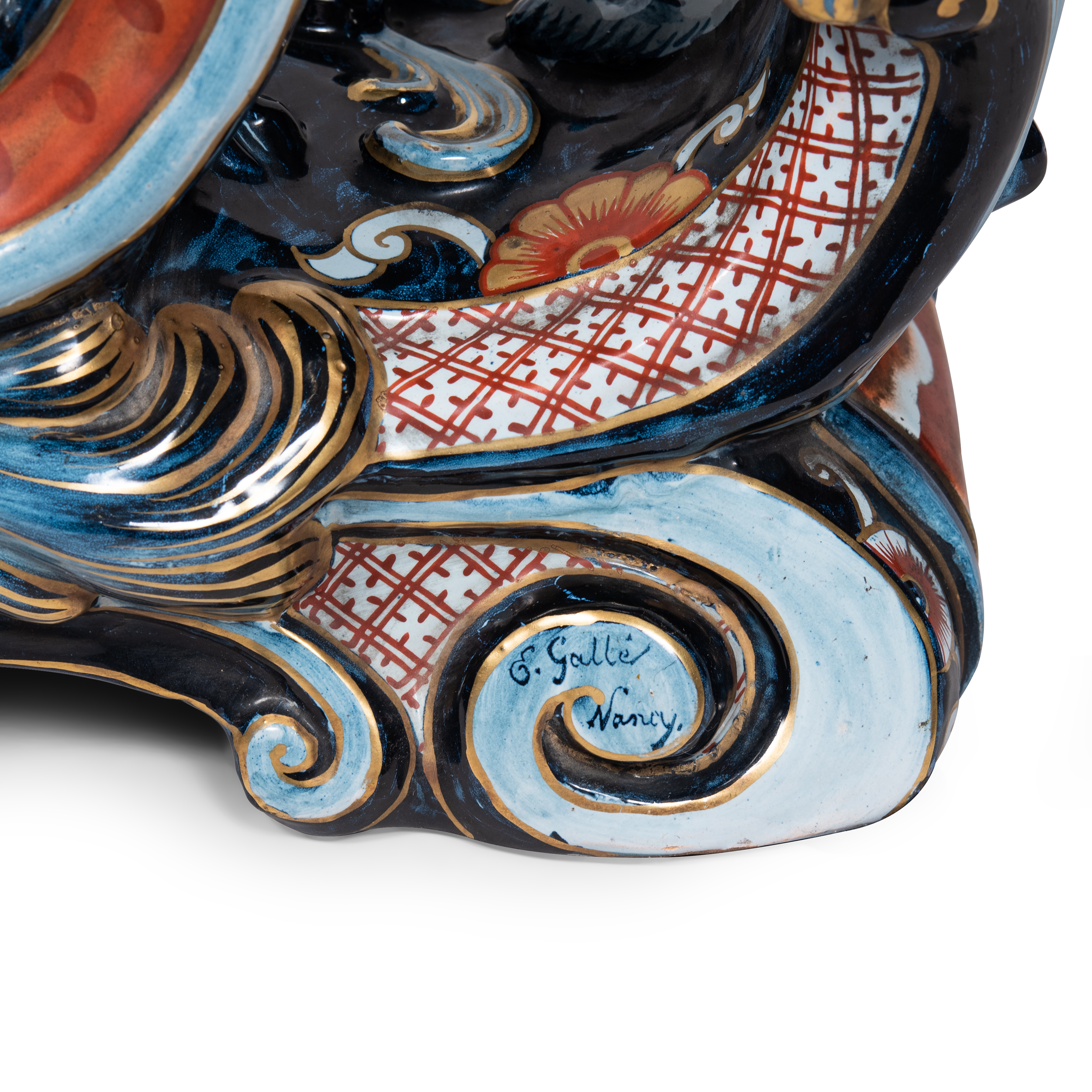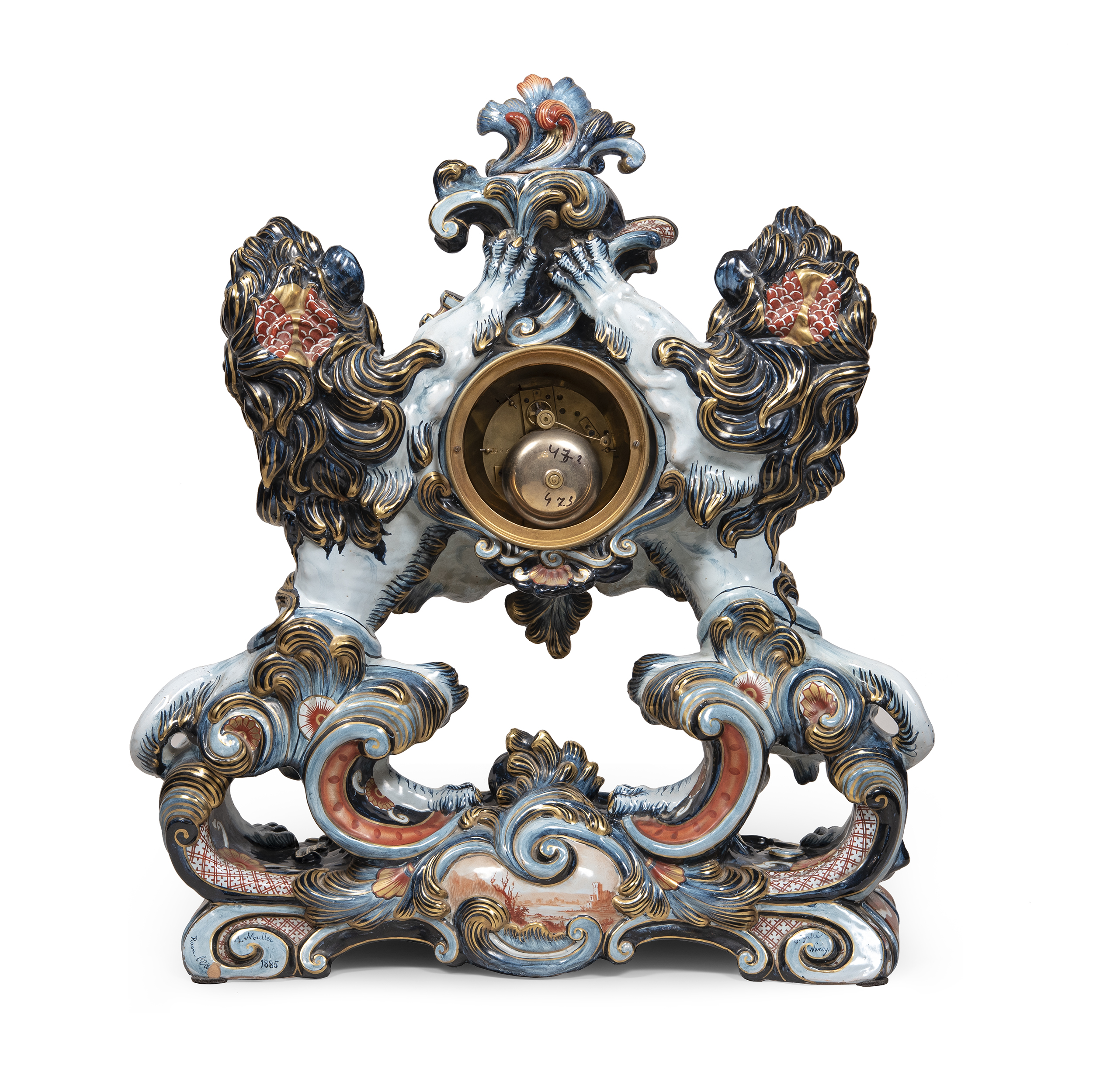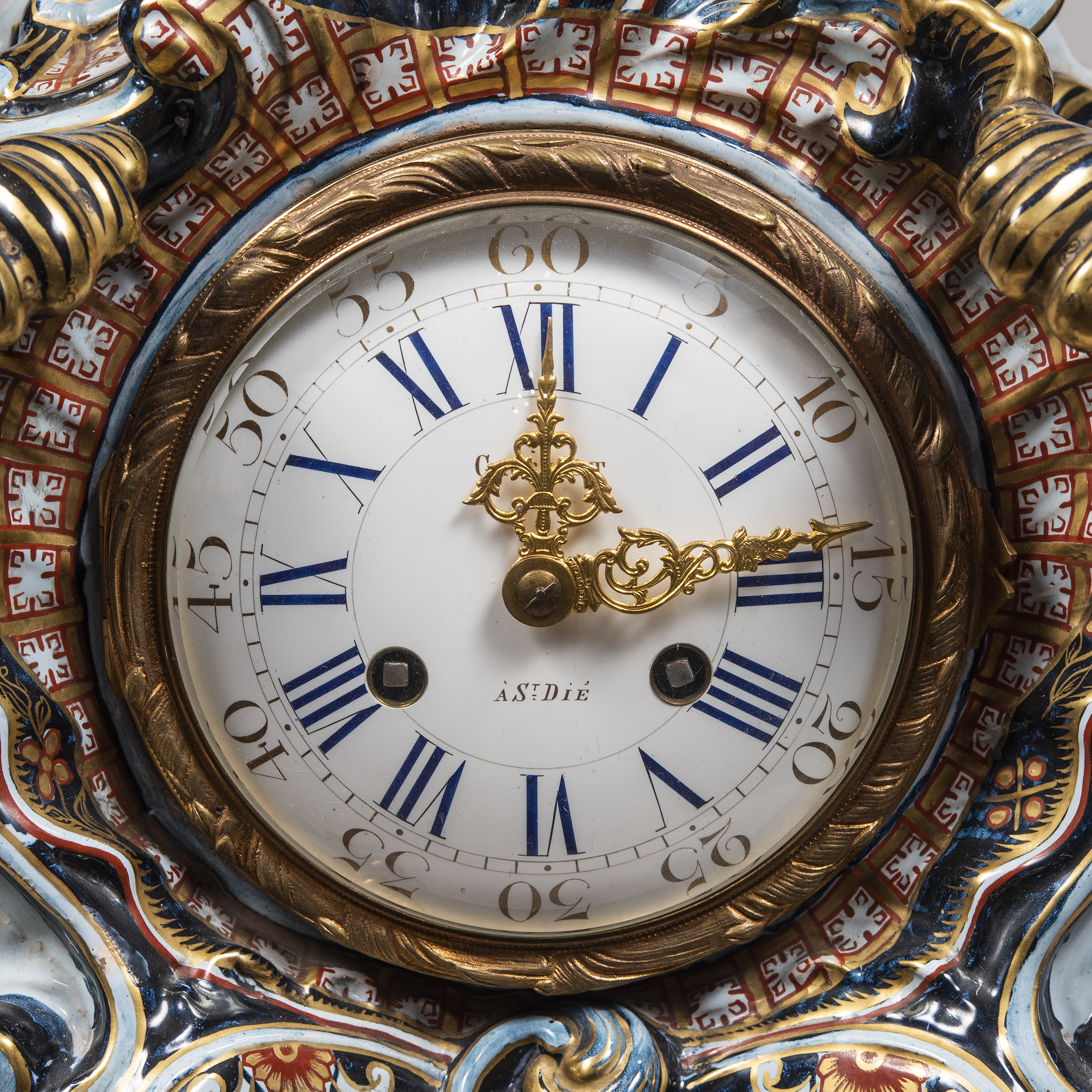 Каминные часы с парой канделябров. Керамика, полихромная роспись, глазурь, подпись на основании канделябров на лицевой стороне «A. Muller/ Raon L.Etape», подпись на завитке постамента часов на задней части «E. Galle Nancy/ Raon L.Etape 1885»; часовой механизм фирмы «GRELOT», эмалевый циферблат с римскими цифрами часов и делением на минуты, фигурные золоченые стрелки, стекло; Франция, Нанси, 1885 год, размер (в/ш/г): 60 х 58 х 23 см, высота канделябра – 49 см.