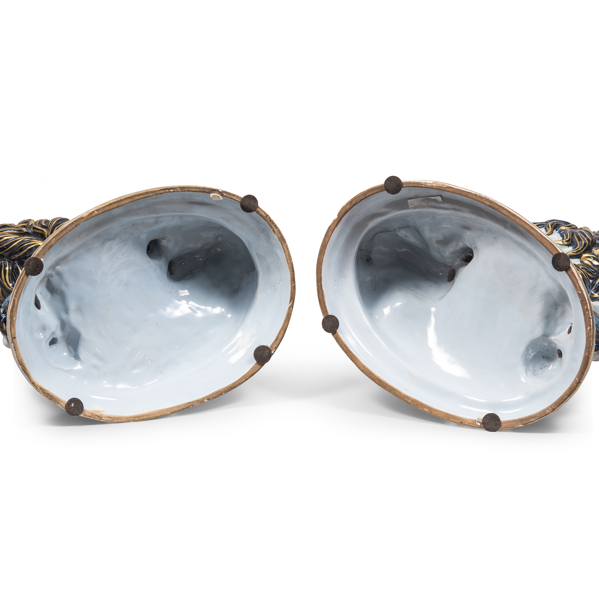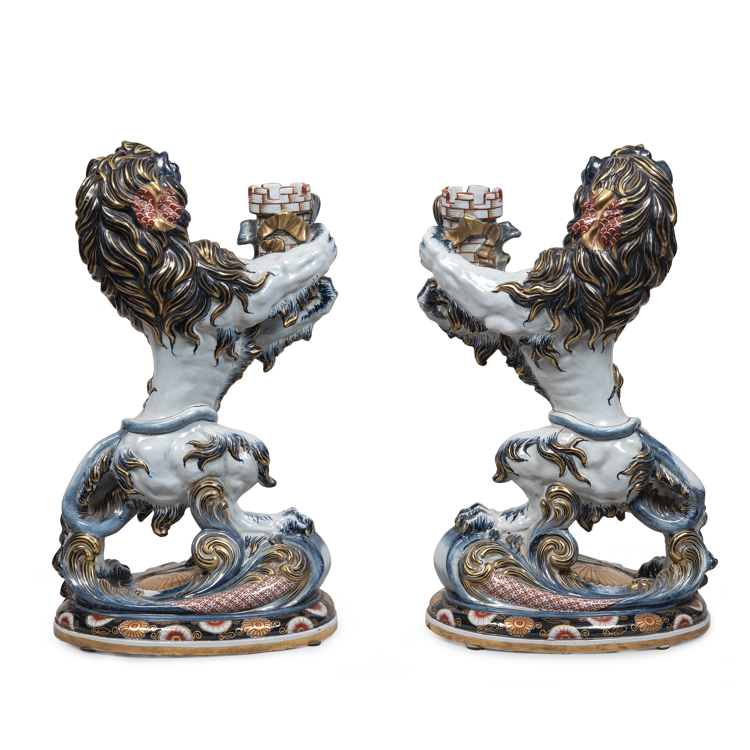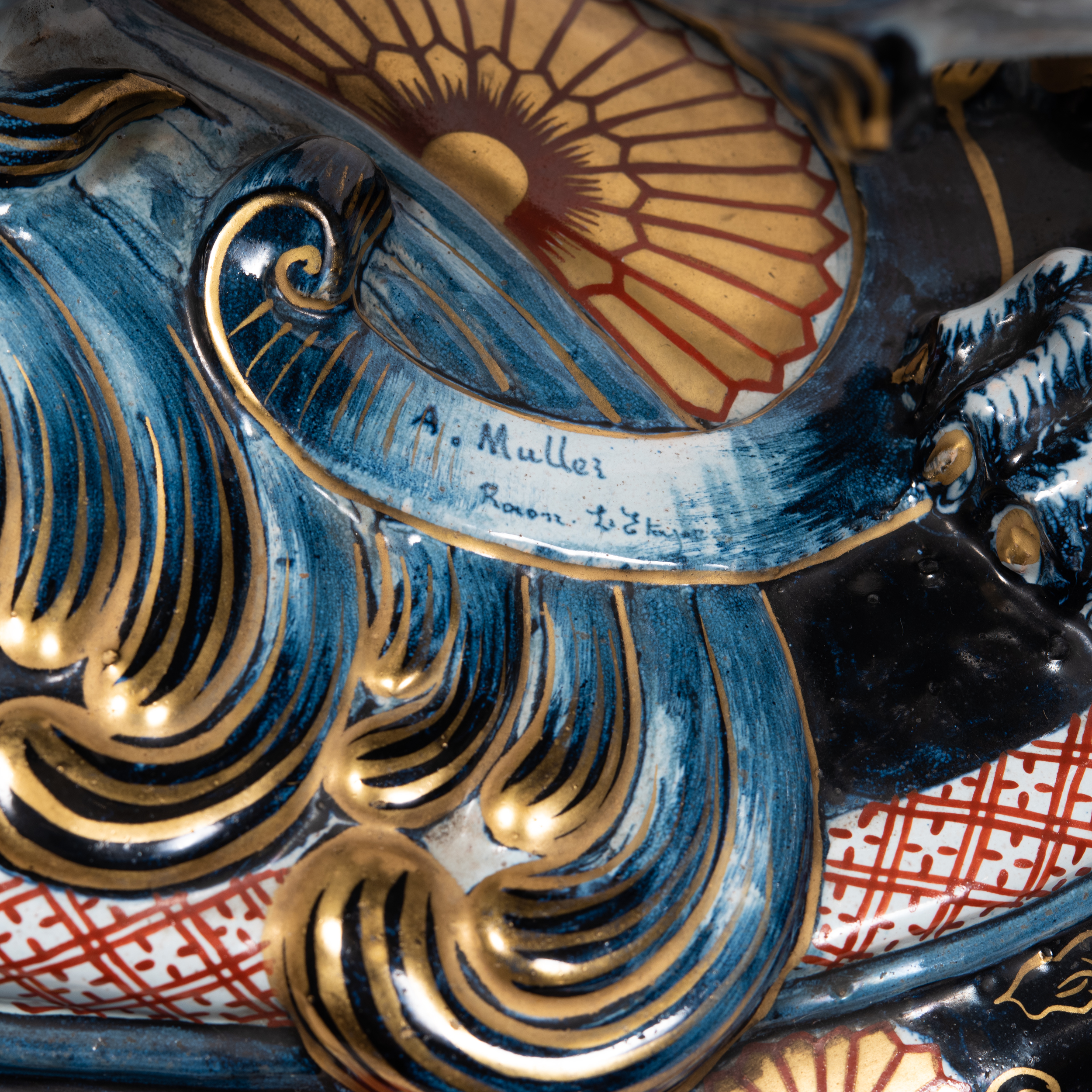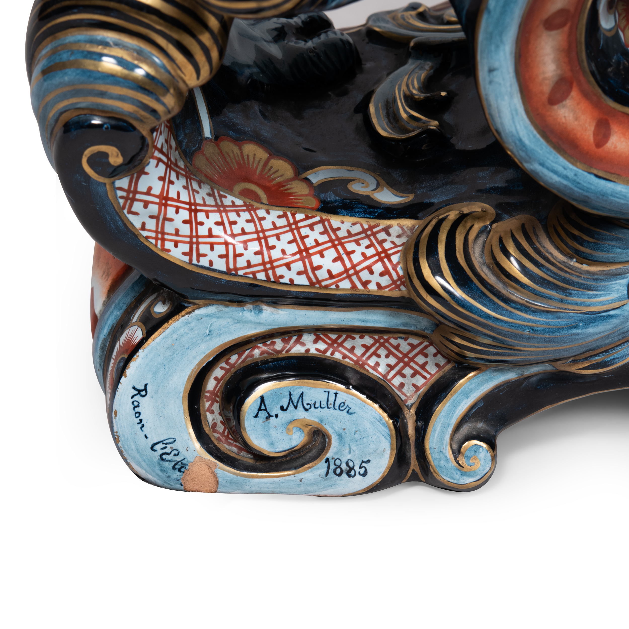 Каминные часы с парой канделябров. Керамика, полихромная роспись, глазурь, подпись на основании канделябров на лицевой стороне «A. Muller/ Raon L.Etape», подпись на завитке постамента часов на задней части «E. Galle Nancy/ Raon L.Etape 1885»; часовой механизм фирмы «GRELOT», эмалевый циферблат с римскими цифрами часов и делением на минуты, фигурные золоченые стрелки, стекло; Франция, Нанси, 1885 год, размер (в/ш/г): 60 х 58 х 23 см, высота канделябра – 49 см.