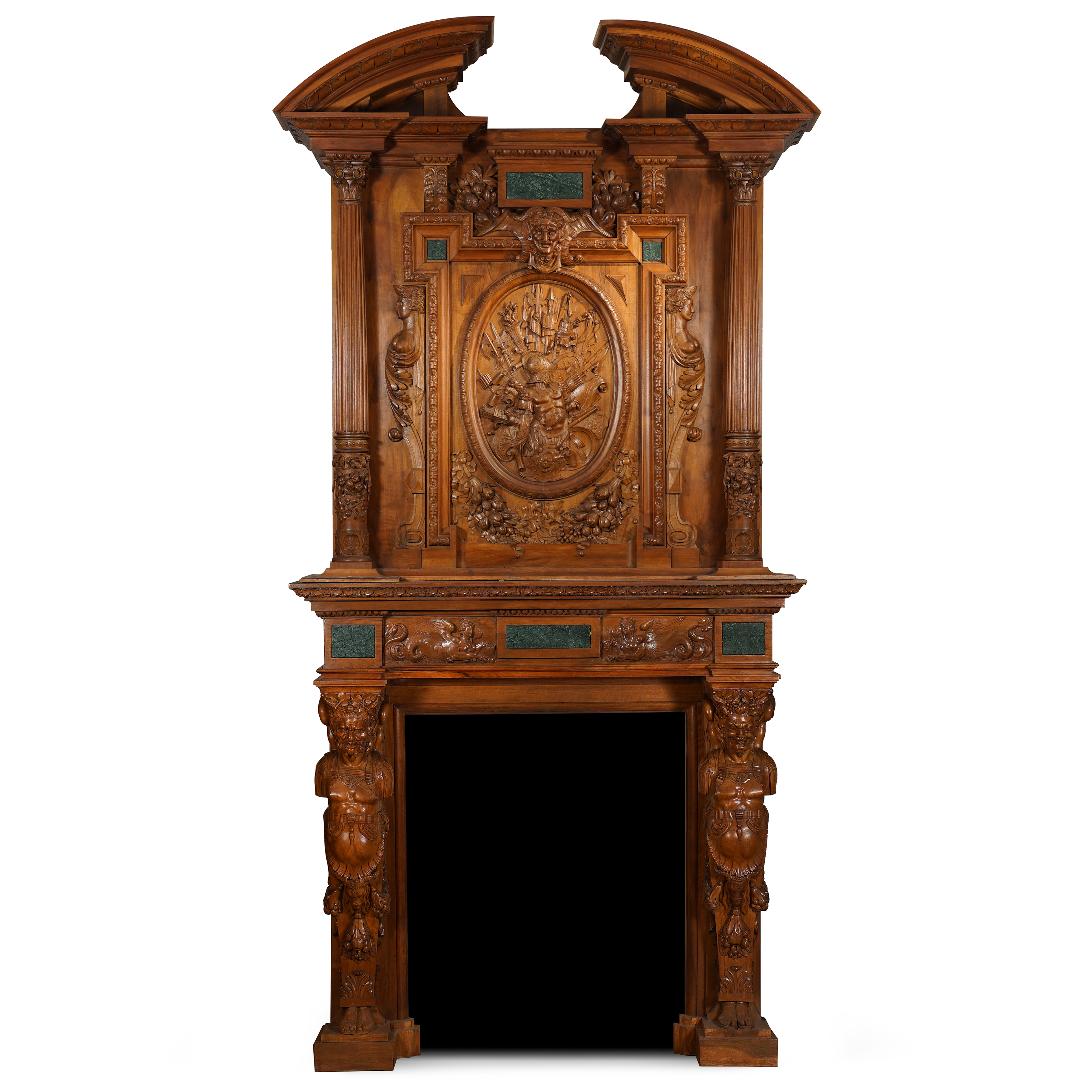 Дуб (основа), орех, скульптурная и орнаментальная резьба, вставки из змеевика.