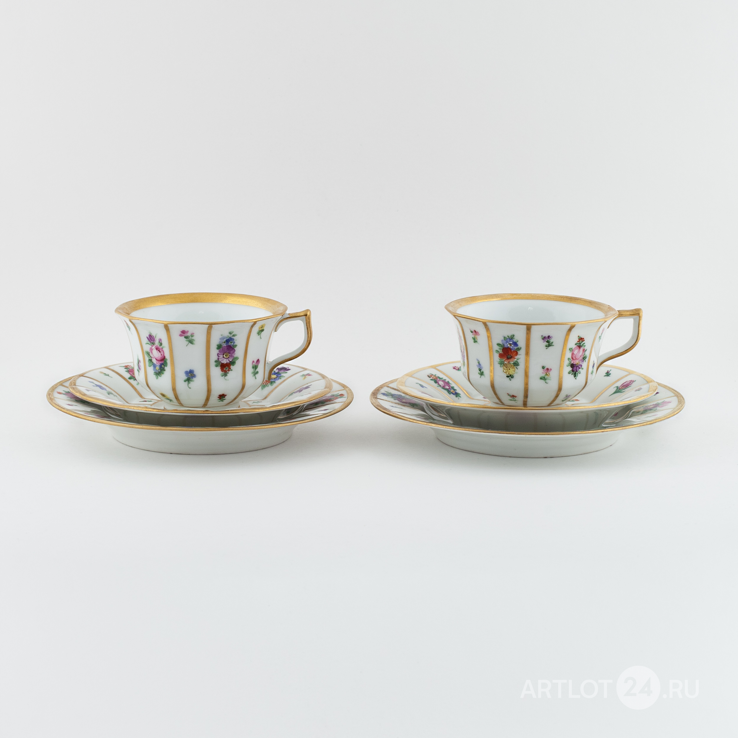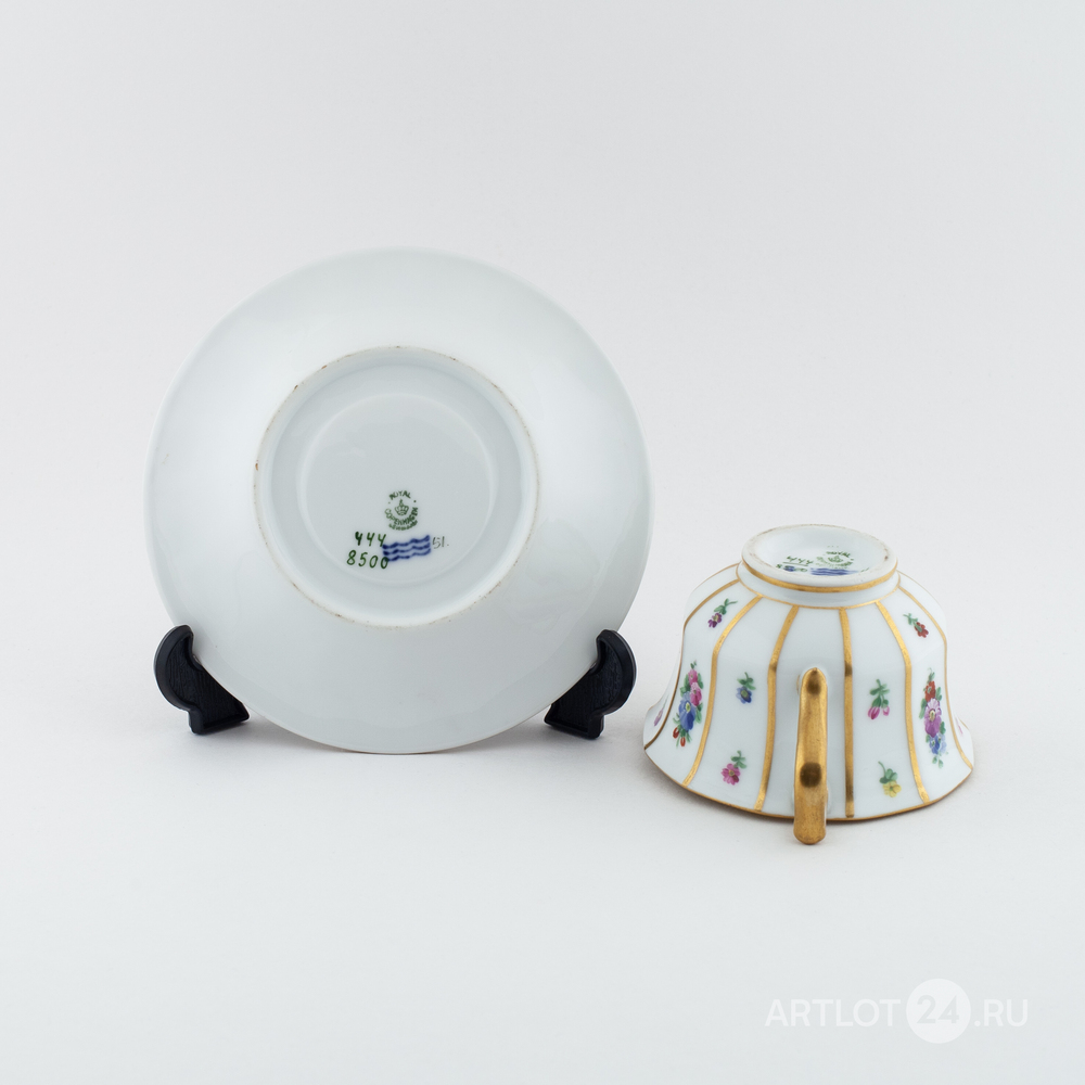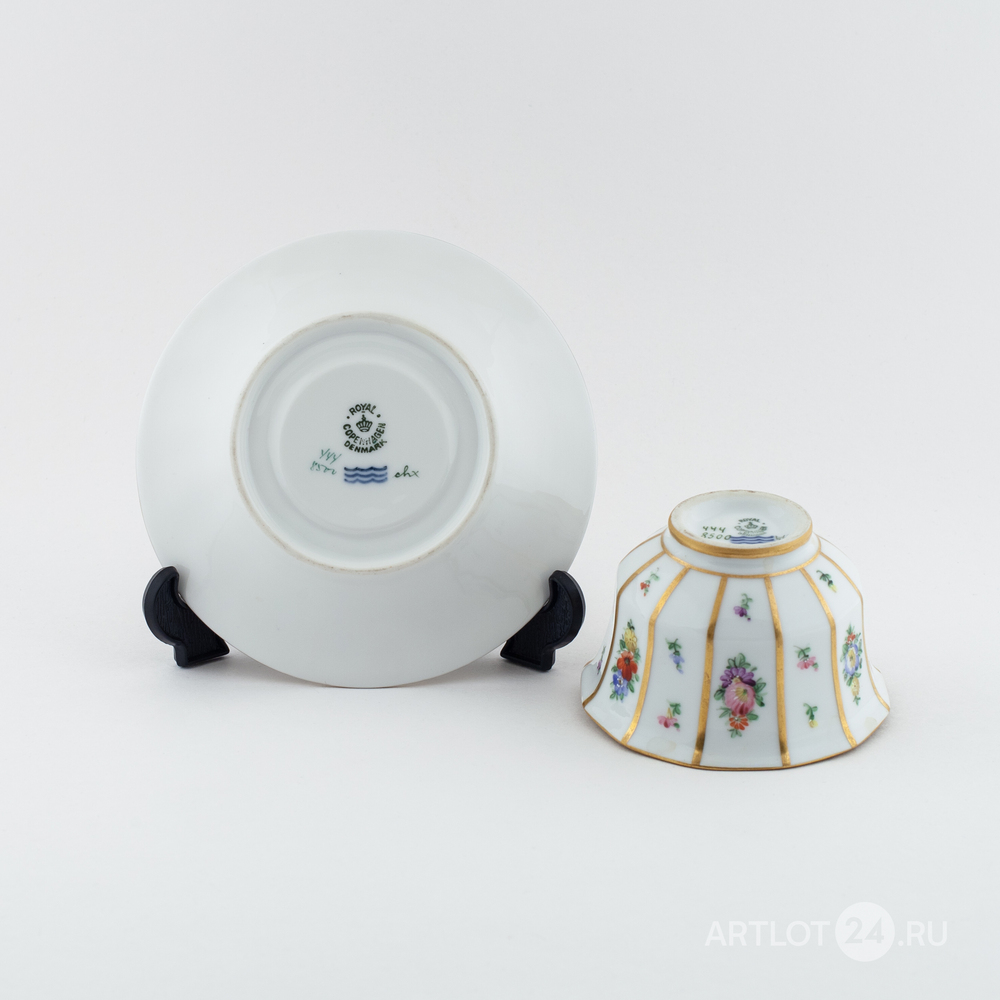 Фарфор, надглазурная полихромная роспись, золочение, Датская Королевская фарфоровая мануфактура (Royal Copenhagen), 1952 год, высота чашки – 5,8 см, диаметр – 9,6 см, диаметр блюдца – 14,8 см, диаметр пирожковой тарелки – 18 см.