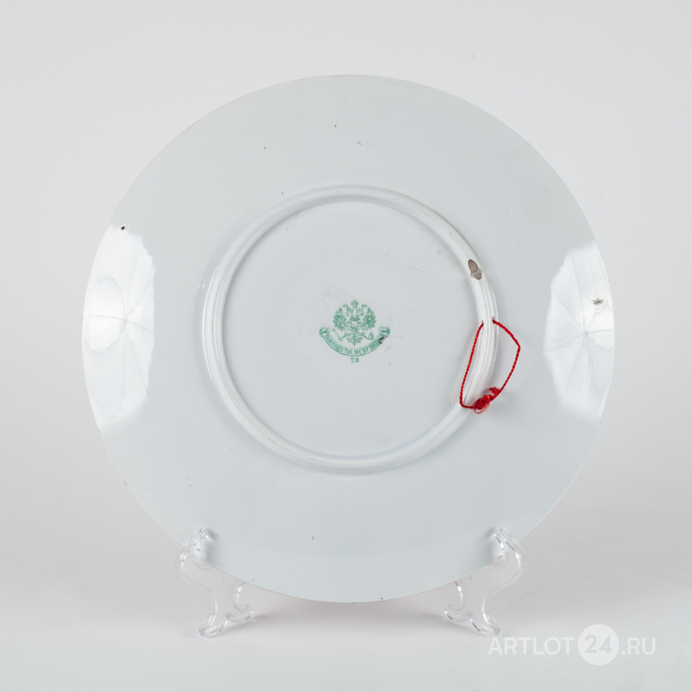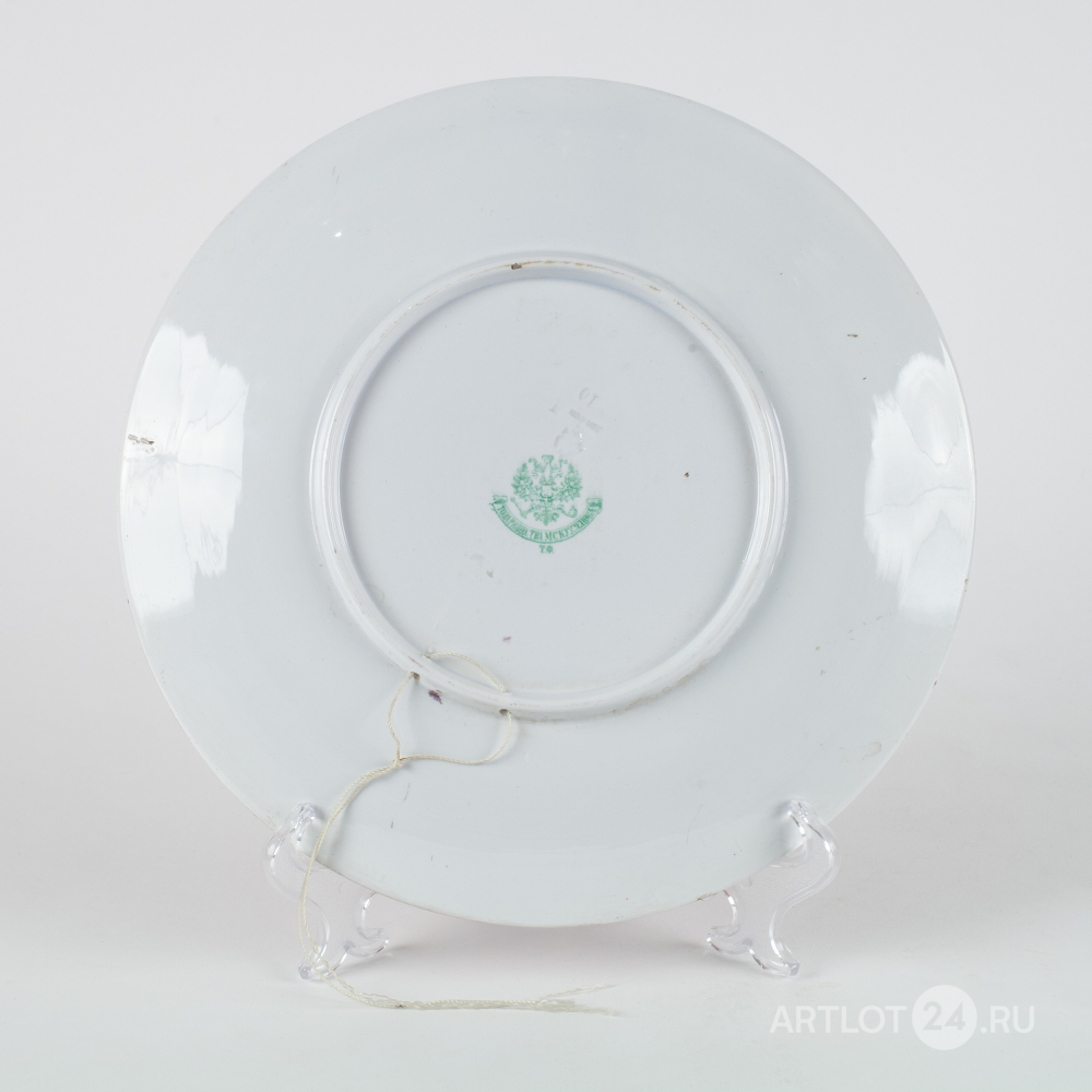 Фаянс, монохромное крытье, полихромная деколь, подрисовка, золочение, клеймо зеленое печатное Тверской фабрики т-ва М.С. Кузнецова, на одной из тарелок клеймо в тесте, Российская Империя, 1889-1900 годы, диаметр – 25,5 см