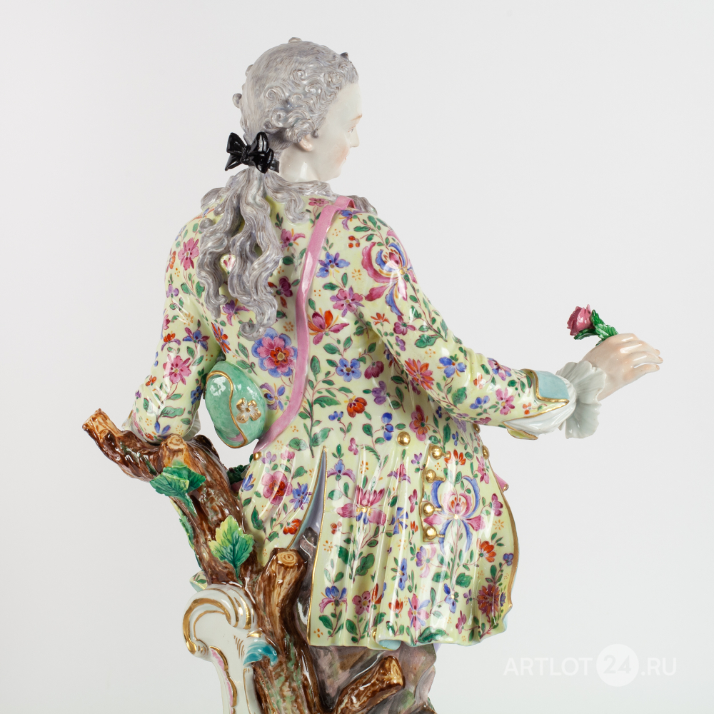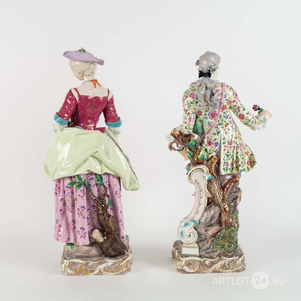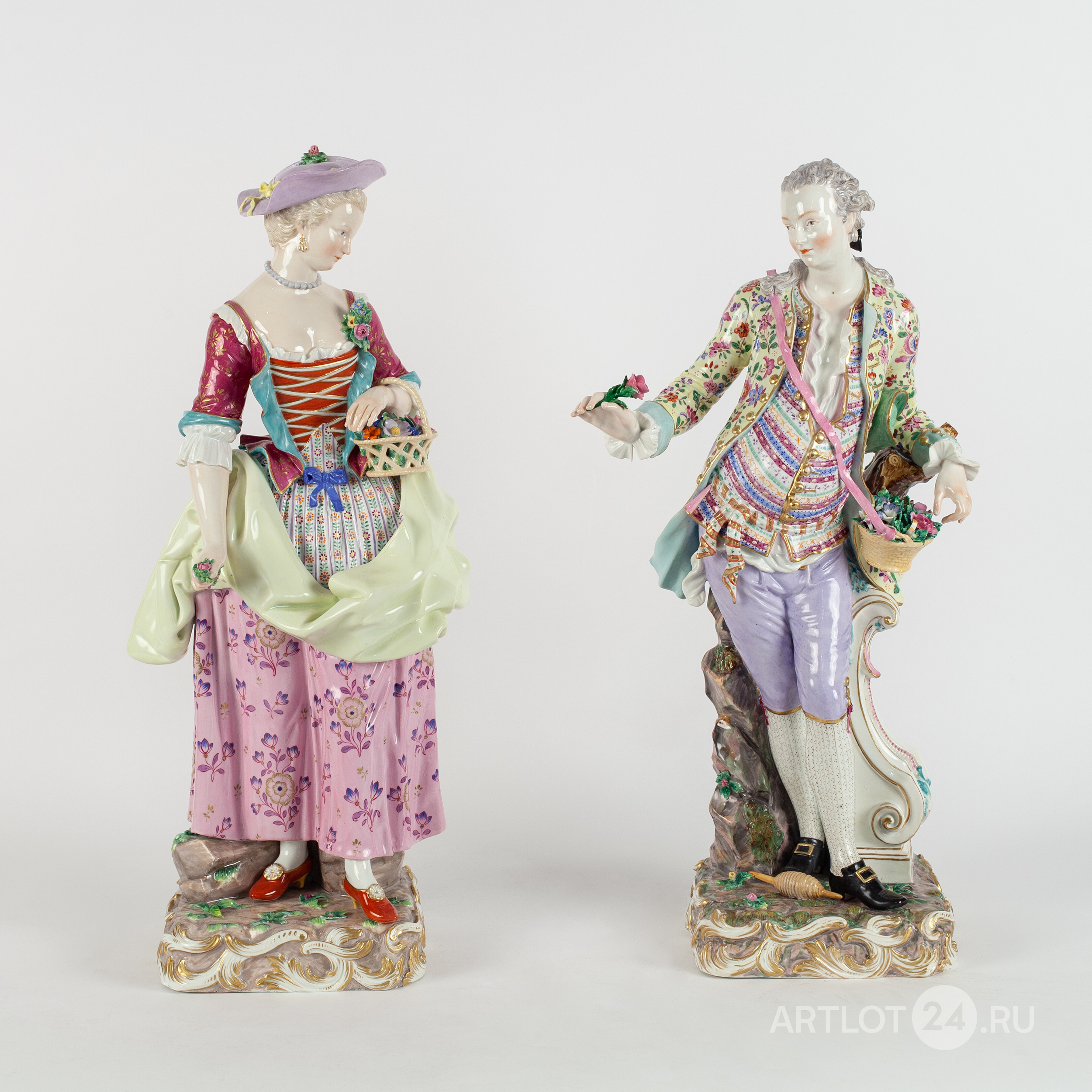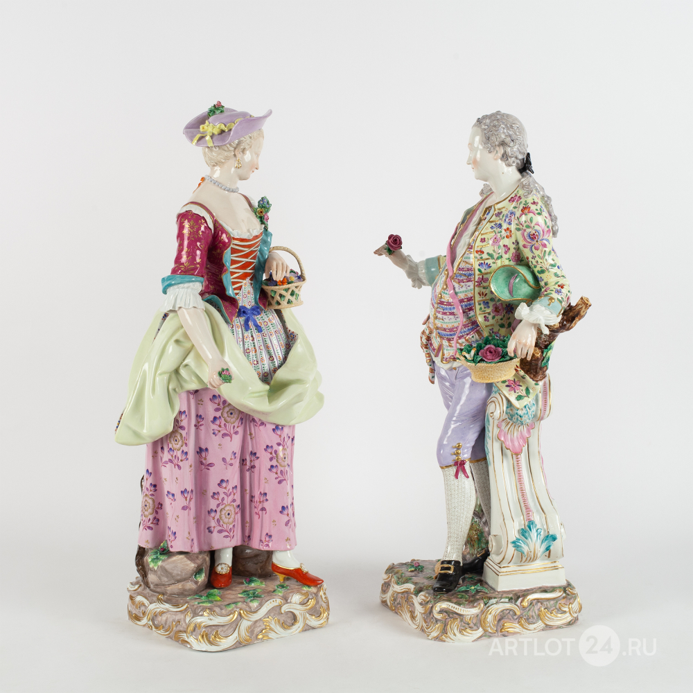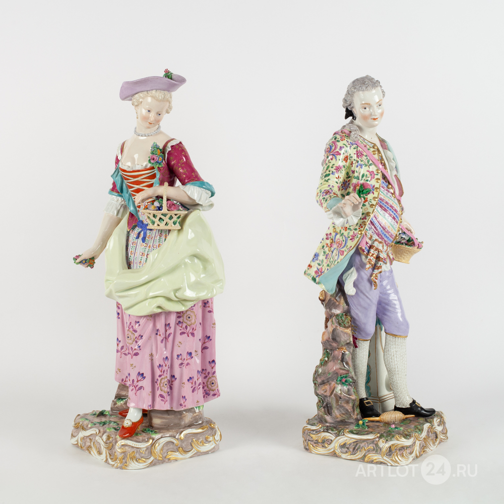 Выполнены по моделям «Садовник» и «Жена садовника» 1767 года немецкого скульптора Иоганна Карла Шёнхайта (Johann Carl Schönheit, 1730-1805), ученика И.И. Кендлера, работавшего на мануфактуре с 1745 по 1794 год. Фарфор, лепка, надглазурная полихромная роспись, золочение, в основании подглазурные клейма кобальтом в виде скрещенных мечей, а также «B65» в тесте от руки на одной фигуре и «2868» на другой, фарфоровая мануфактура Мейсен, последняя четверть XIX века, высота – 49 см, основания фигур: 15,5 х 15,5 см