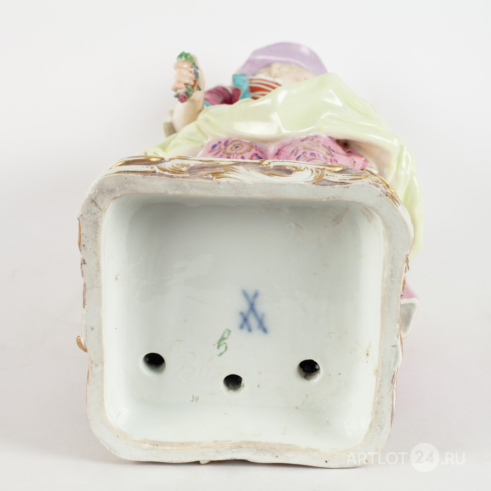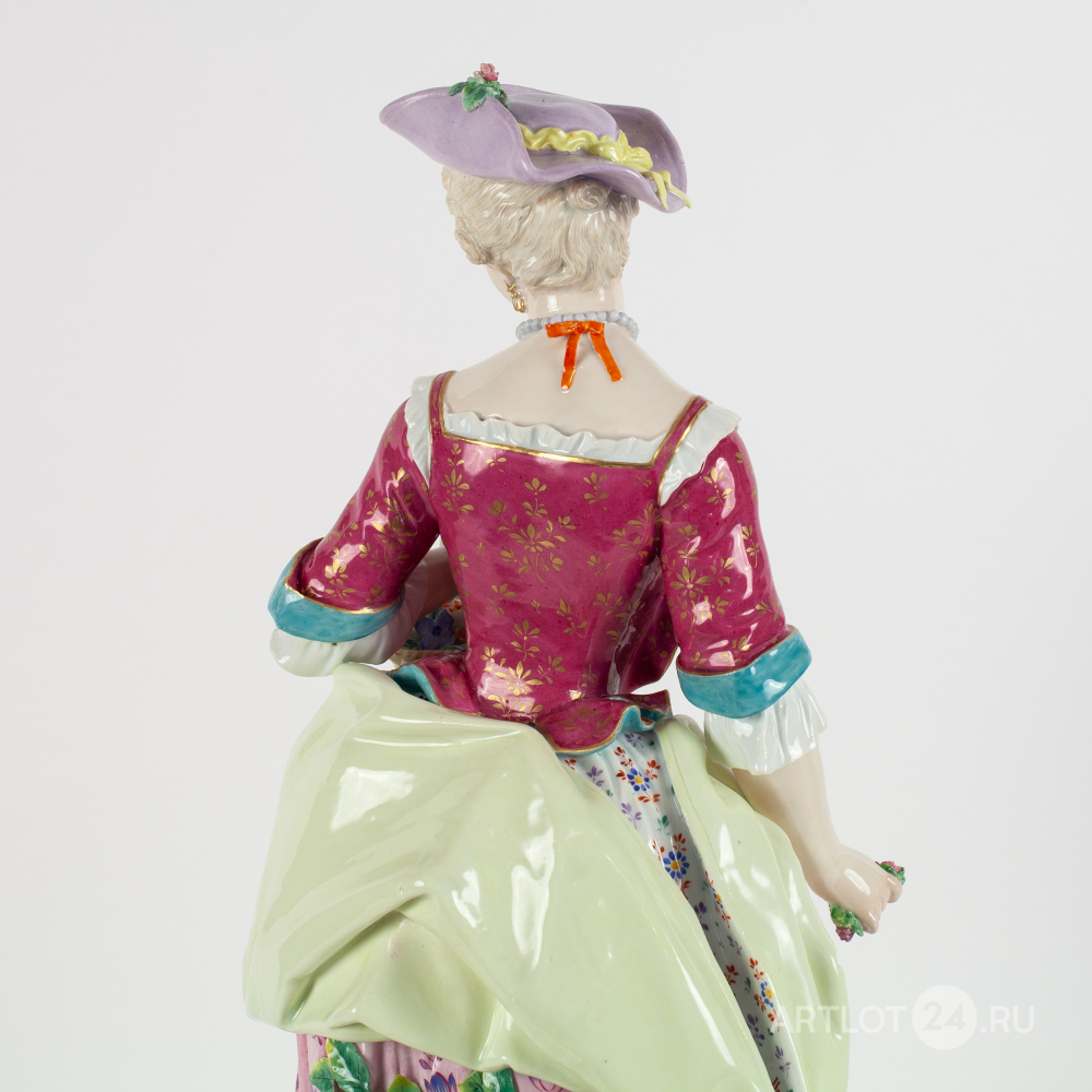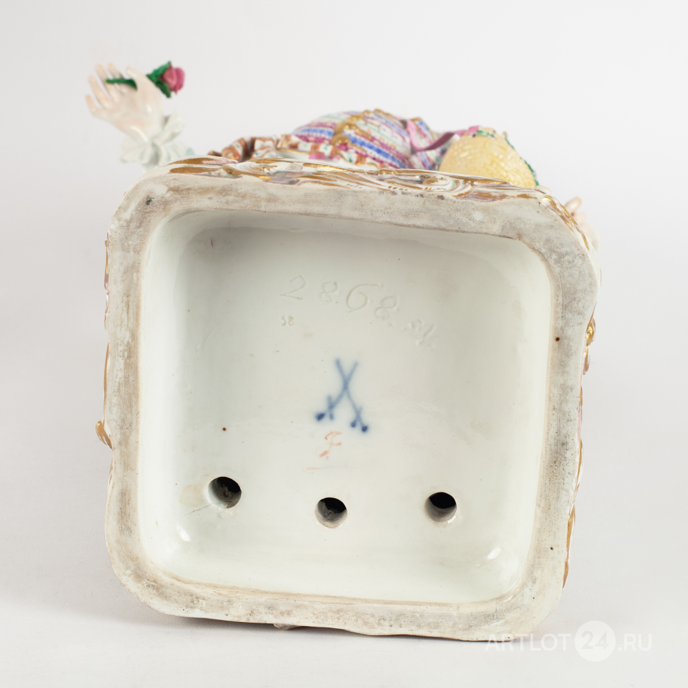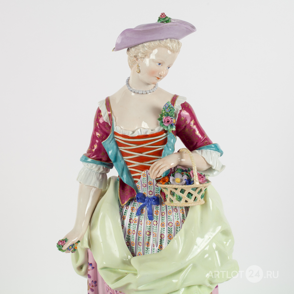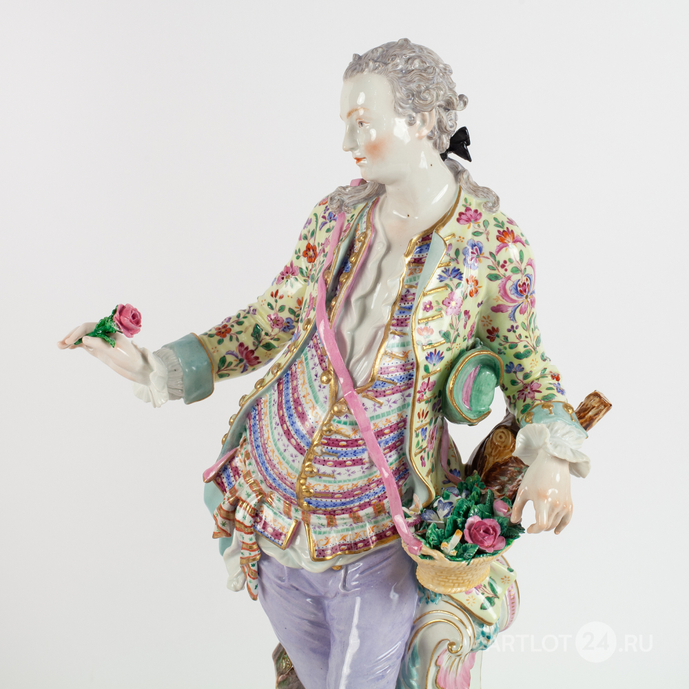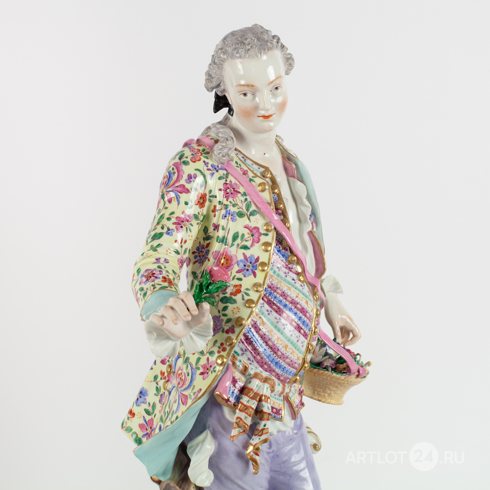 Выполнены по моделям «Садовник» и «Жена садовника» 1767 года немецкого скульптора Иоганна Карла Шёнхайта (Johann Carl Schönheit, 1730-1805), ученика И.И. Кендлера, работавшего на мануфактуре с 1745 по 1794 год. Фарфор, лепка, надглазурная полихромная роспись, золочение, в основании подглазурные клейма кобальтом в виде скрещенных мечей, а также «B65» в тесте от руки на одной фигуре и «2868» на другой, фарфоровая мануфактура Мейсен, последняя четверть XIX века, высота – 49 см, основания фигур: 15,5 х 15,5 см