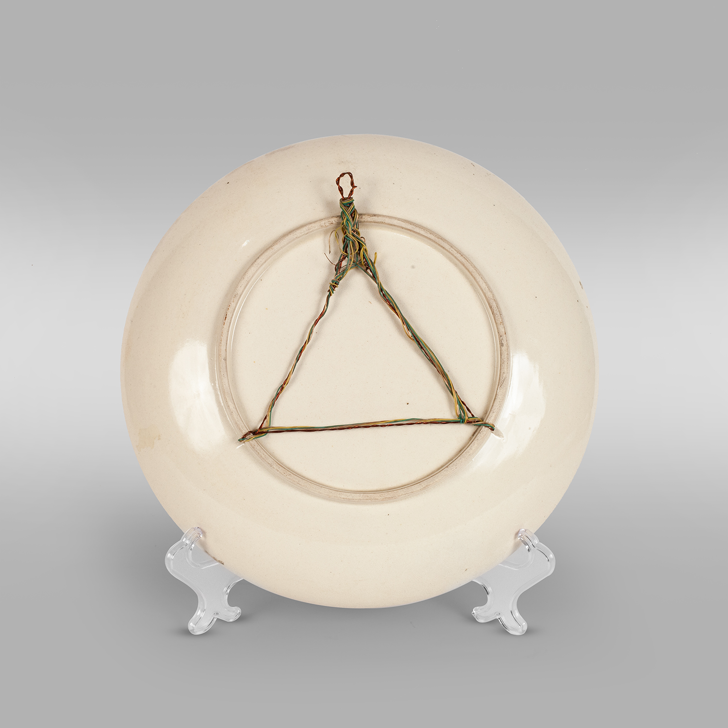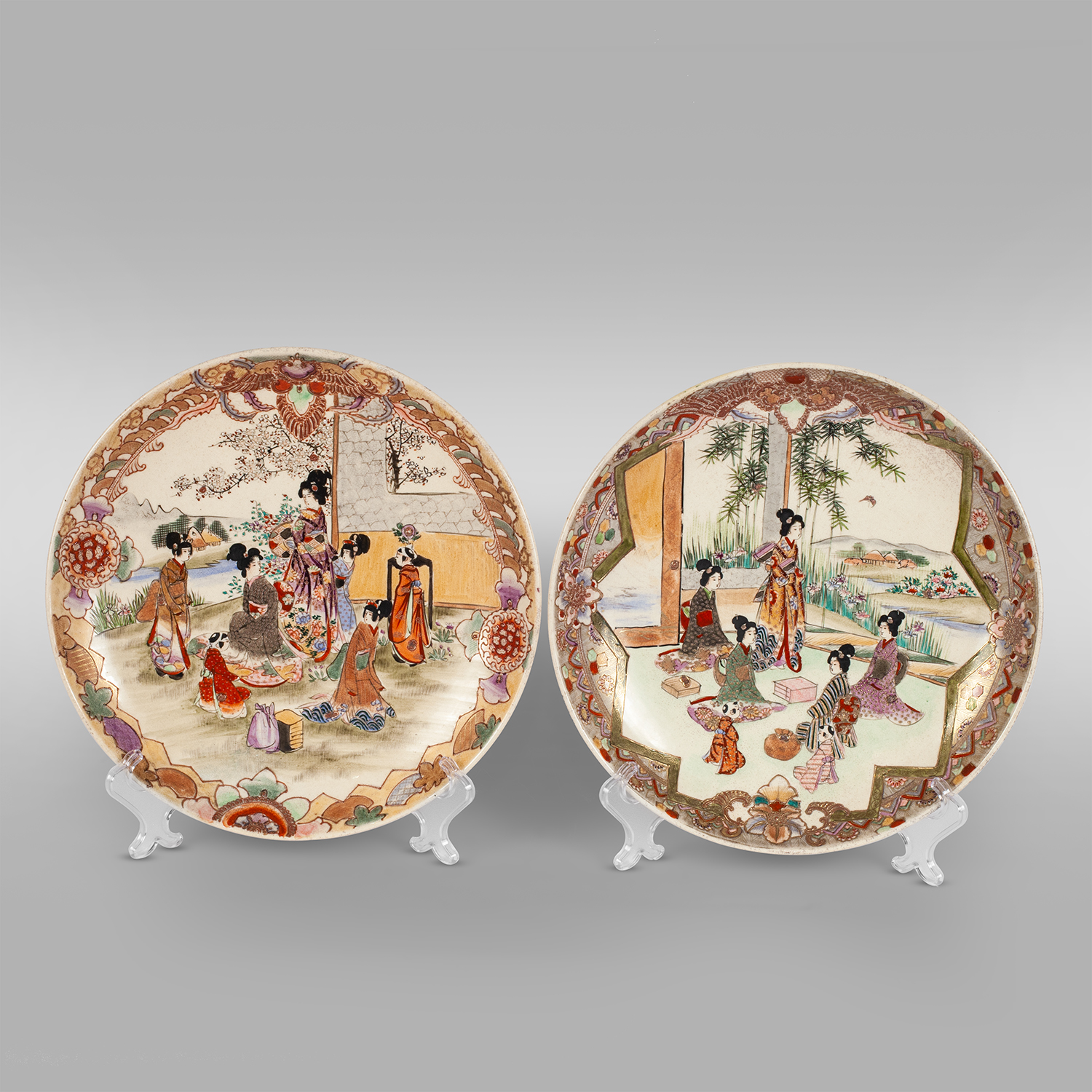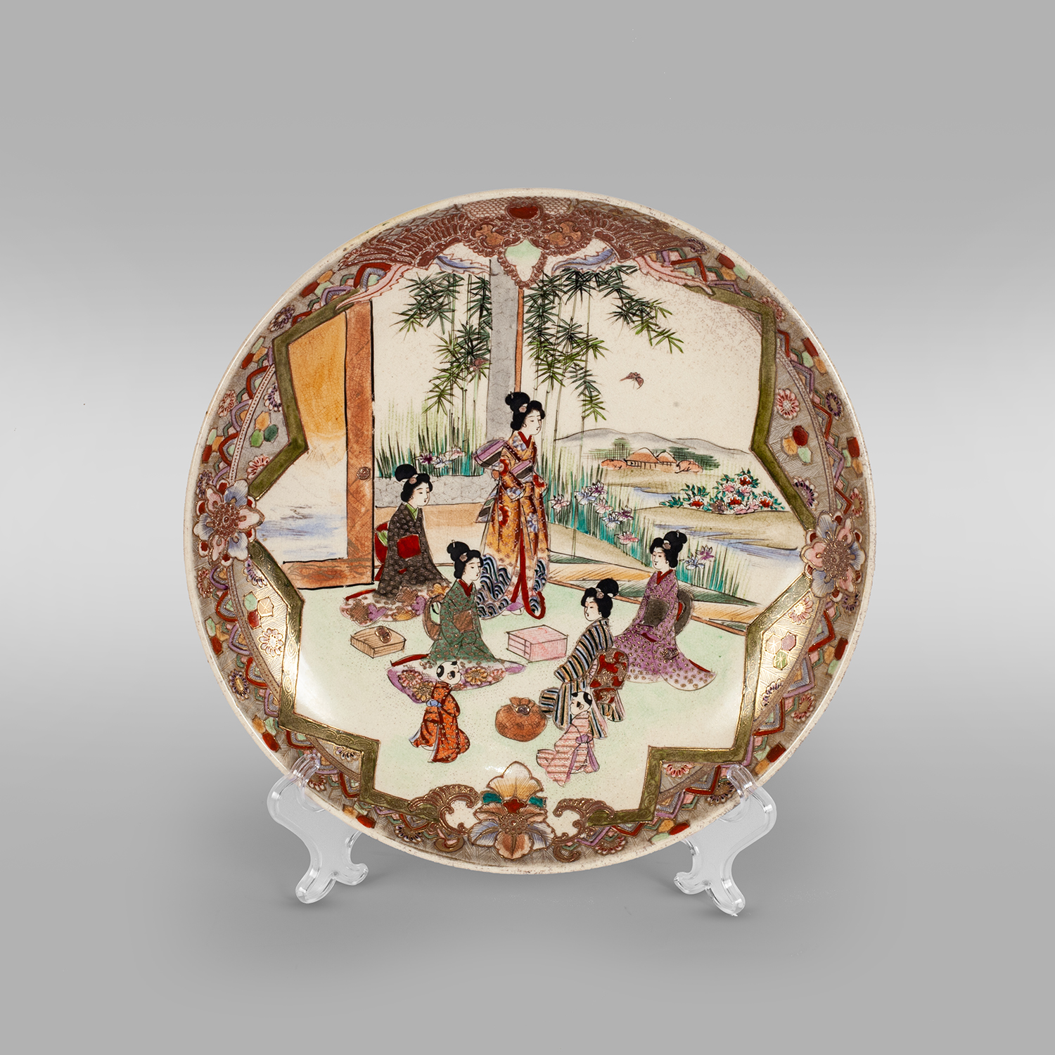 «Сцены из жизни японской знати». Декоративное блюдо выполнено в традиционной для мастерских Кутани цветовой гамме с сюжетными композициями.