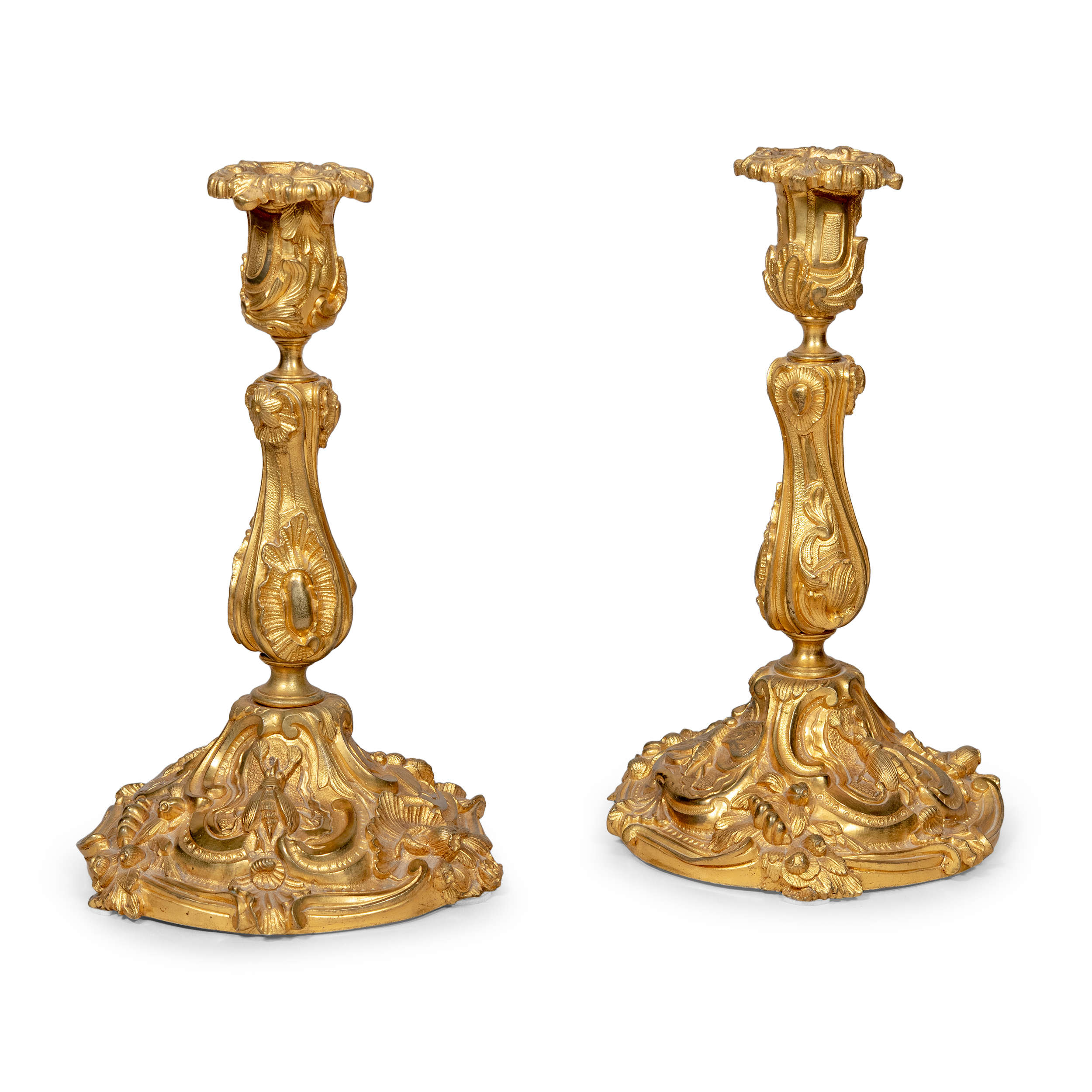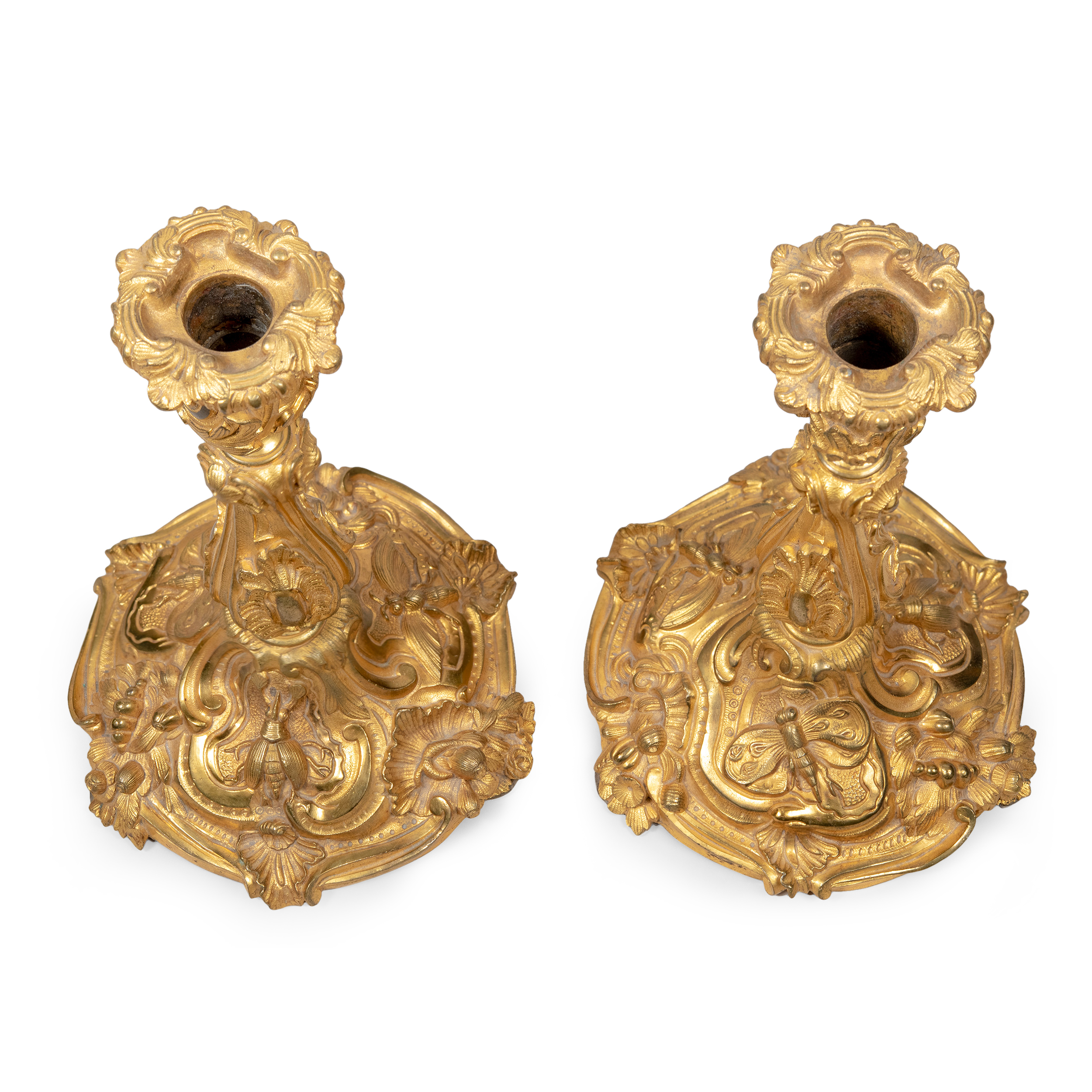 Комплект подсвечников с рельефными изображениями жуков и бабочек выполнен в манере французского архитектора-декоратора, скульптора и ювелира стиля рококо Ж. О. Мейссонье (Juste-Aurèle Meissonnier, 1695 -1750). Бронза, литье, золочение, размеры: 27 х 14 х 17 см.