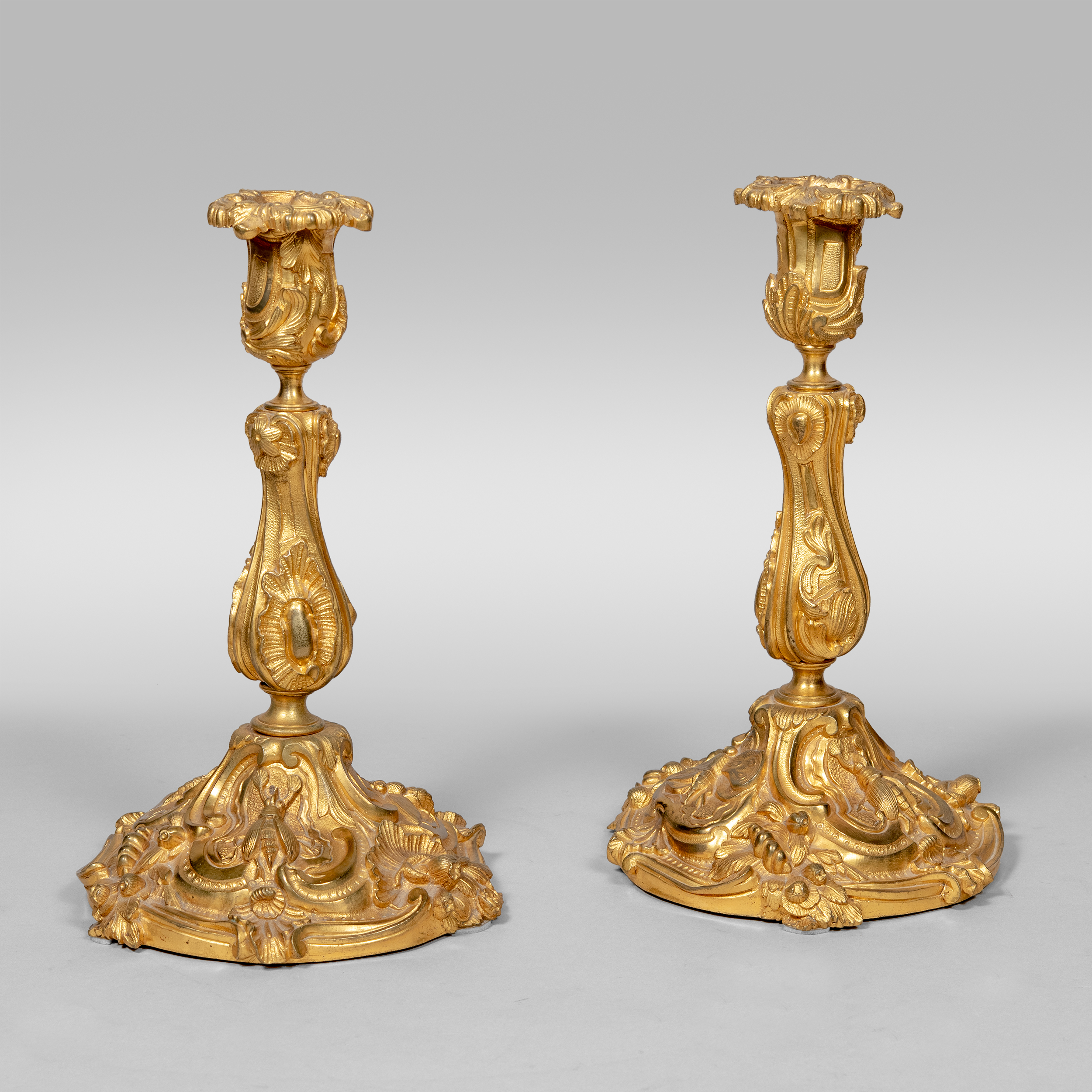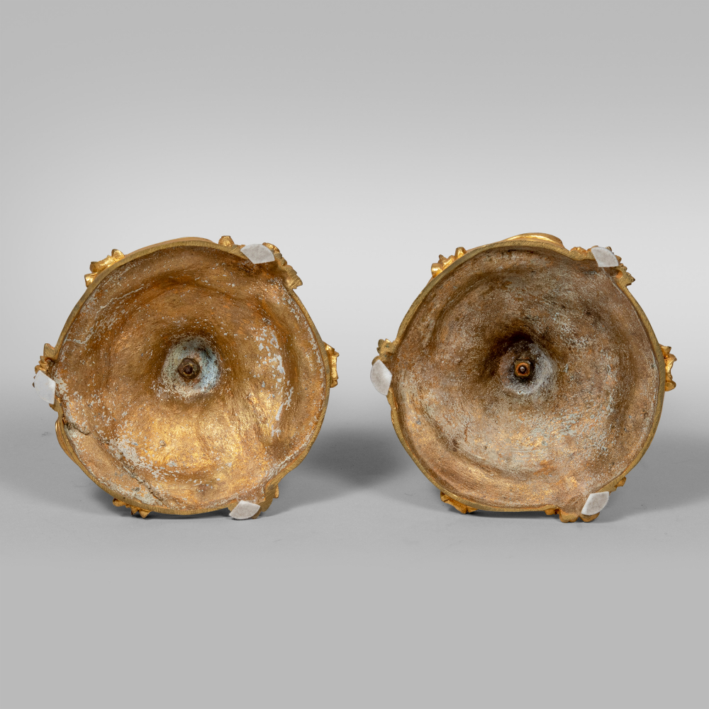 Комплект подсвечников с рельефными изображениями жуков и бабочек выполнен в манере французского архитектора-декоратора, скульптора и ювелира стиля рококо Ж. О. Мейссонье (Juste-Aurèle Meissonnier, 1695 -1750). Бронза, литье, золочение, размеры: 27 х 14 х 17 см.