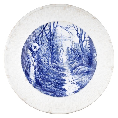 Фарфор, лепной рельефный декор, надглазурная полихромная роспись, золочение, надглазурная марка красным «АМ.».