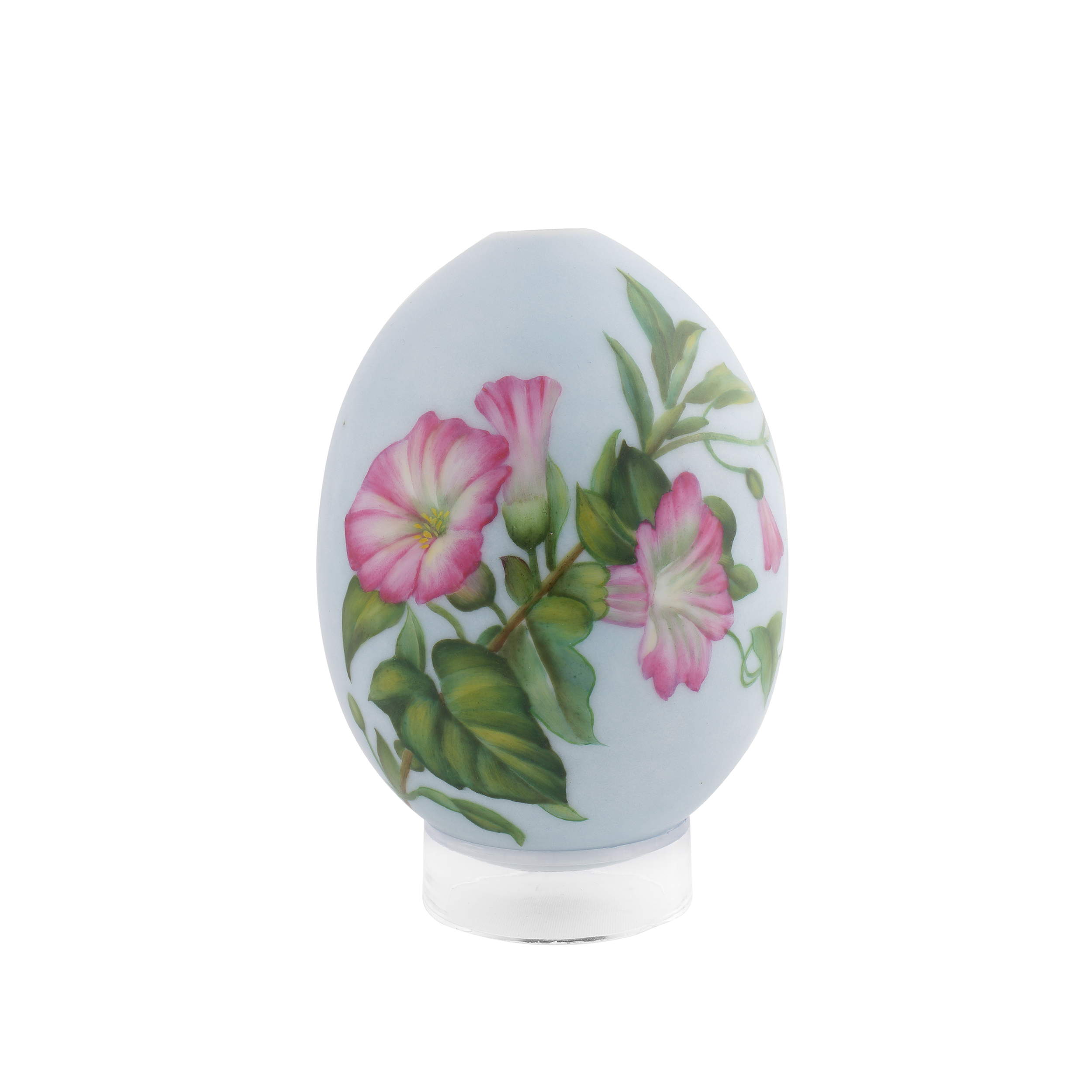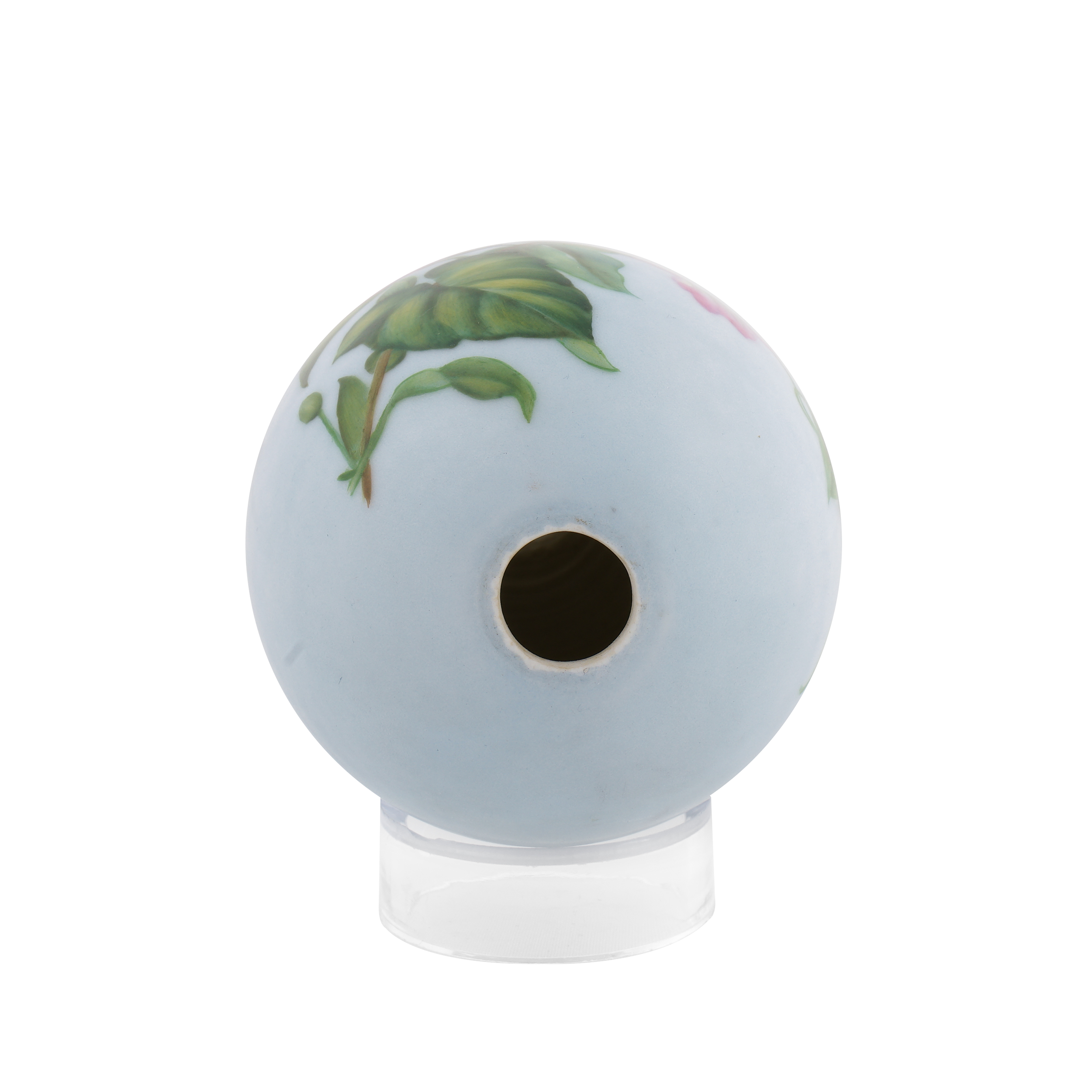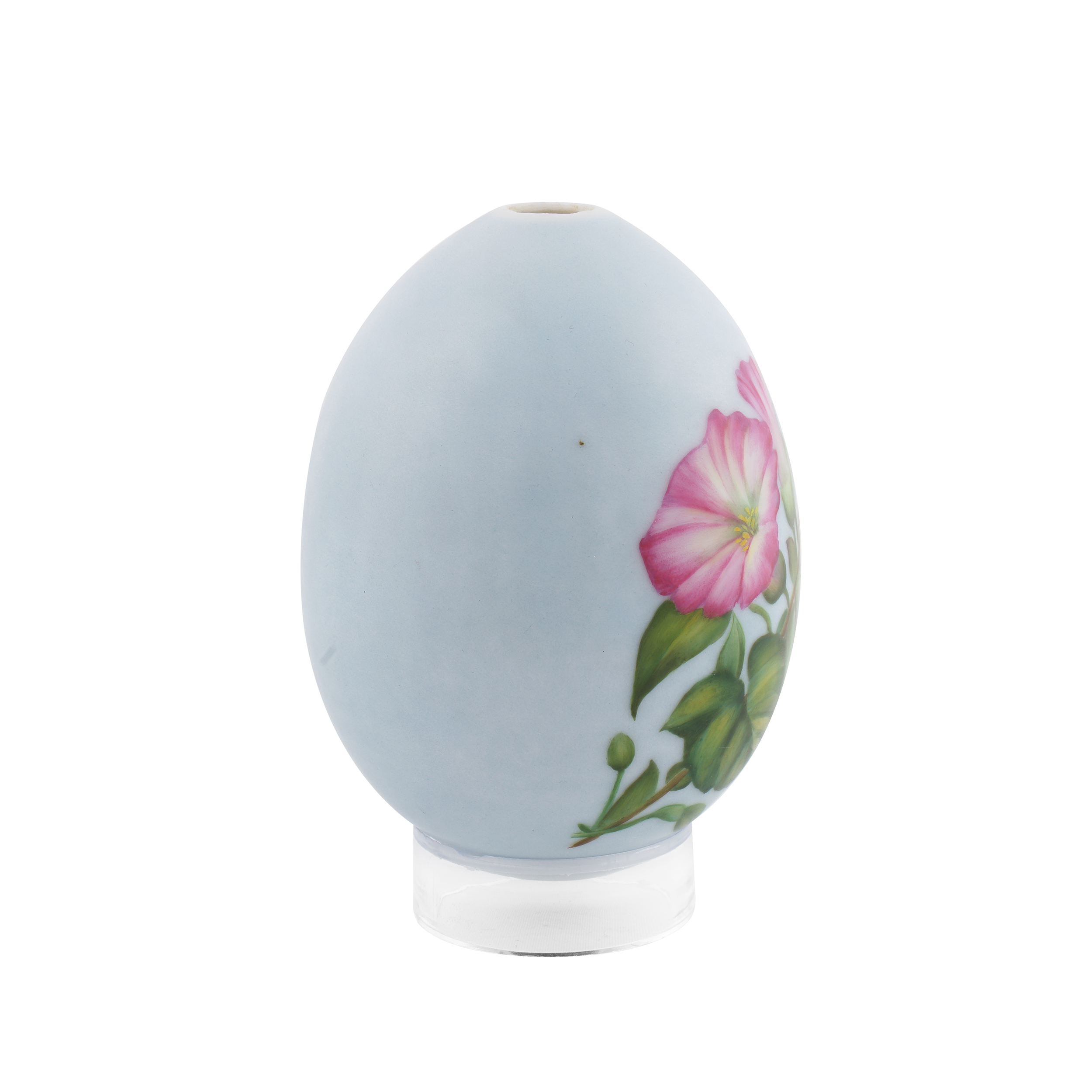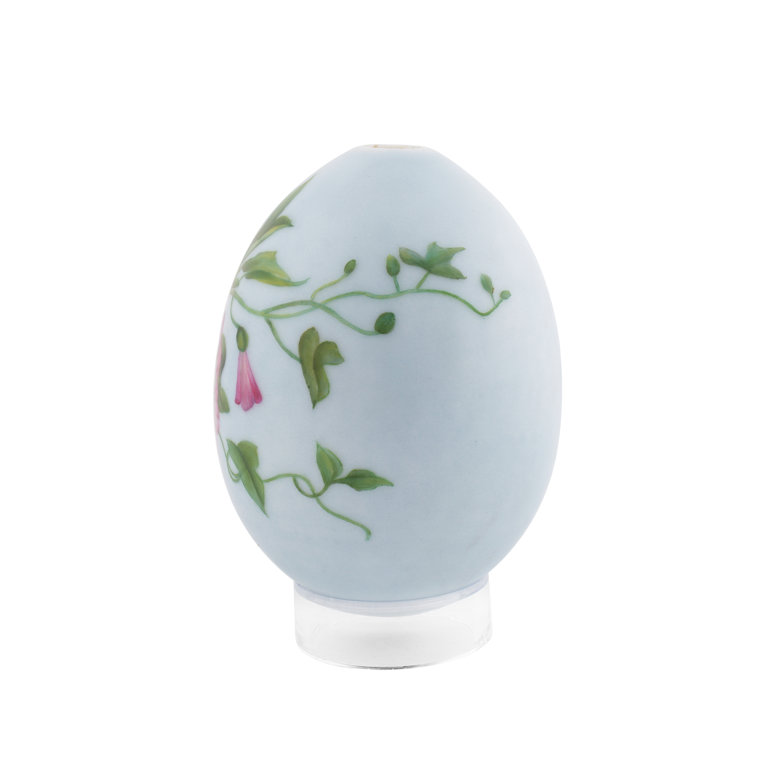 Фарфор, светло-голубое монохромное крытье, полихромная надглазурная роспись; высота – 10,3 см.