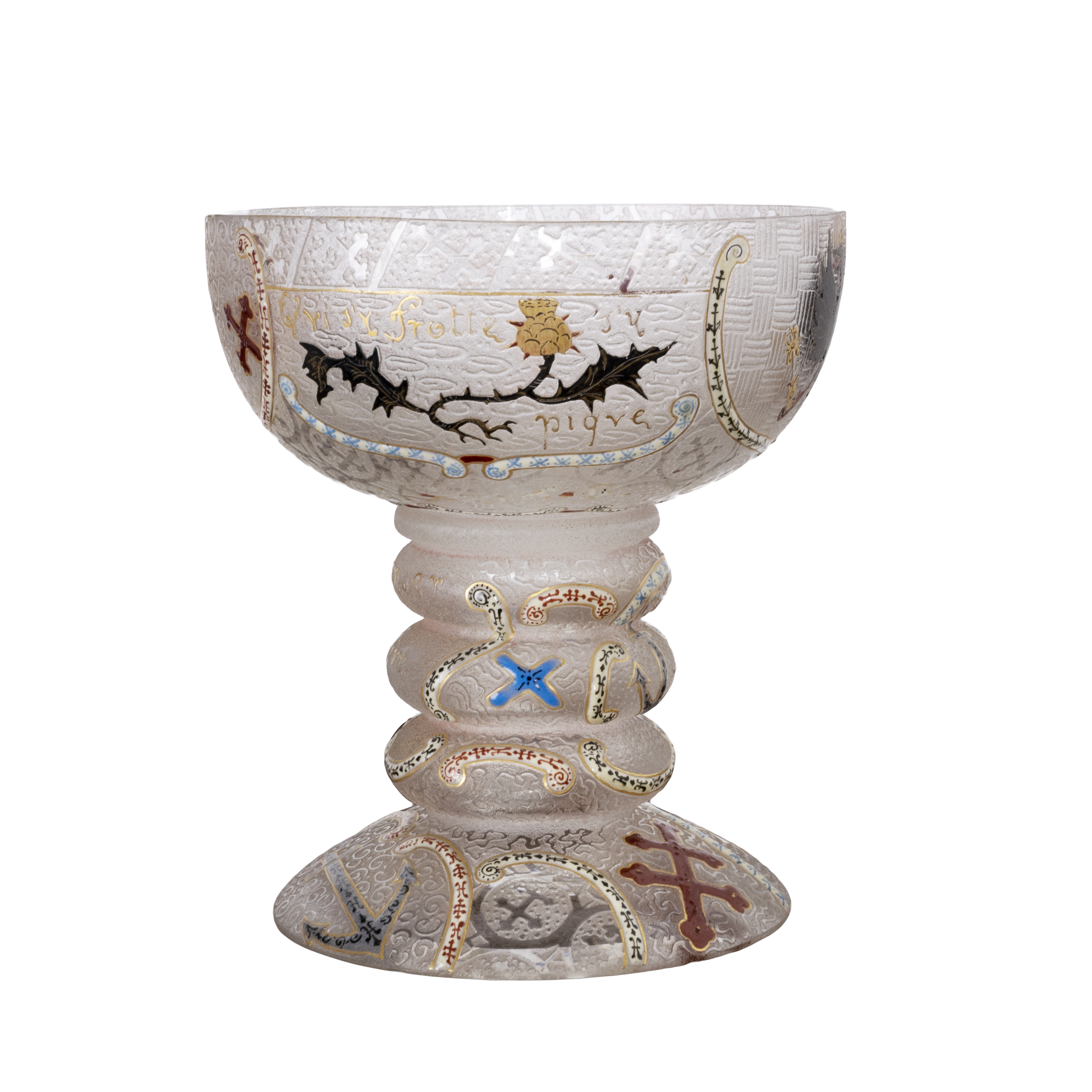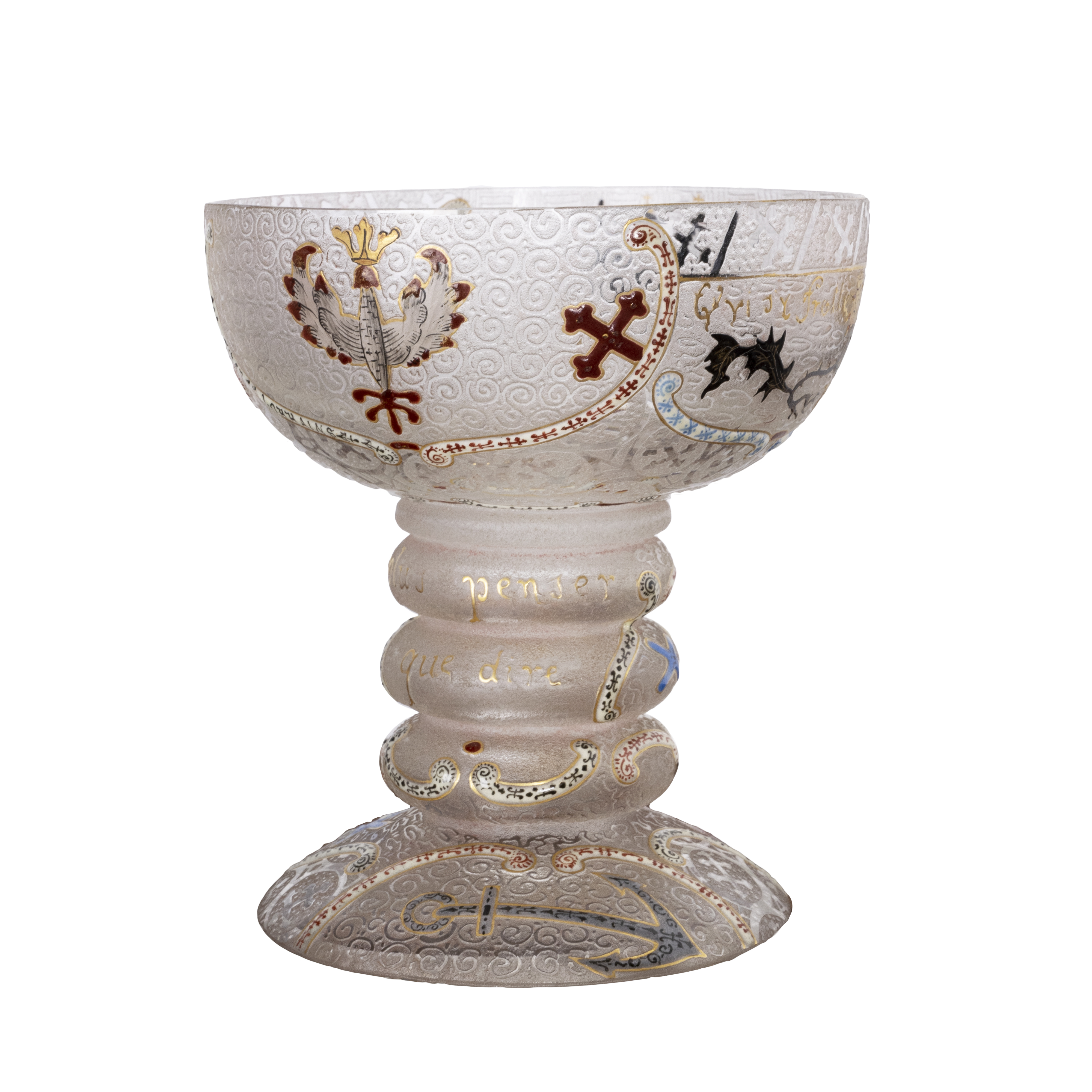 Выдувание в форму, травление, химическое матирование, полировка, гравировка, роспись эмалями, золочение. Высота - 10,6 см, диаметр по борту - 9,3 см, диаметр тулова - 7,7см. Марка: на дне ближе к центру надпись, выполненная красной эмалью: «Daum Nancy», разделённая лотарингским крестом.