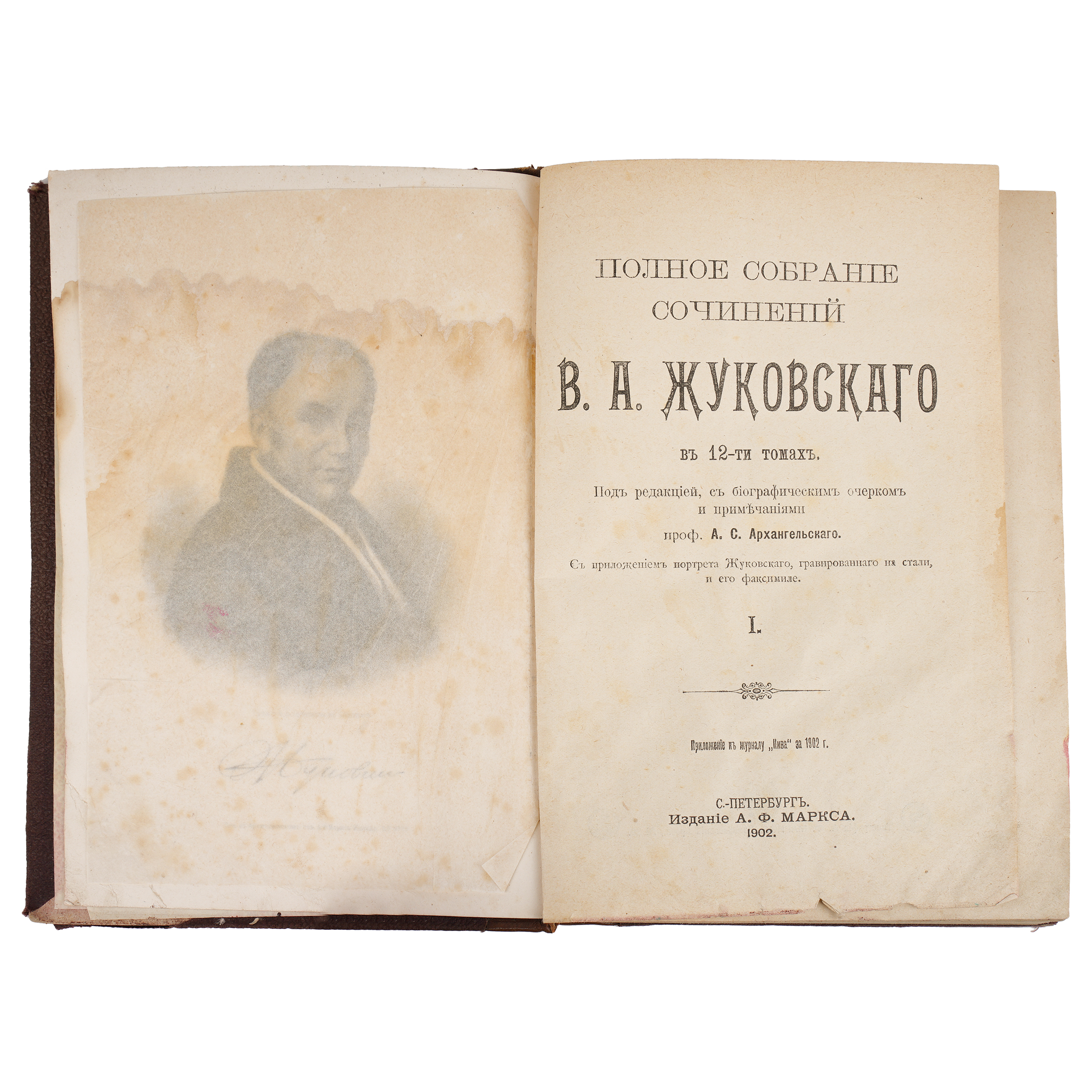 Комплект в трех переплётах. С приложением портрета Жуковского, гравированного на стали (грав. у Ф.А. Брокгауза в Лейпциге), и его факсимиле. Санкт-Петербург, издание А.Ф. Маркса, 1902 год. Под редакцией, с биографическим очерком и примечаниями профессора истории русской литературы, член-корреспондента Императорской академии наук А.С.Архангельского.