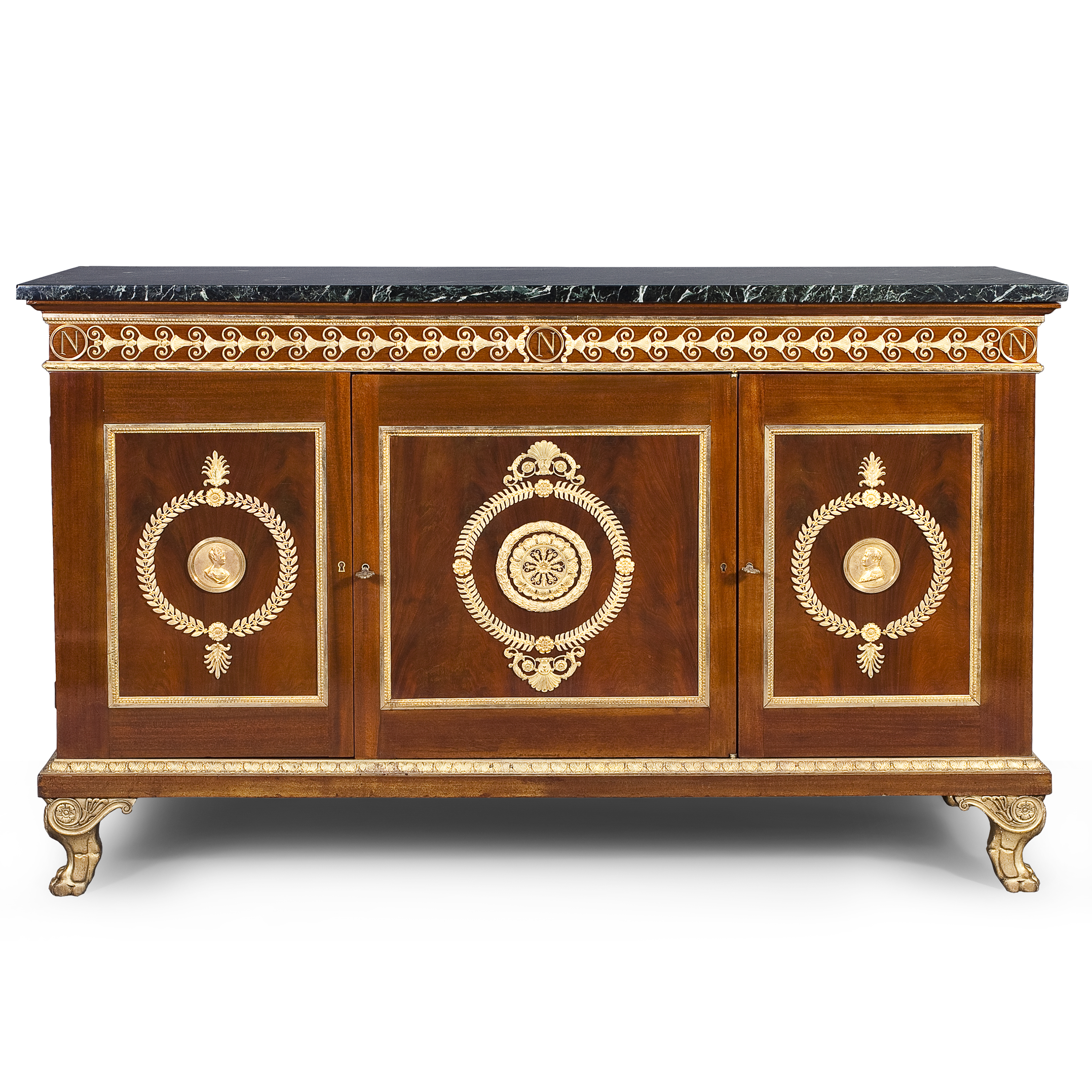 Дуб (основа), фанеровка красным деревом, бронза, золочение, мраморная столешница, Франция, вторая половина XIX века, размер (в/ш/г): 100 х 164 х 60 см