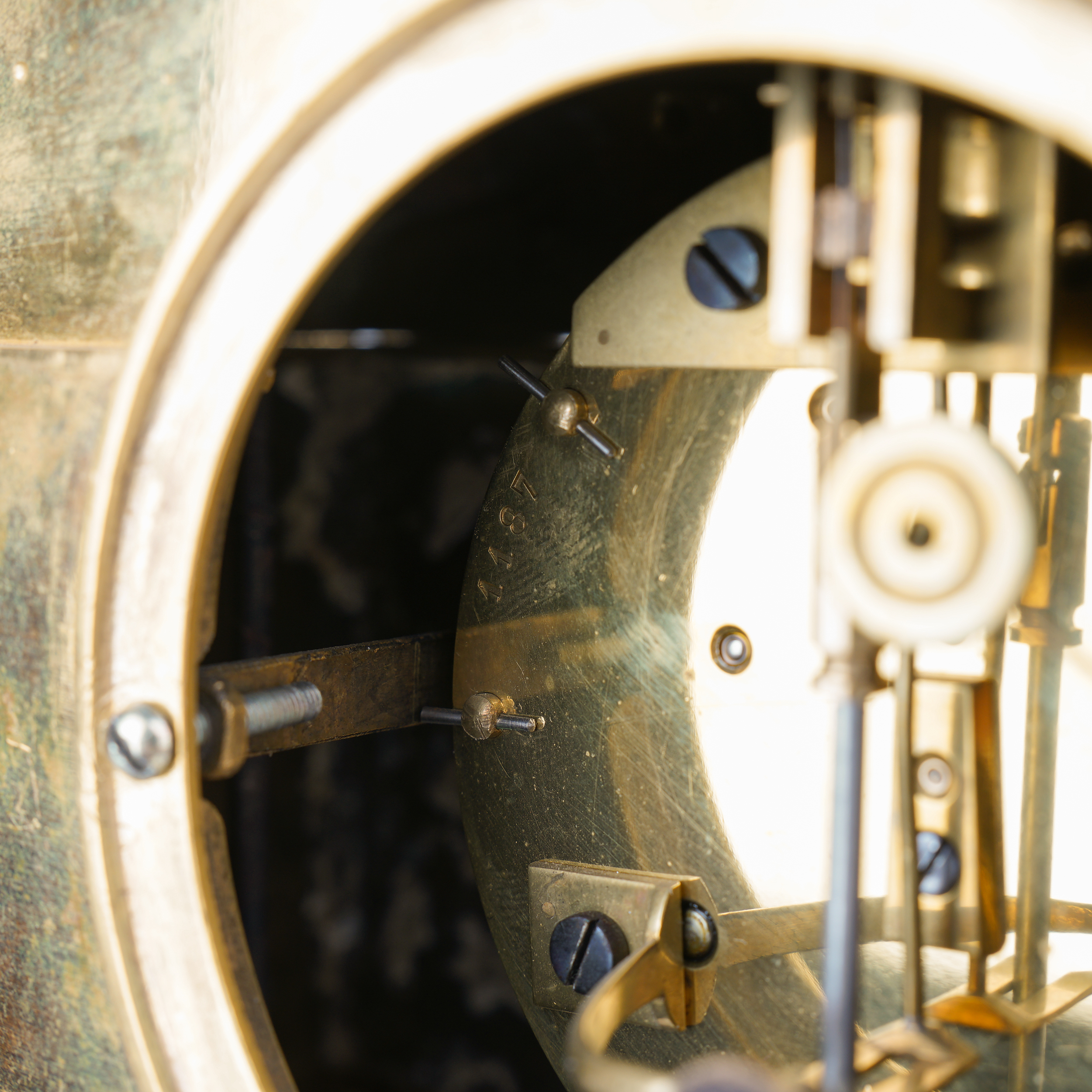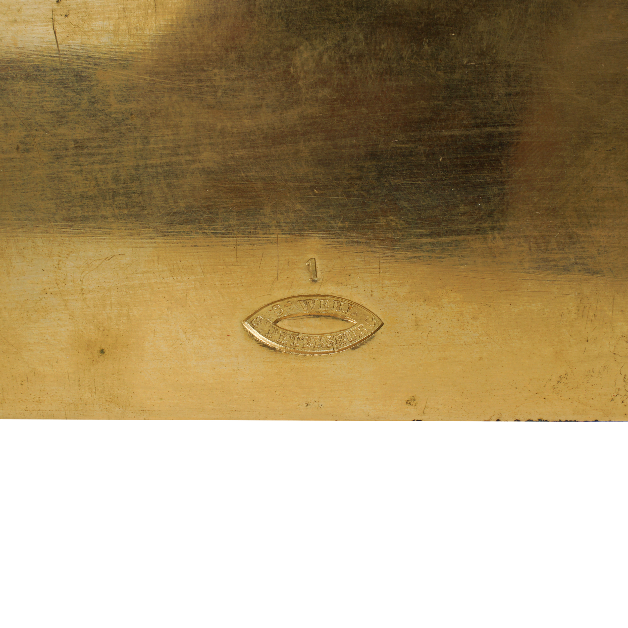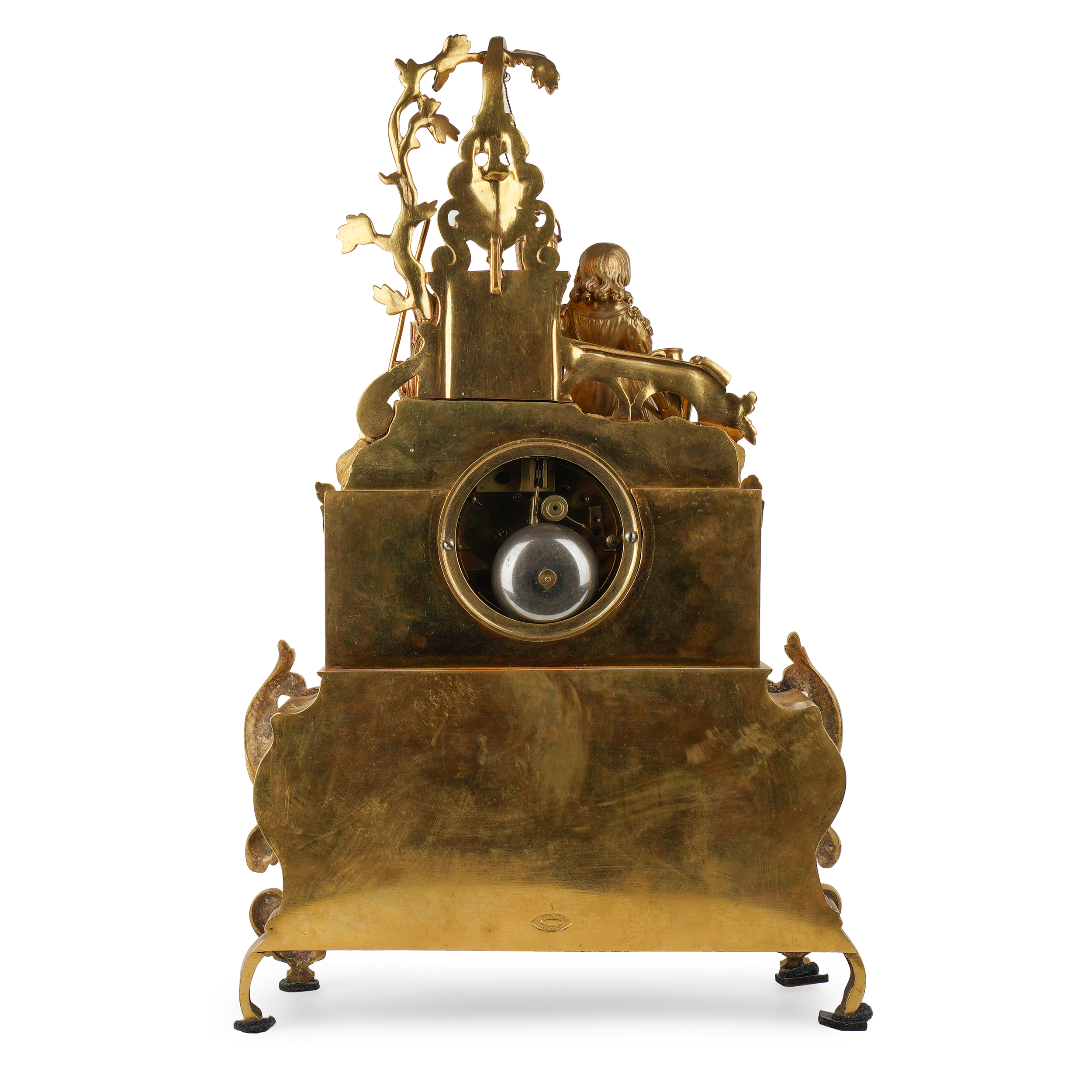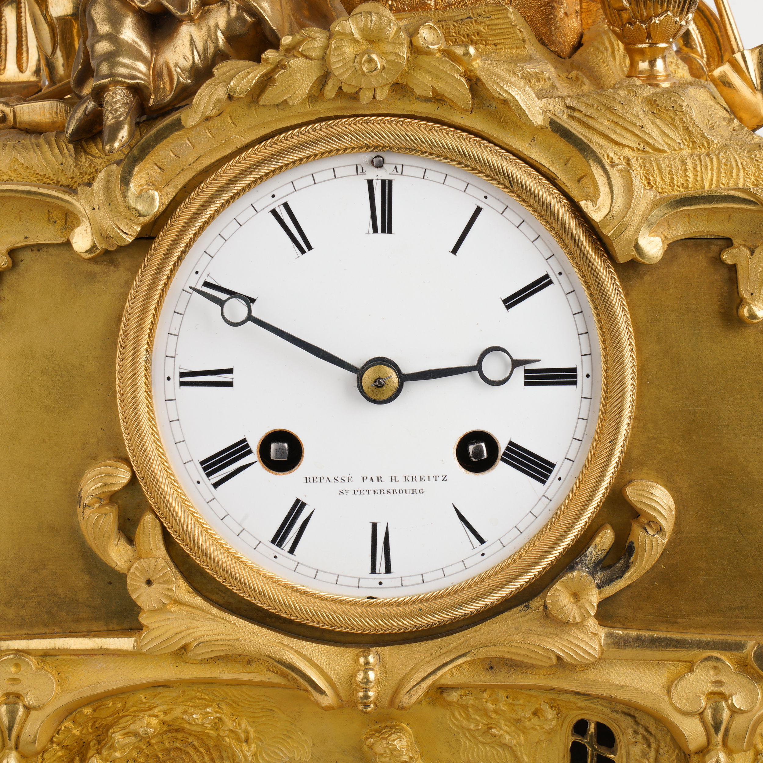 Бронза, литье, чеканка, огневое золочение, эмалевый циферблат с римскими цифрами часов и делением на минуты, стальные вороненые стрелки. На плате часового механизма штамп: «Brocot a Paris» (комплектующие детали механизма поставлялись из Франции фабрикой Броко), надпись на циферблате: «Repasse par H.Kreitz. St. Petersbourg» часовой мастерской Губерта Крейца, ученика Бреге, работавшего в Париже и Лондоне, а с начала 1840-х годов в Санкт-Петербурге. На обратной стороне корпуса штамп-клеймо «S. Well. St. Petersbourg» бронзолитейной мастерской Самуила Веля. Размер (в/ш/г): 45,5 х 32,8 х 16,2 см.