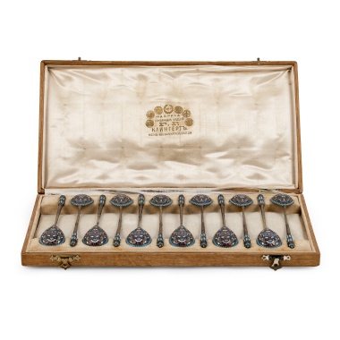 Серебро, литье, полихромные перегородчатые эмали в сканном обрамлении.