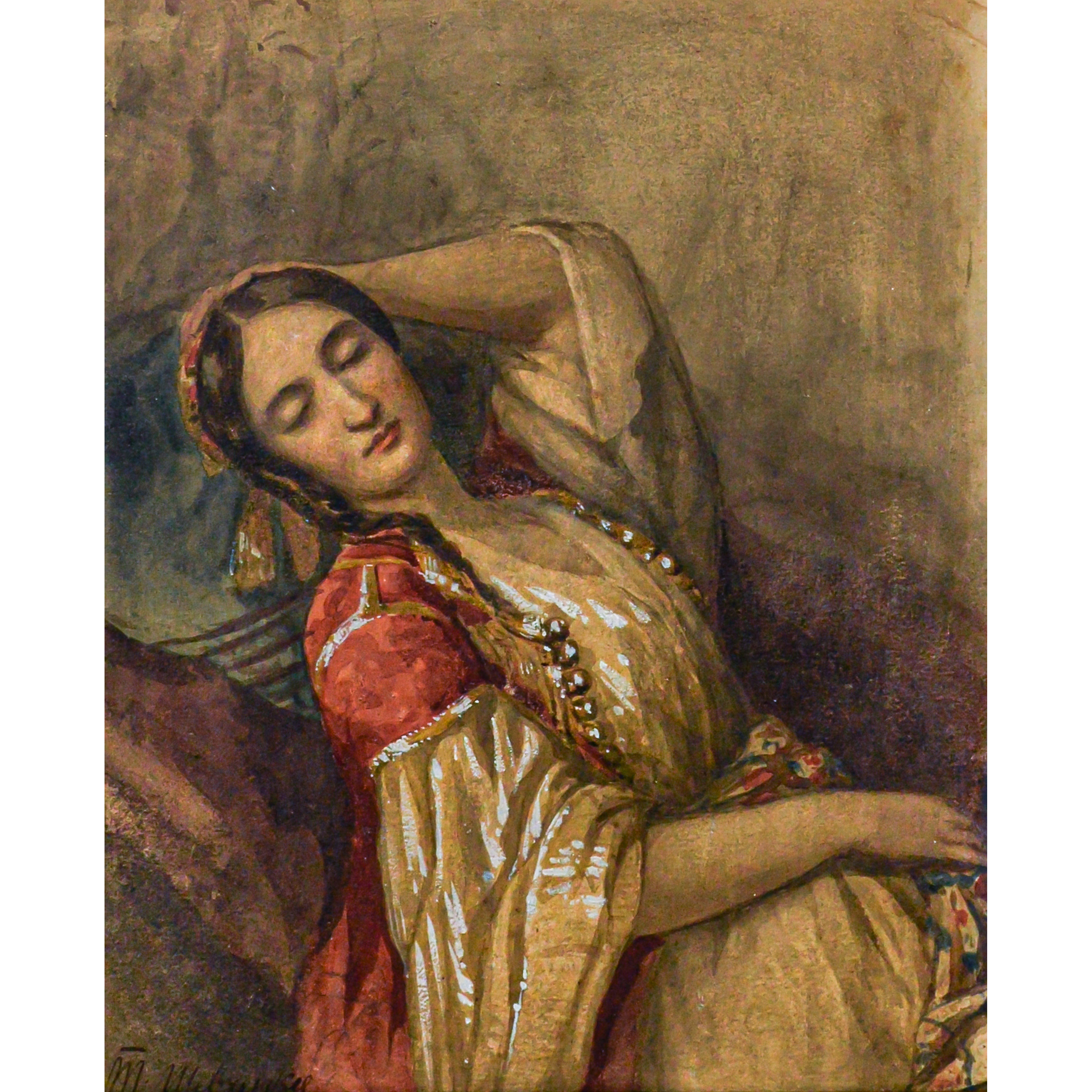 Перед зрителем предстаёт юная красавица в восточном костюме, погруженная в мечтательную негу: её нежный, будто неземной образ словно растворяется в пространстве комнаты, становясь едва осязаемым, так мягко переливаются цвета и тона мягких светотеневых переходов, подчёркнутых тончайшими мазками подобных солнечным бликам белил, бегущим по складкам платья.