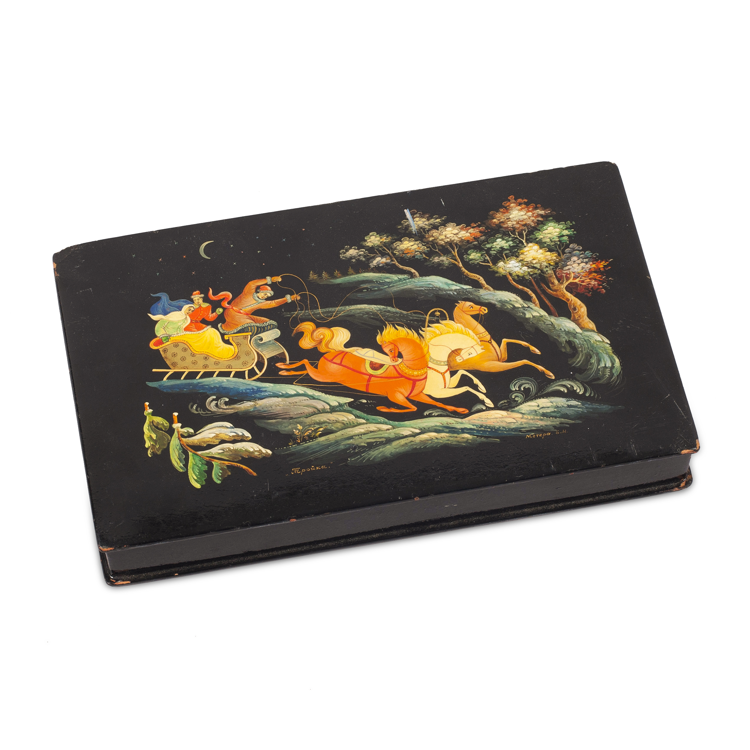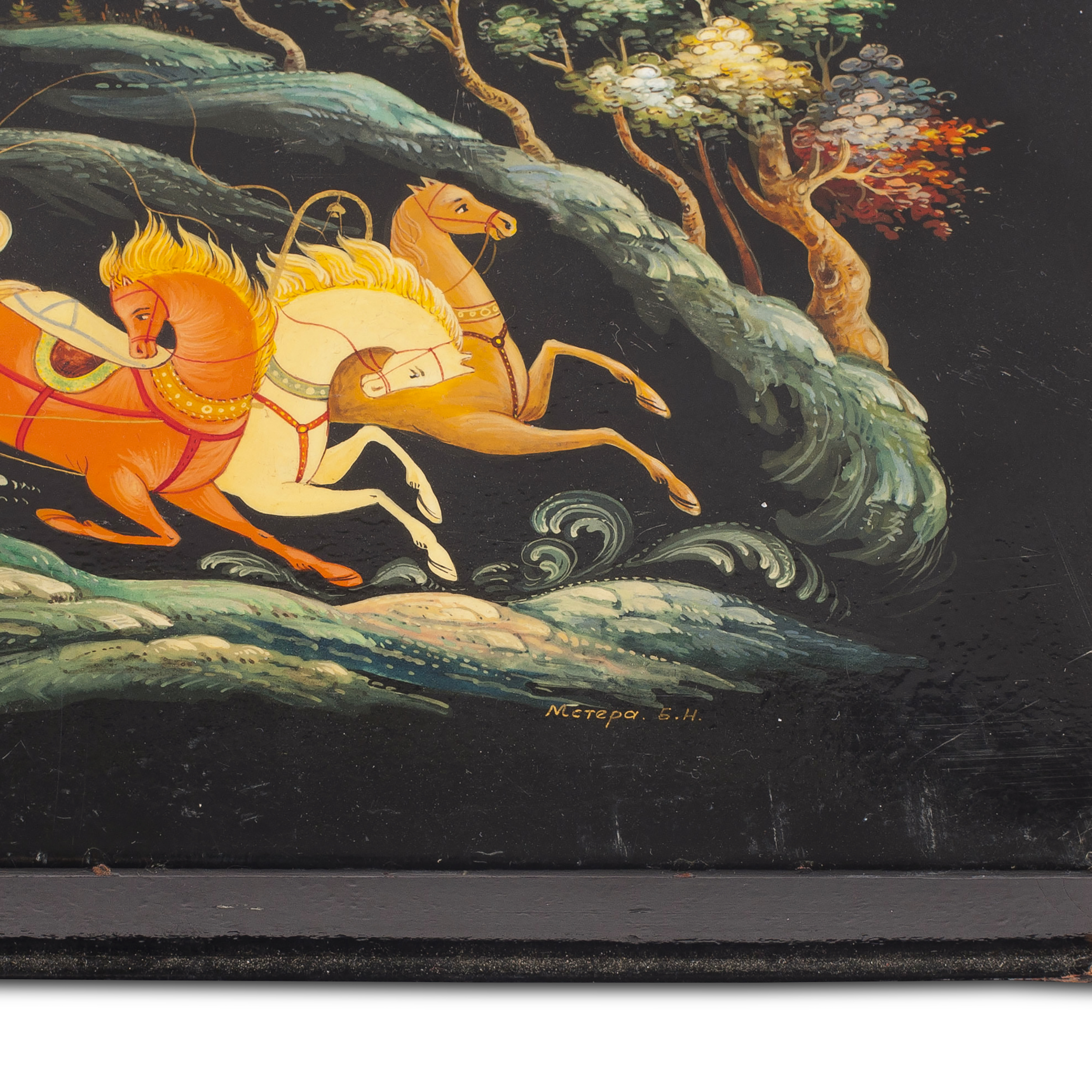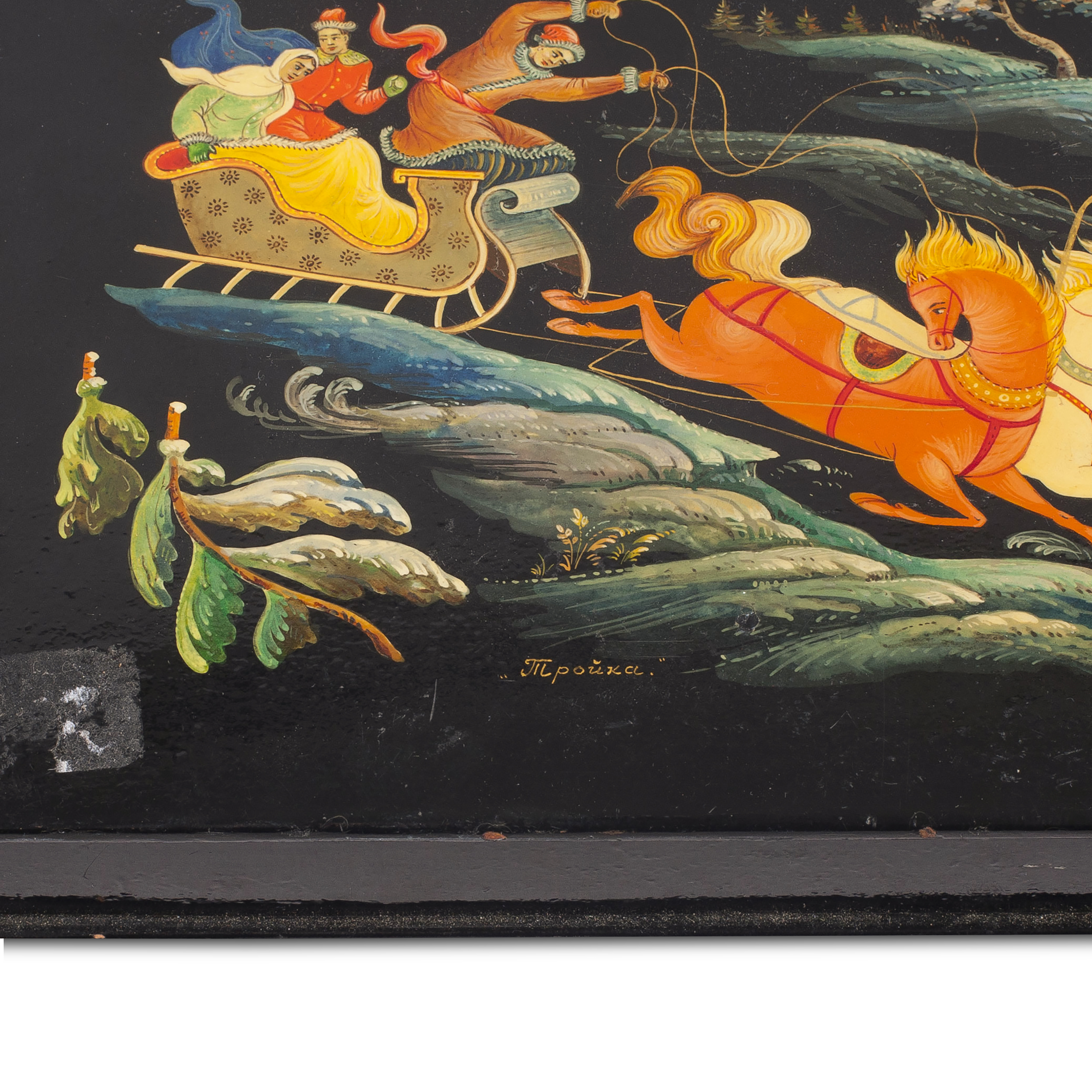 Папье-маше, лаковая миниатюра, под изображением название и авторская надпись: «Тройка. Мстера. Б.Н», автор монограммист «Б.Н» (предположительно Б.Н. Любомудров), СССР, село Мстера, последняя четверть ХХ века, размеры: 24,5 х 14,5 х 3 см