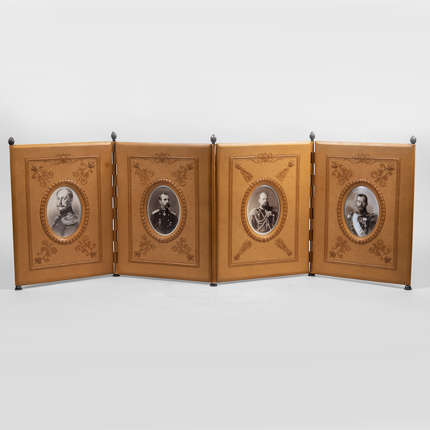 Рамка-складень четырехчастная с монограммой под императорской короной. Портрет Императора Николай I, портрет Императора Александр II, портрет Императора Александр III, портрет Императора Николая II. Кожа, теснение, металл, монтировка, размеры: 34х24 (96) см.