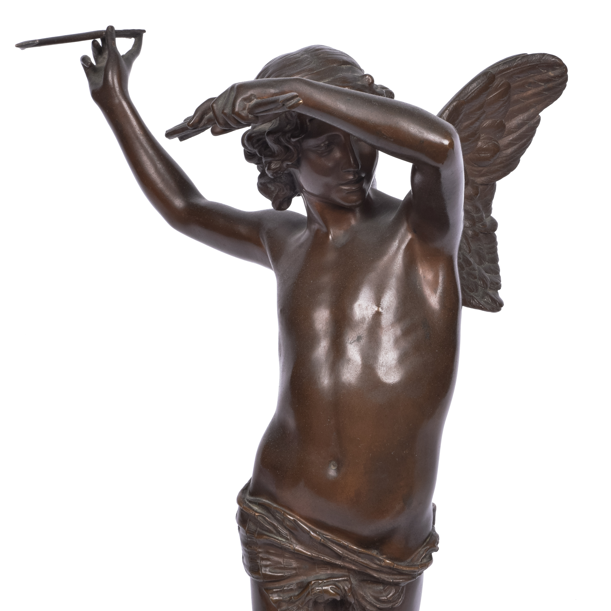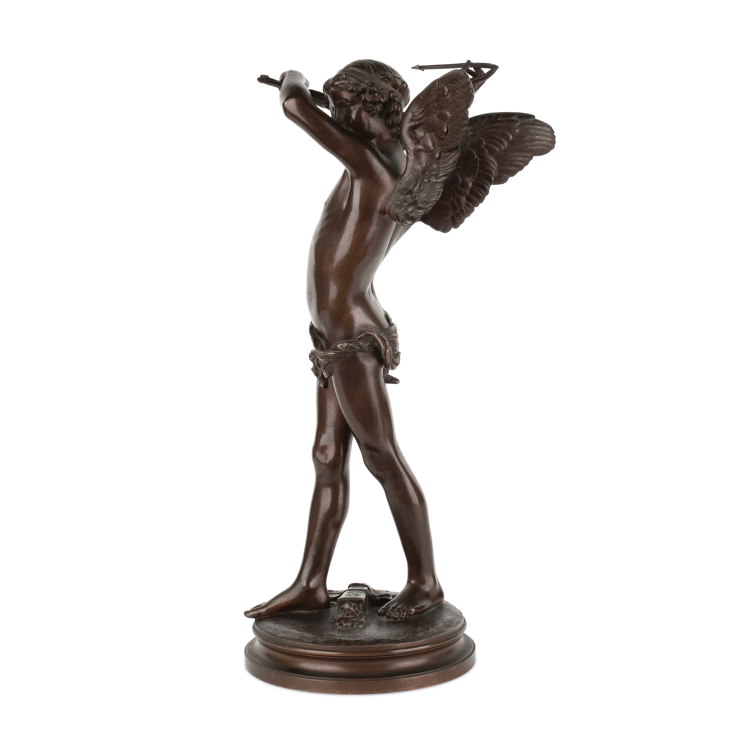 Фигура Эроса выполнена по модели Огюстена Жана Моро-Вотье (Augustin Moreau-Vauthier,1831-1893). Бронза, литье, патинирование, на поземе факсимиле подписи «A. Moreau Vauthier», а также штамп литейной мастерской «THIEBAUT FRERES FONDEURS PARIS», литейный завод братьев Тьебо, Франция, последняя четверть XIX века, высота – 37 см, диаметр основания - 13 см