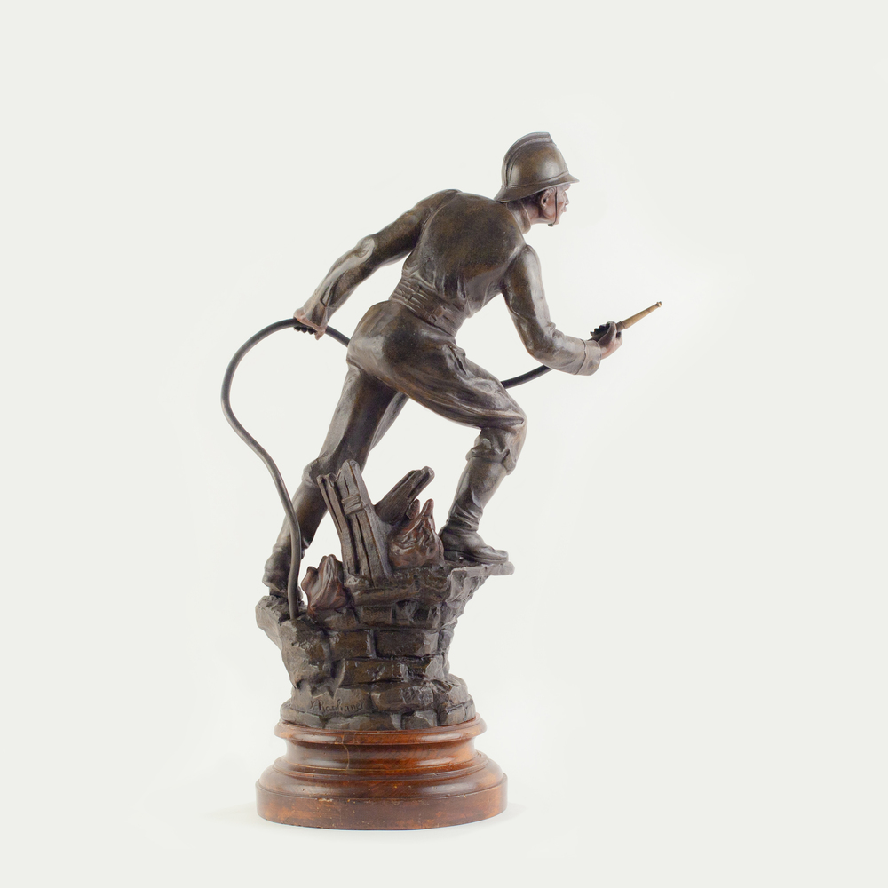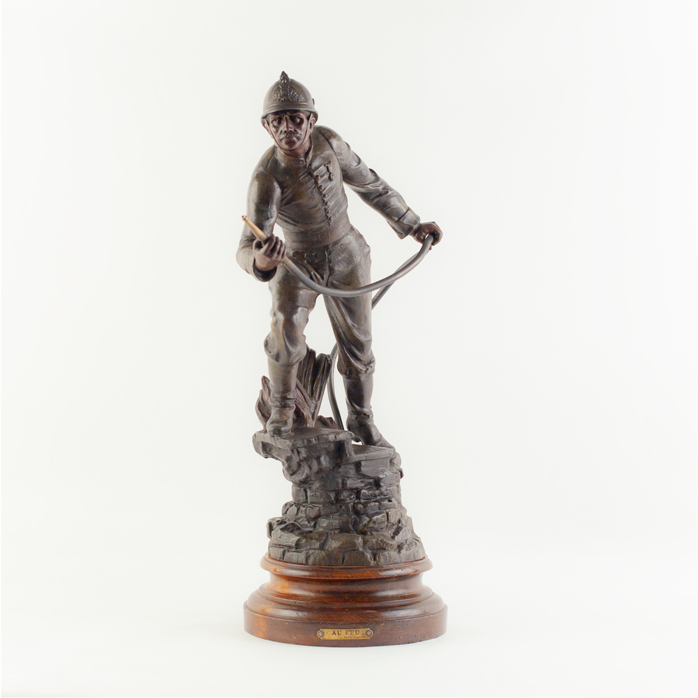 Выполнена по модели скульптора Ксавье Рафанелья (Xavier Raphanel, 1876-1957). Шпиатр, дерево, надпись на шилде «AU FEU PAR X. RAPHANEL», Франция, около 1920 года, высота - 58 см, диаметр основания - 8 см