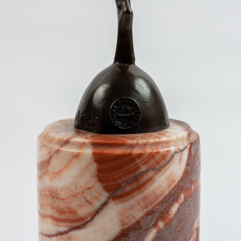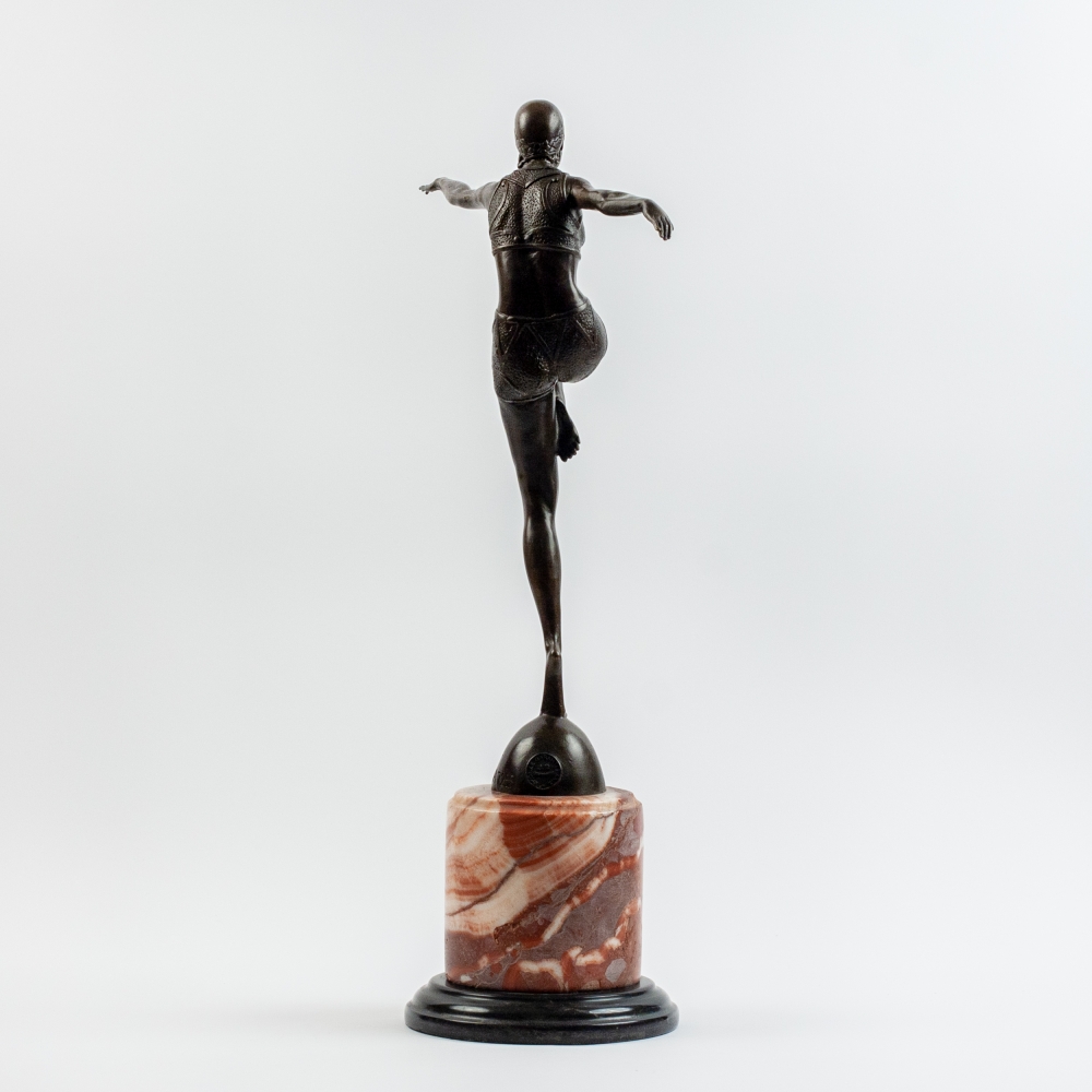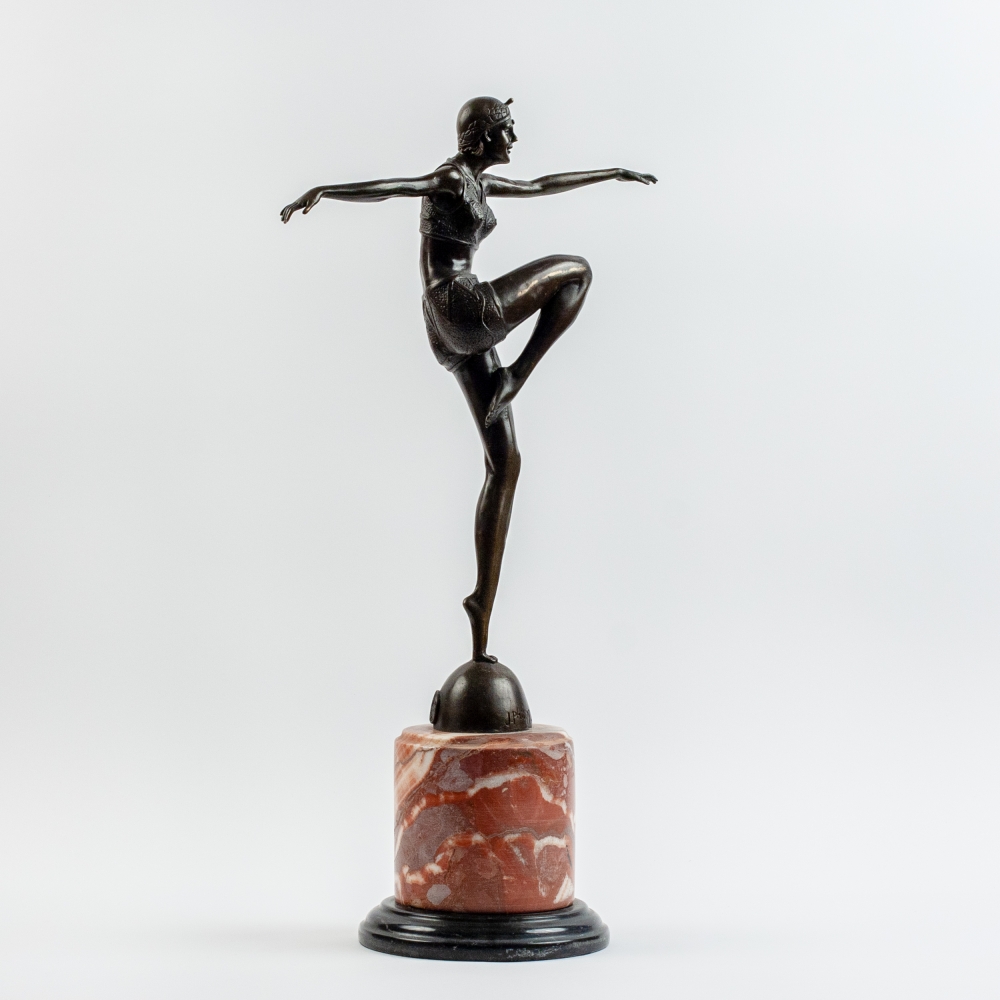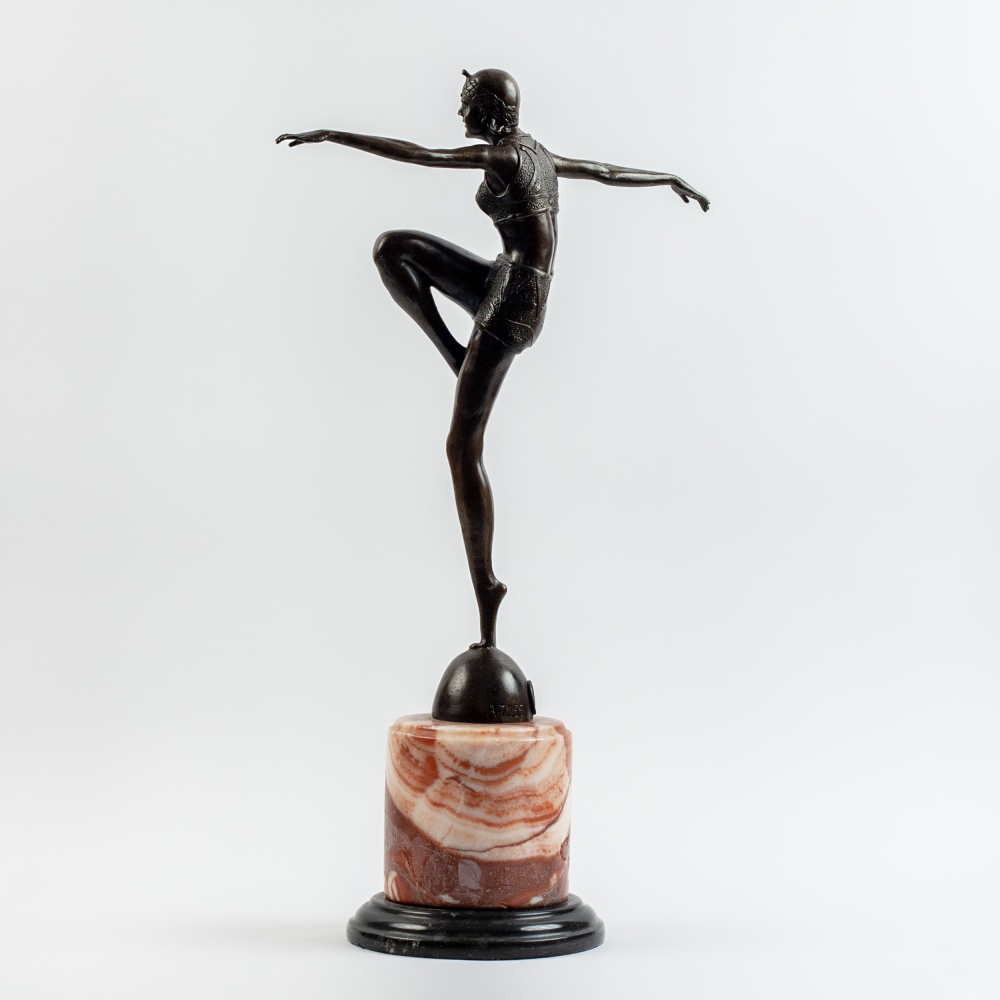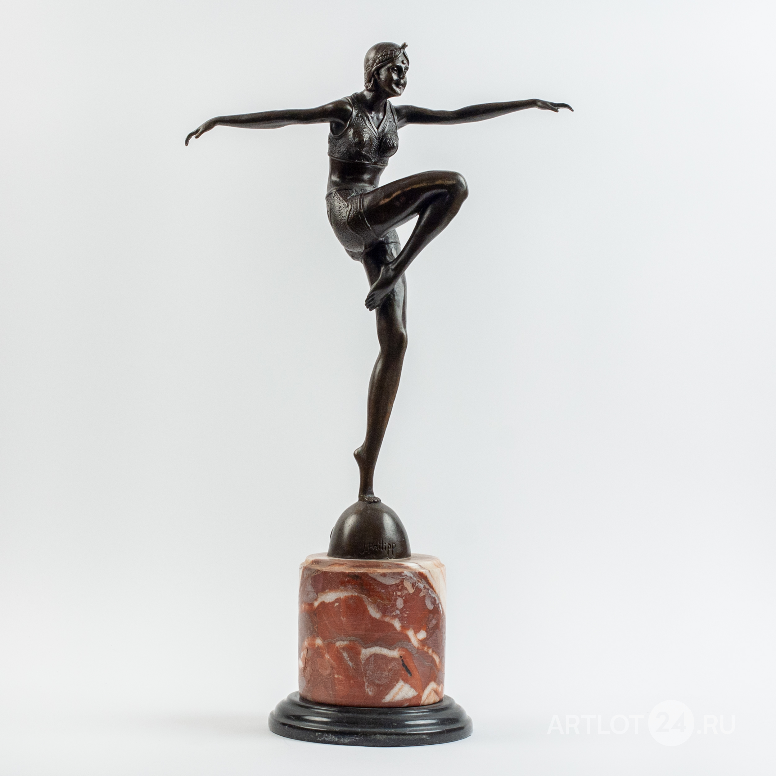 Бронзовая скульптура в стиле ар-деко «Финикийская танцовщица» , выполнена в манере Д. Чипаруса. Бронза, красный мрамор, на основании подпись «J. Philippe» штамп «JB Déposé Bronze Garanti Paris» и номер «A7235», Европа, ХХ век, размер (в/ш/г): 58 х 33 х 19, высота постамента – 15 см