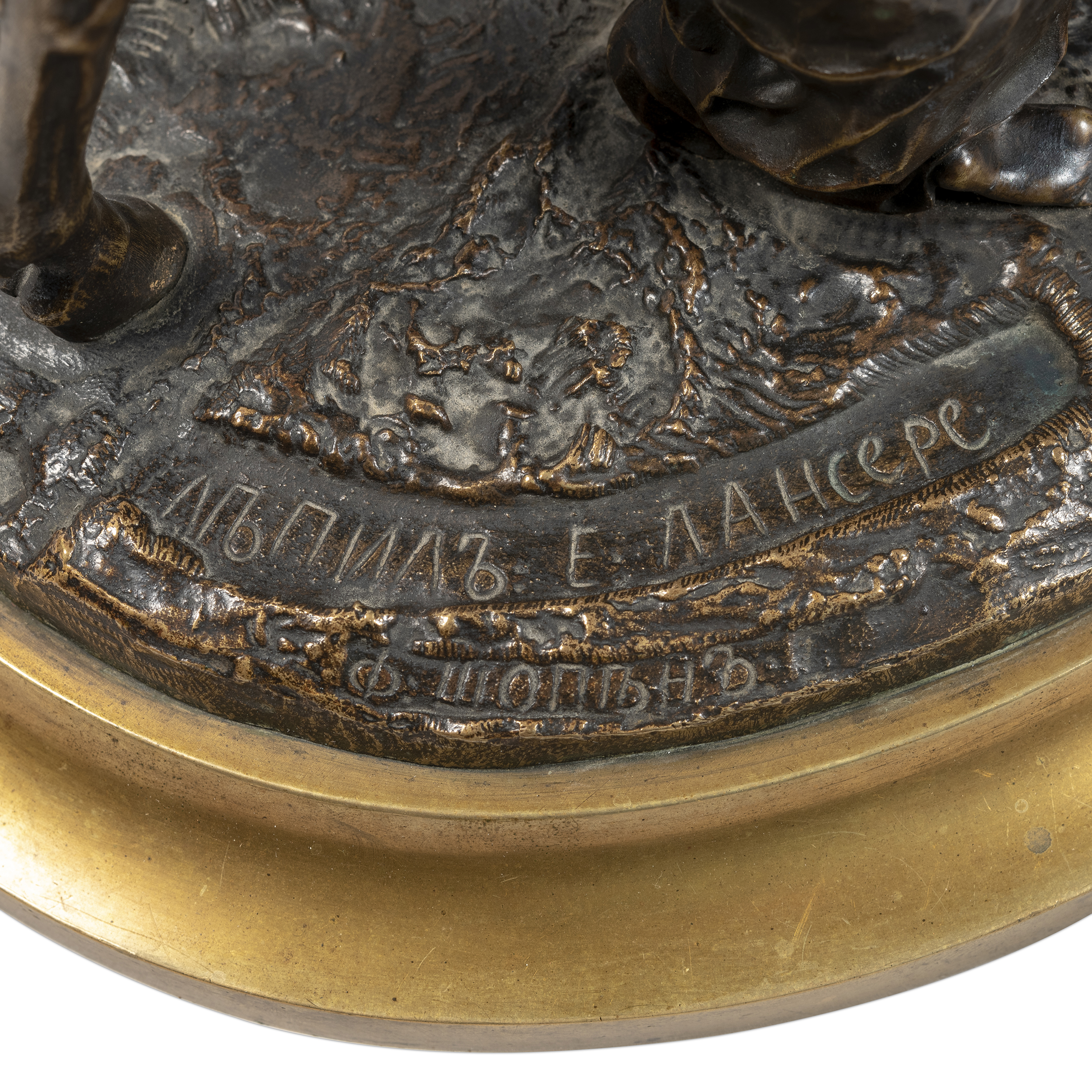 Модель 1869 года, значится в списке произведений Е. Лансере, хранящемся в Академии Художеств, под №38. Бронза, литье, чеканка, патинирование, оксидирование; в литье марки «ЛЪПИЛЪ: Е: ЛАНСЕРЕ: Ф. ШОПЕНЪ», а также патентное клеймо с надписью: «ОТЪ МФ Л.Ш. НА 10 ЛЪТЪ», неизвестное бронзолитейное предприятие по образцу в бронзе, исполненному на Фабрике художественной бронзы Ф. Шопена (1813-1892), конец XIX – начало XX века, размер (в/ш/г): 23,5 х 36,6 х 14,5 см, вес – 9,7 кг.