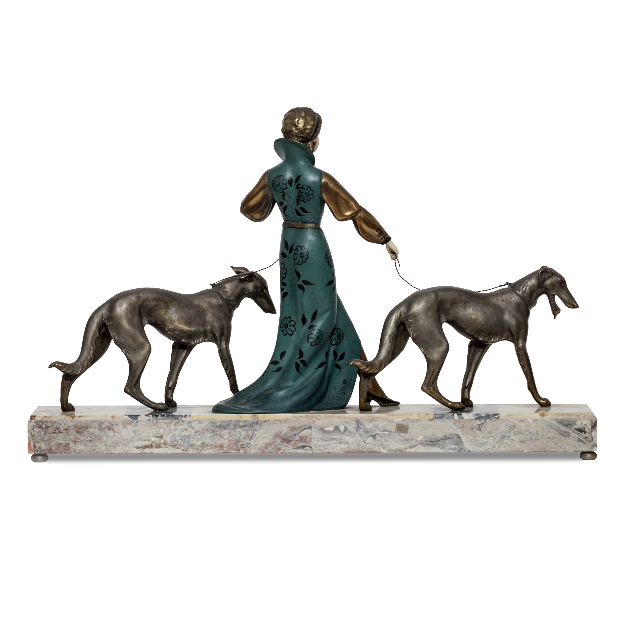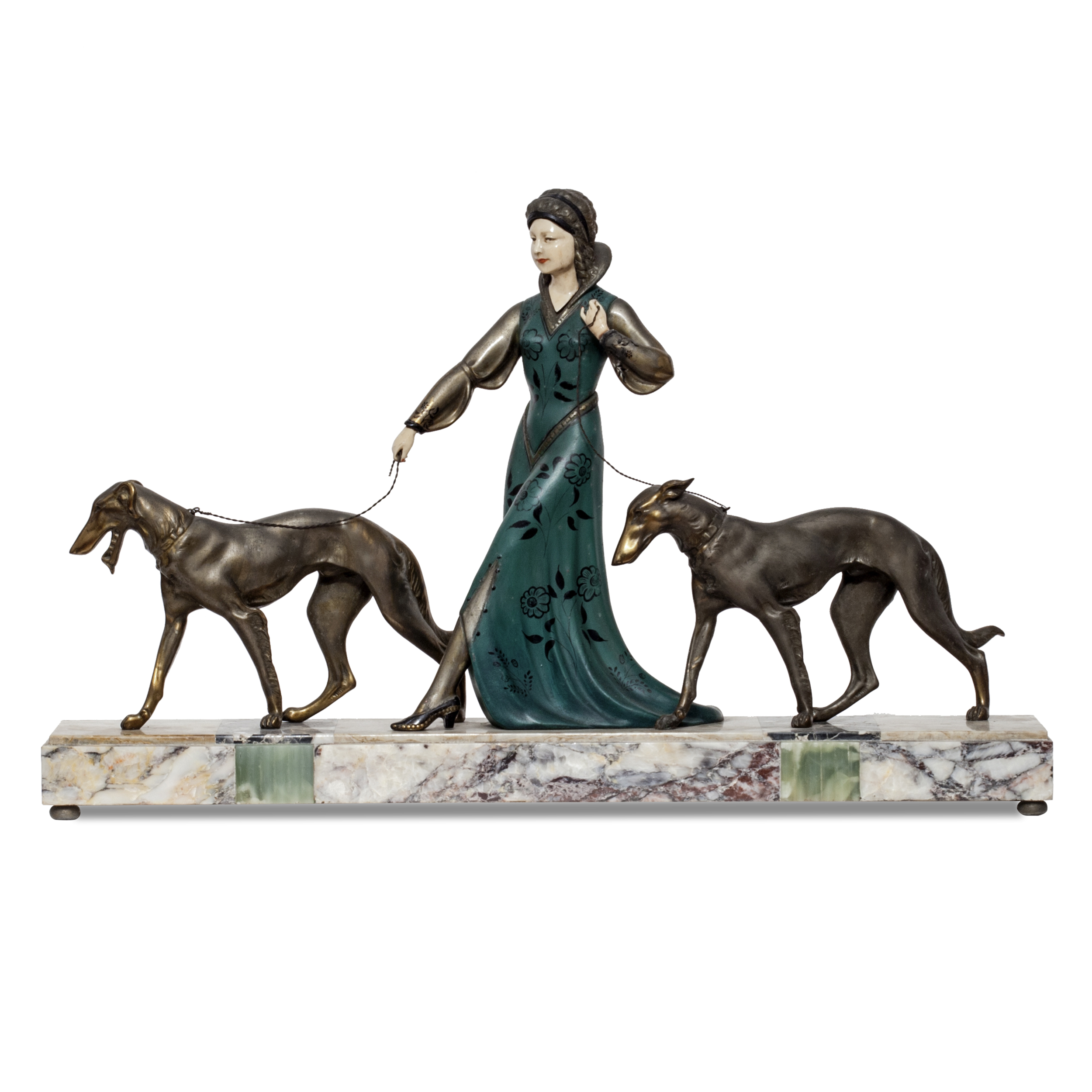 Шпиатр, отливка, проработка, полихромное патинирование, окрашивание, ивуарин (Chryselephantine Technique- кость искусств. происхождения), оникс, мрамор, на постаменте в верхнем правом углу подпись "Scali", автор французский скульптор Раффаэлло Скали, Бельгия, 1920-1930 годы, размер (в/ш/г) 78 х 49 х 16 см