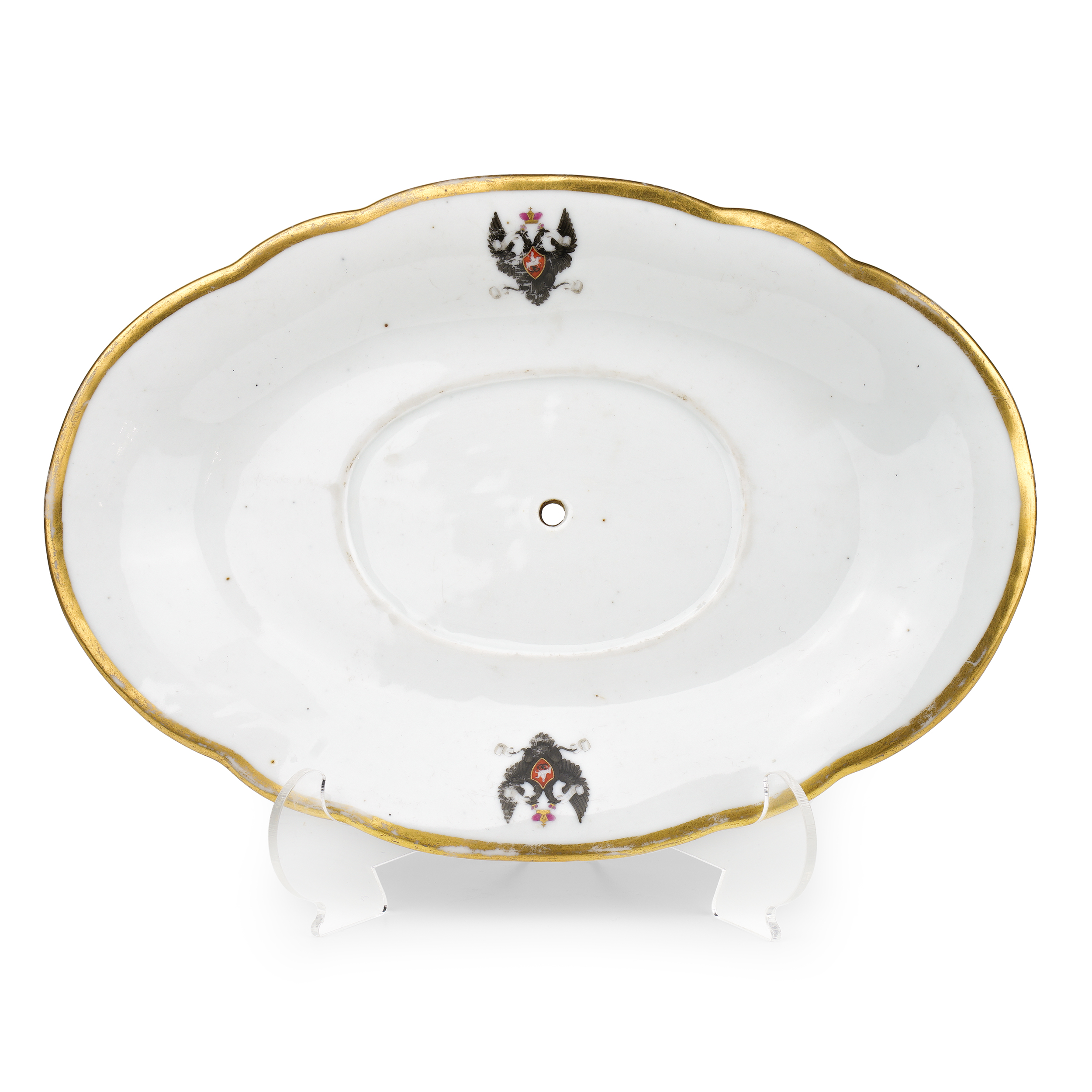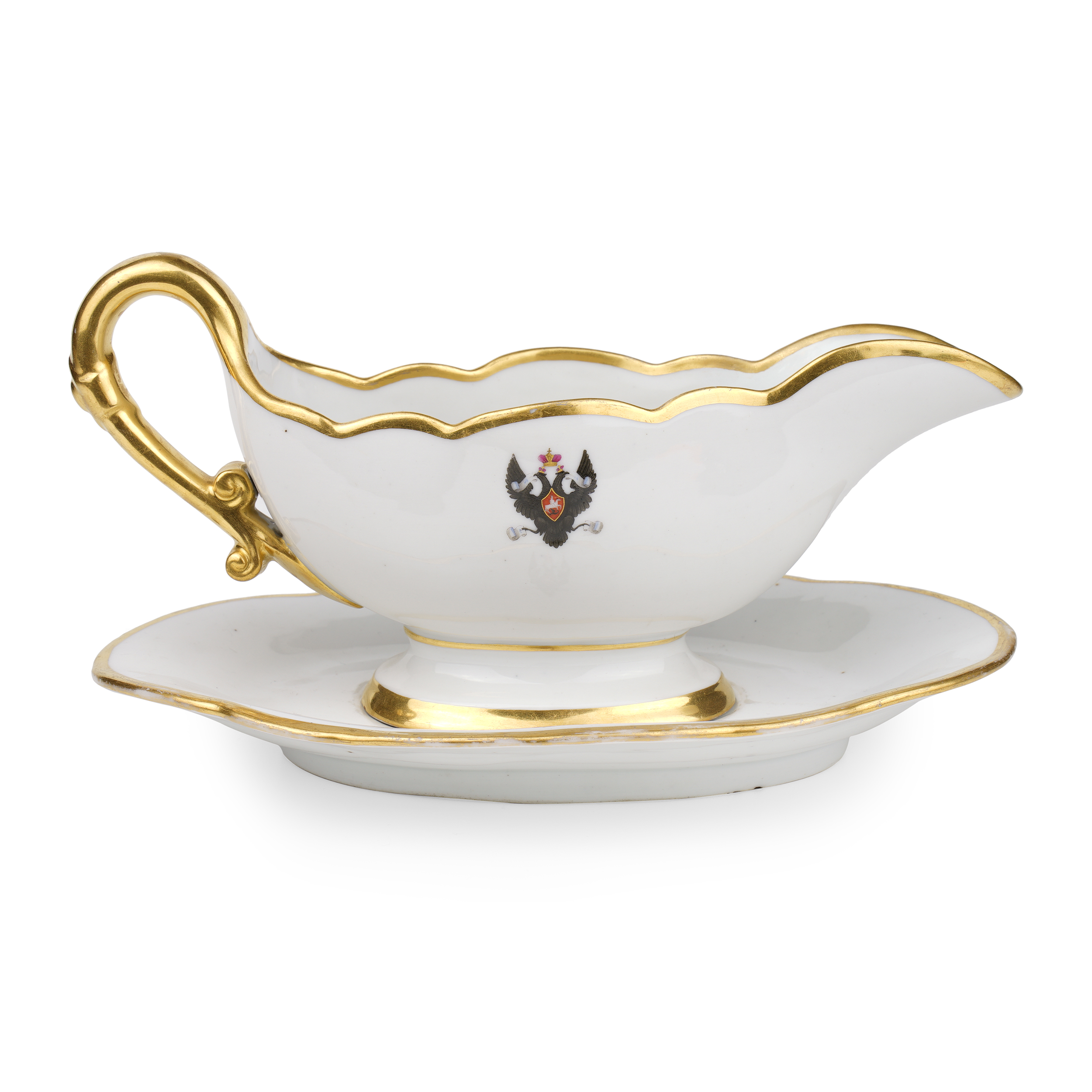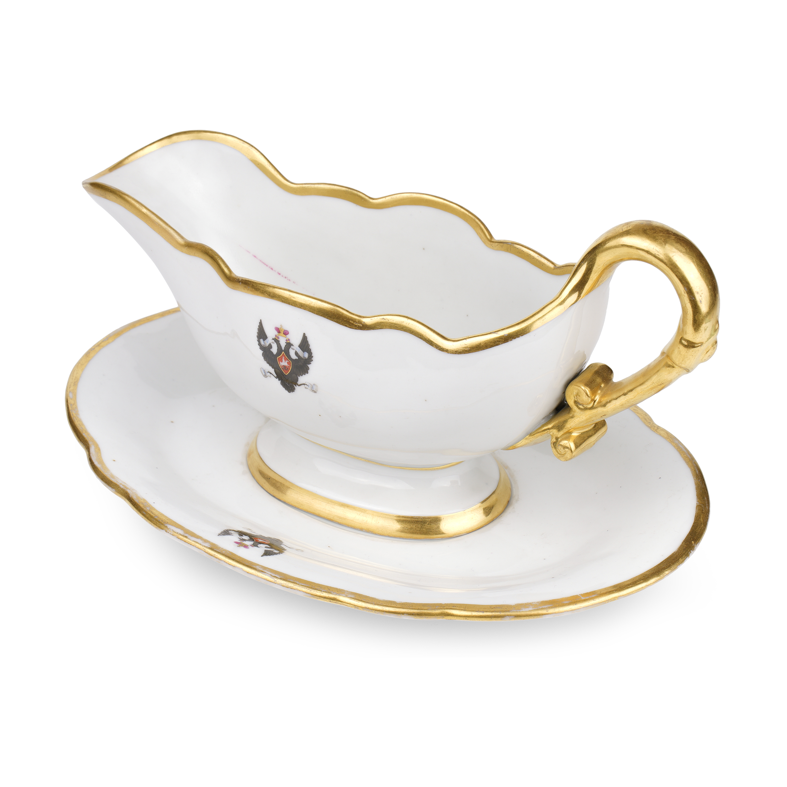 Соусник на поддоне с изображением двуглавого орла под императорской короной. Фарфор, полихромная надглазурная роспись, золочение, цировка, подглазурная марка кобальтом «НI» под императорской короной, Россия, период правления Николая I, 1825 – 1855 годы. Размер соусника (в/ш/г): 12,5 х 25,5 х 9,4 см, поддона: 25 х 18 см.