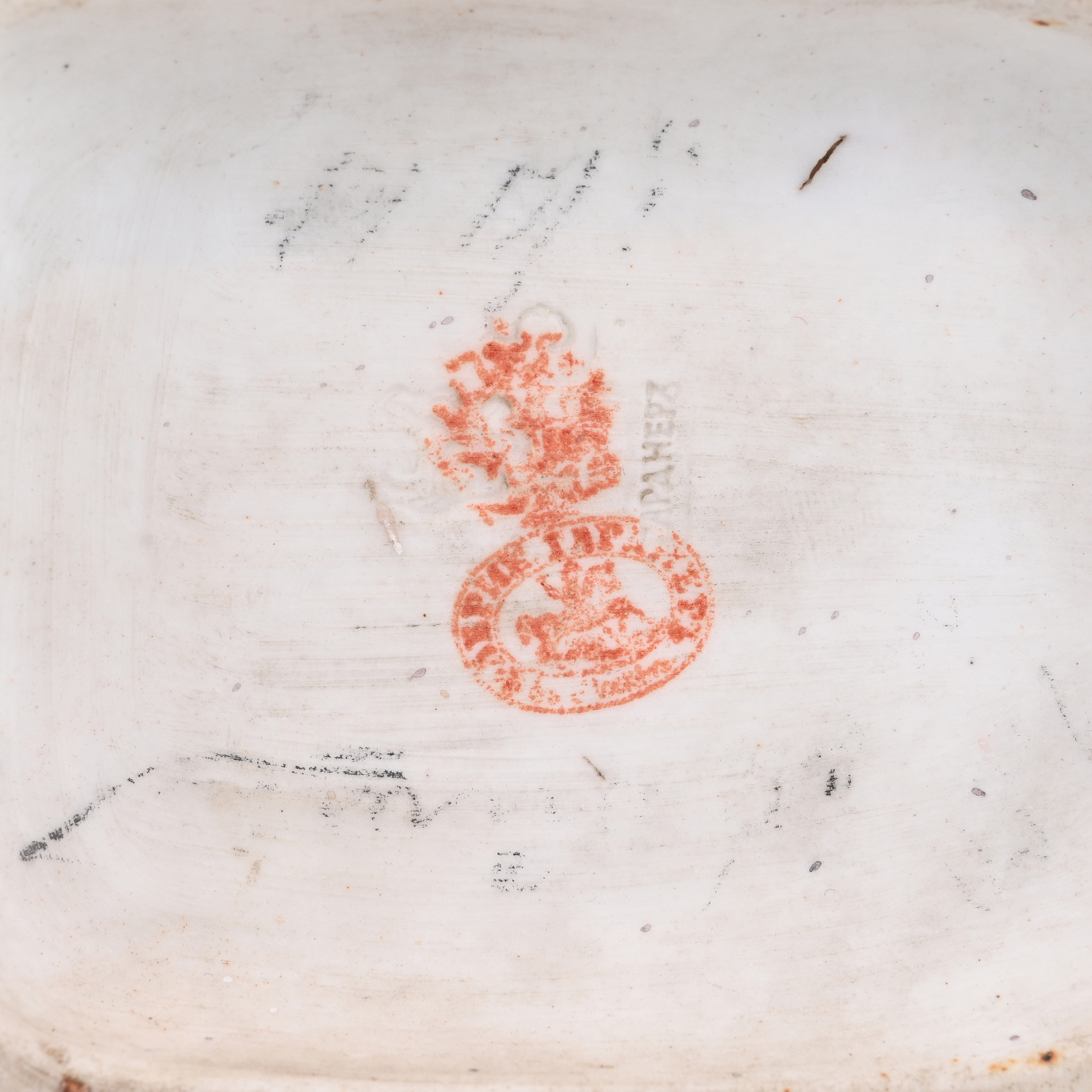 Бисквит, полихромная роспись, марка в тесте: «ГАРДНЕРЪ» под Георгием Победоносцем, красная печатная марка «ФАБРИК.ГАРДНЕРЪ в Москвъ» под двуглавым орлом.