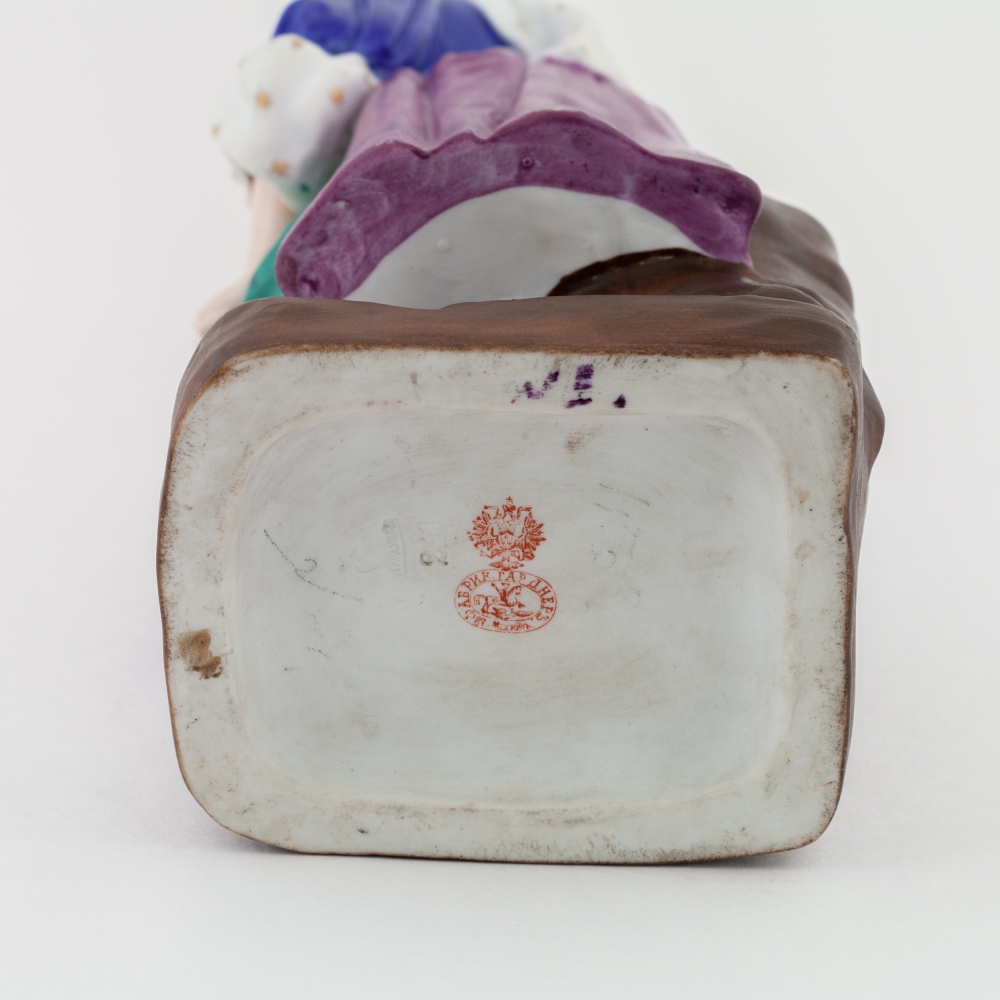 Выполнена по модели середины XIX века. Бисквит, полихромная роспись, золочение, клеймо темно-красное печатное, а также в тесте герб города Москвы и надпись "ГАРДНЕРЪ", завод Ф.Я. Гарднера, Москва, 1880-1890-е годы, высота - 27 см