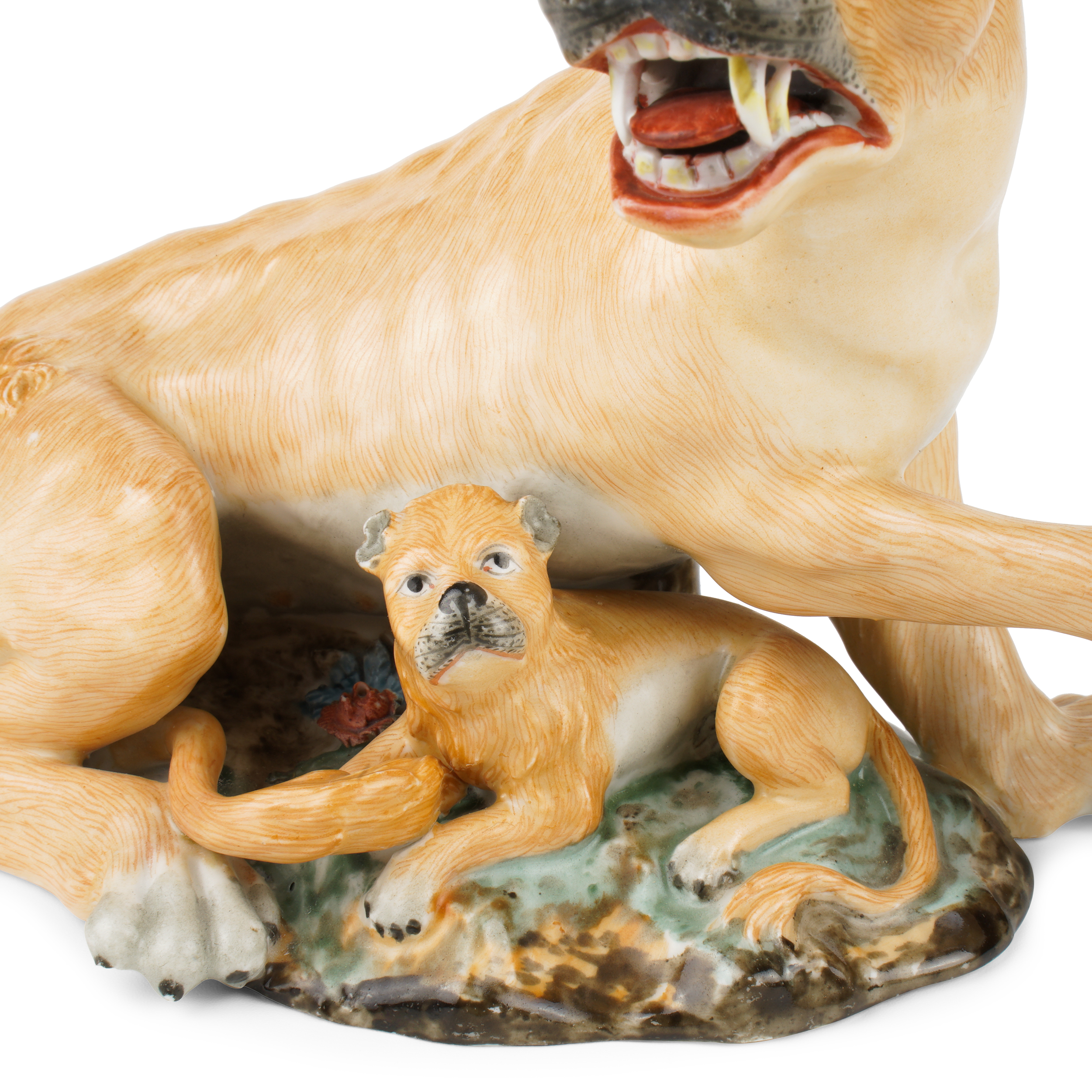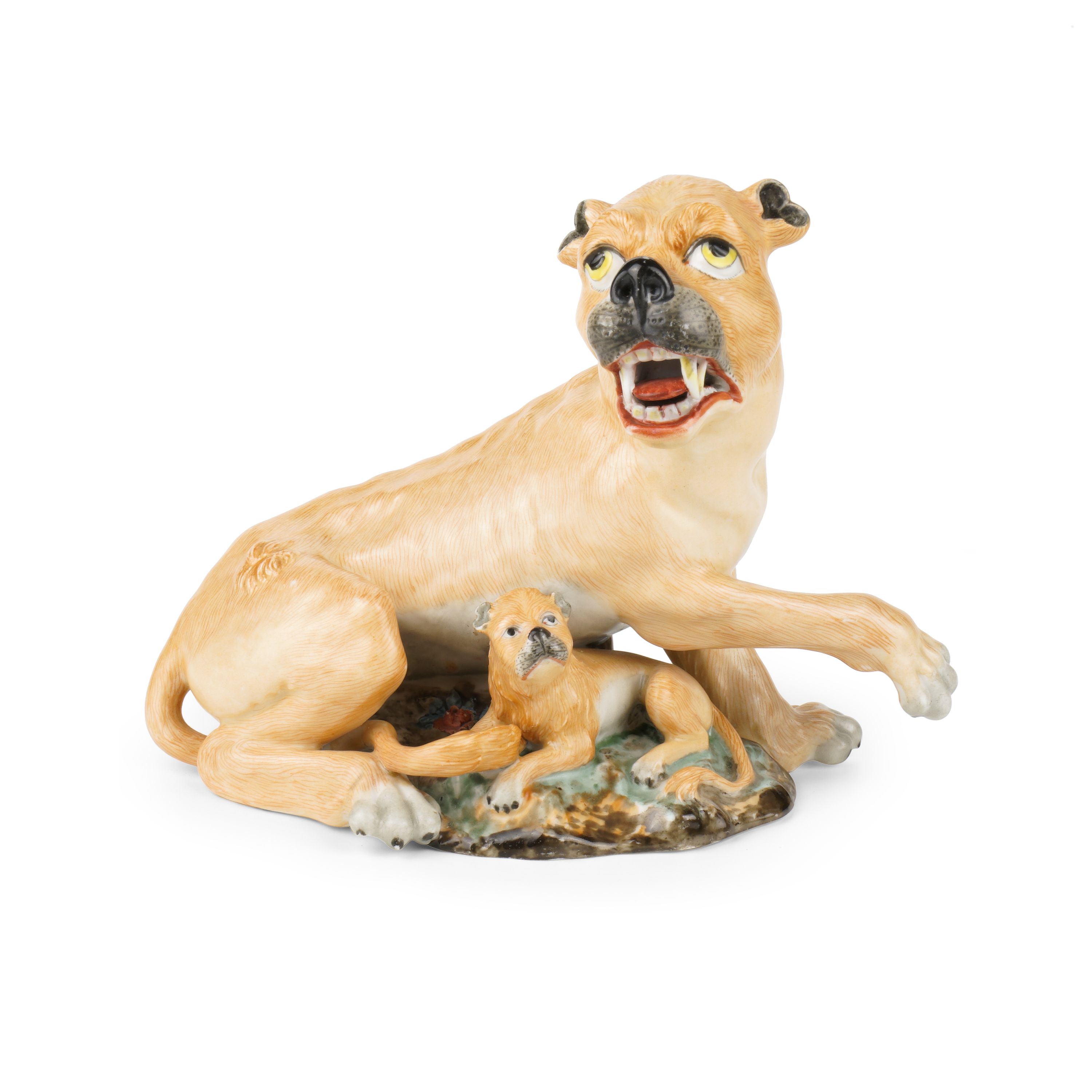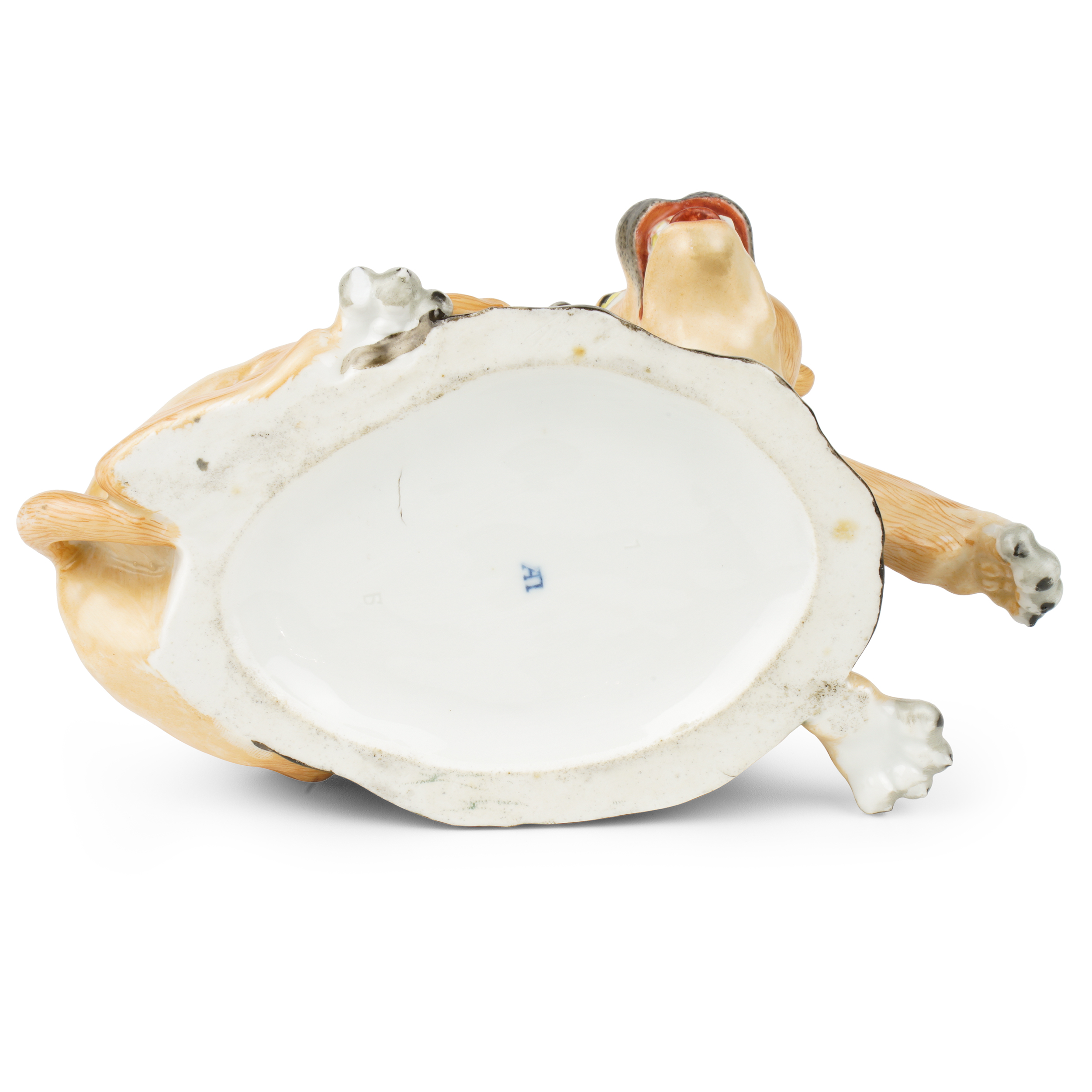 Выполнена по модели 1751 г И.И. Кендлера Мейсенской фарфоровой мануфактуры. Фарфор, лепка, полихромная надглазурная роспись, марка кобальтом в тесте в виде совмещенных букв «АП», Россия, размер (в/д/ш): 13,5 х 17,5 х 9,5 см.