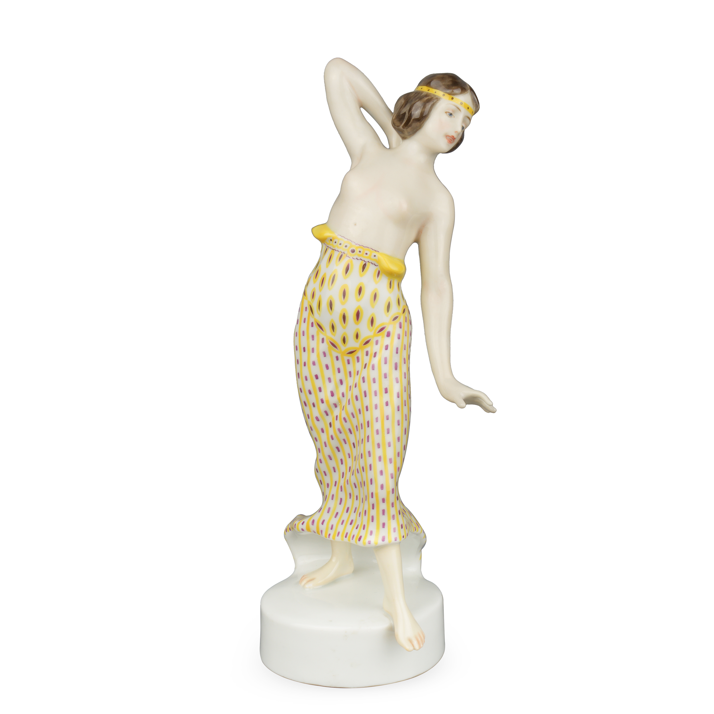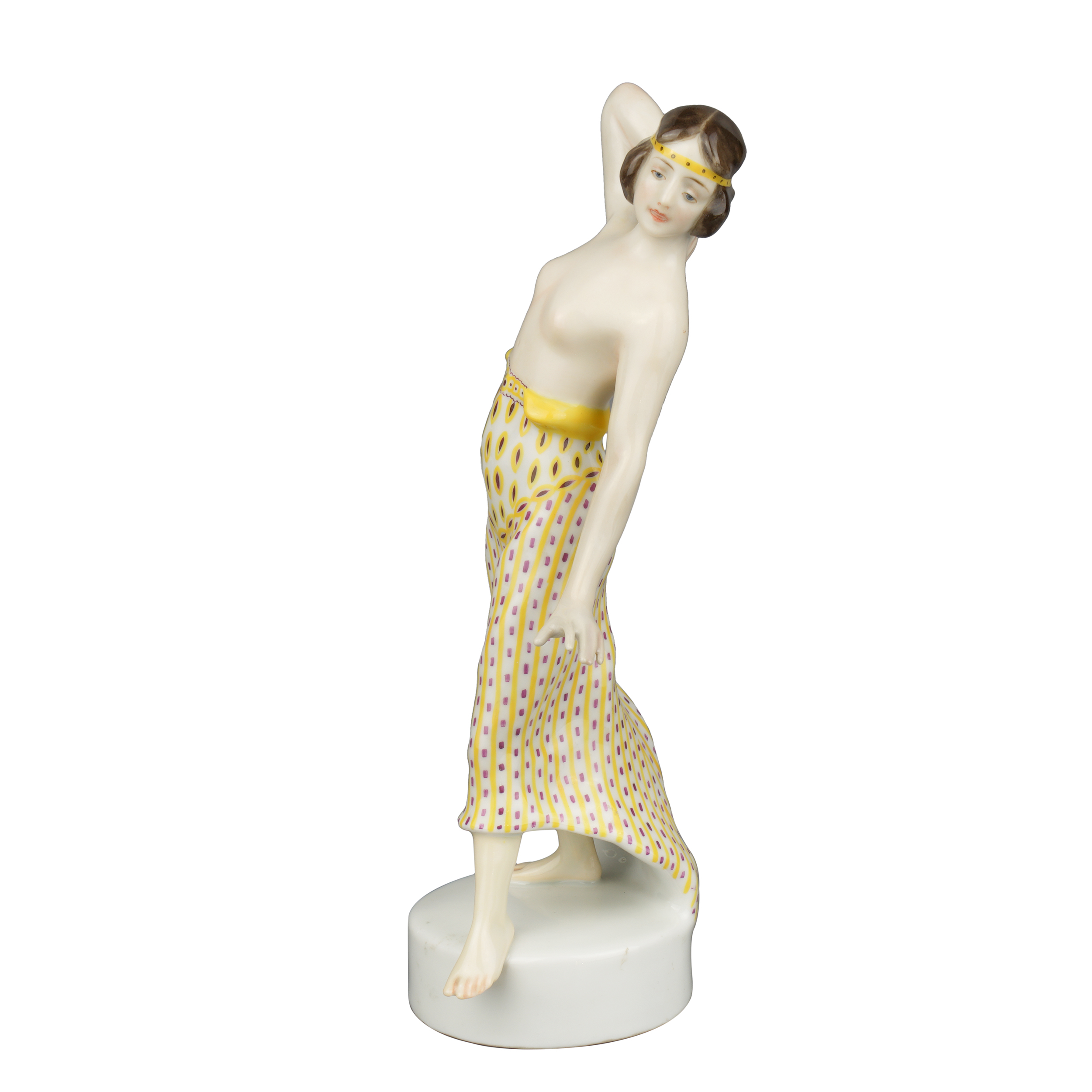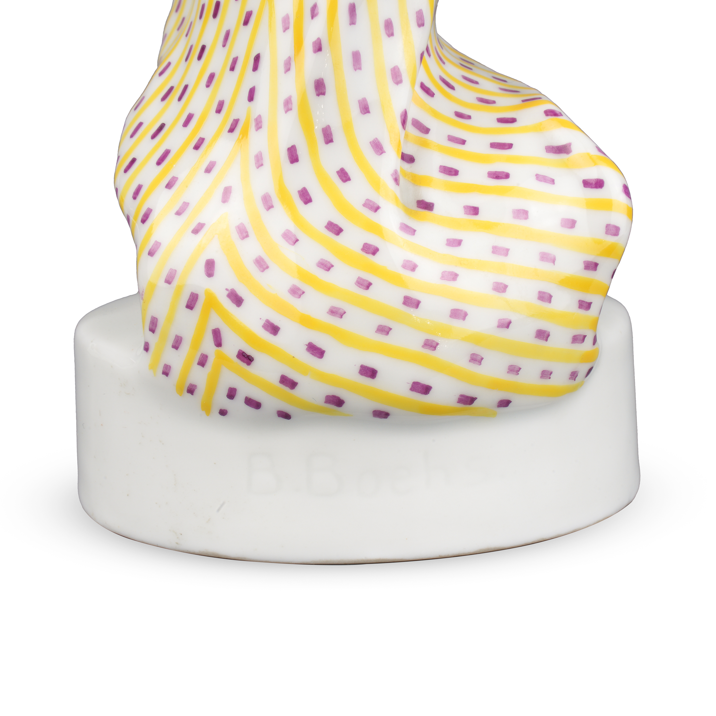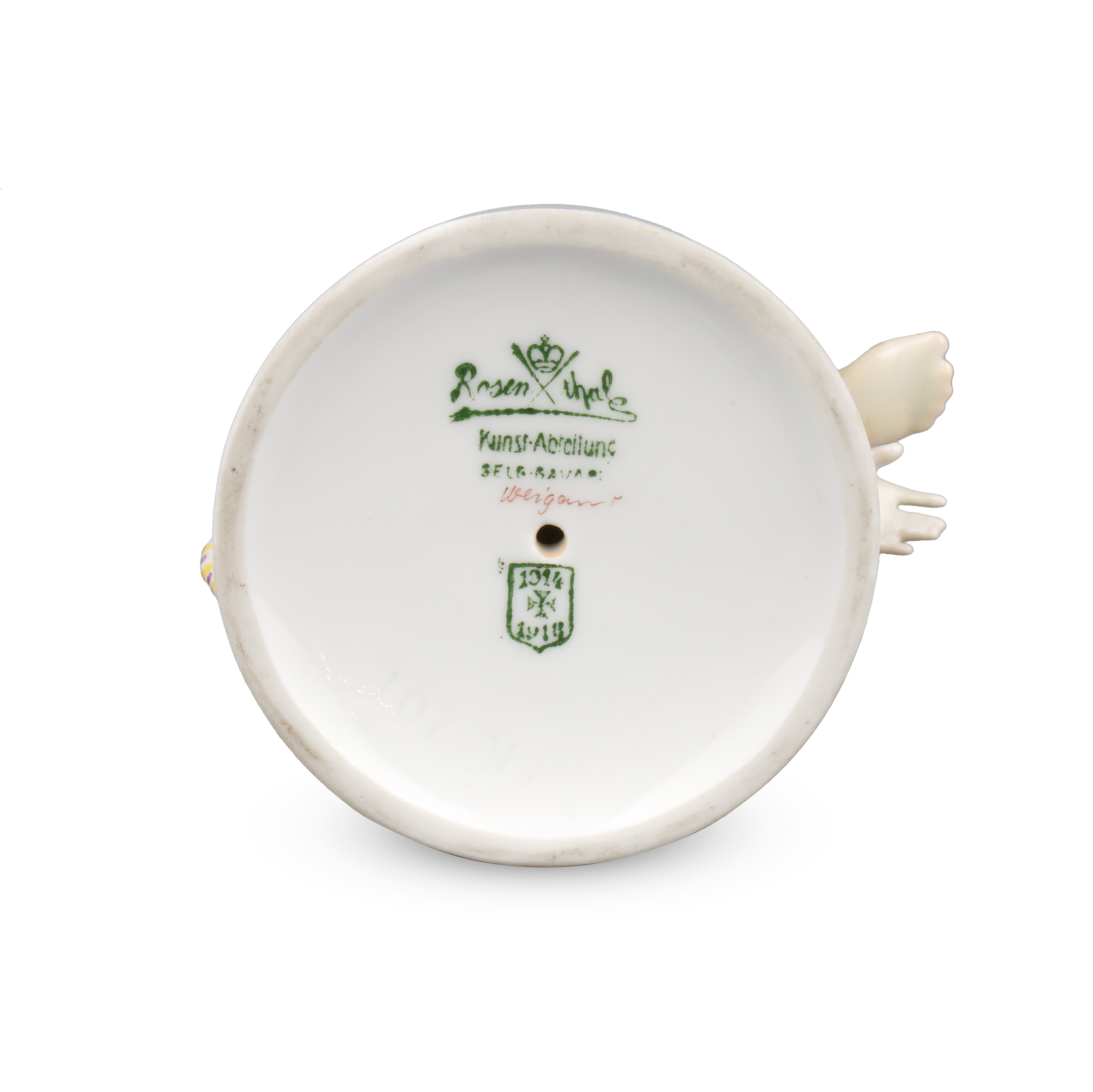 Фарфор, лепка, полихромная подглазурная роспись, марка: зеленым печатью подглазурная "Rosenthal Kunst-Abteilung Selb Bavaria" под короной, подпись в тесте «B. Boess», автор модели Бертольд Босс (Berthold Boess, 1887-1957), Розенталь (Rosenthal), Германия, 1930 год, высота - 24 см. Редкий коллекционный экземпляр.