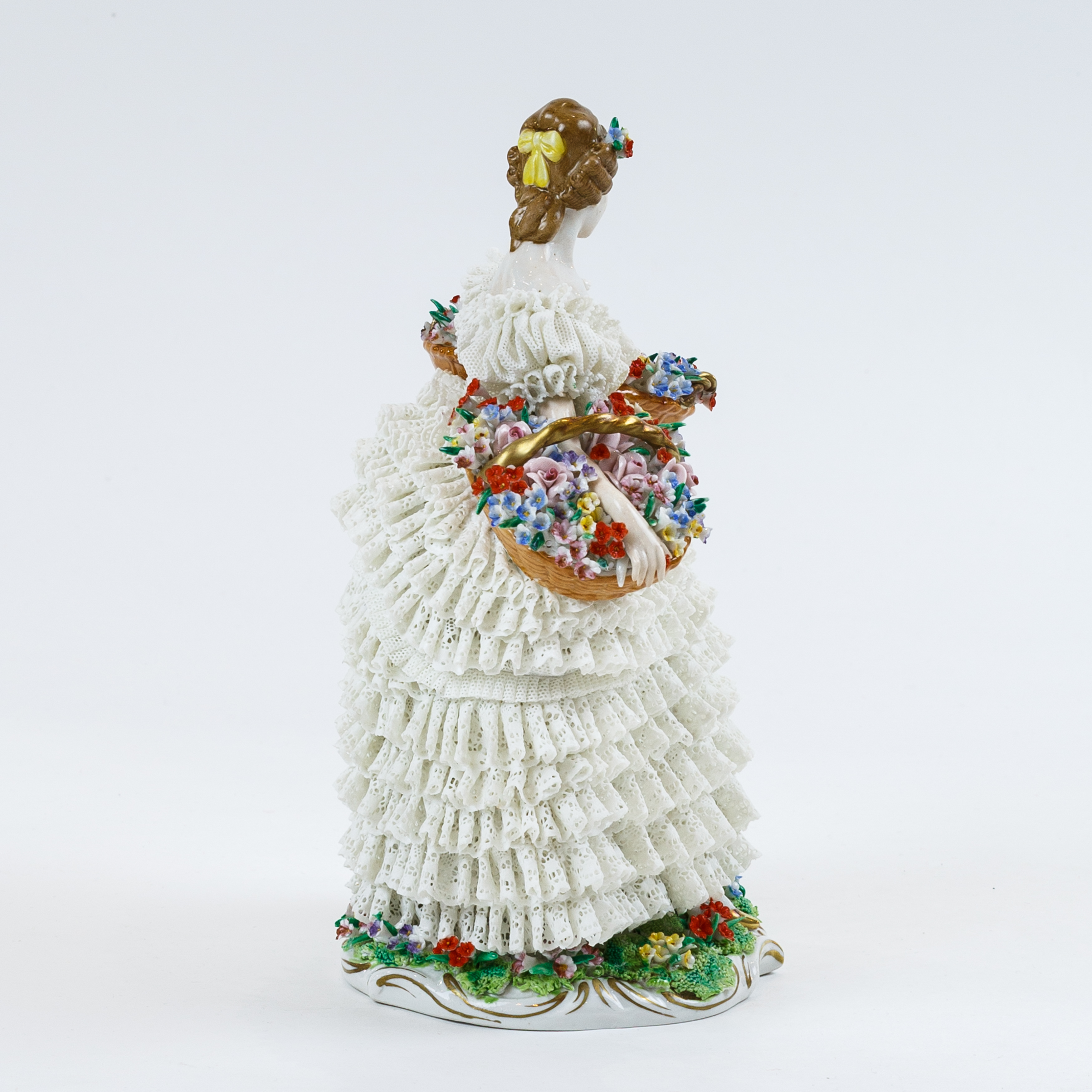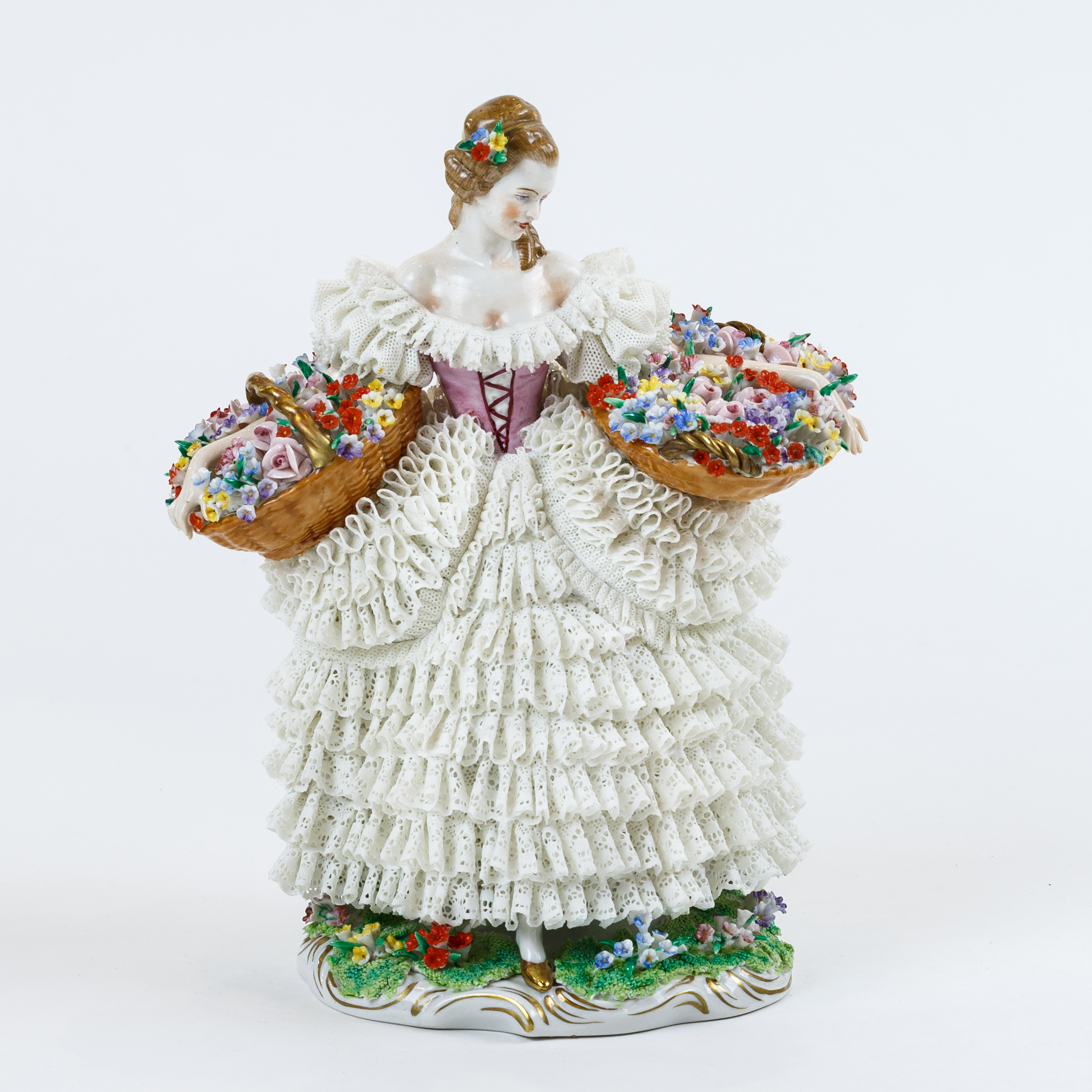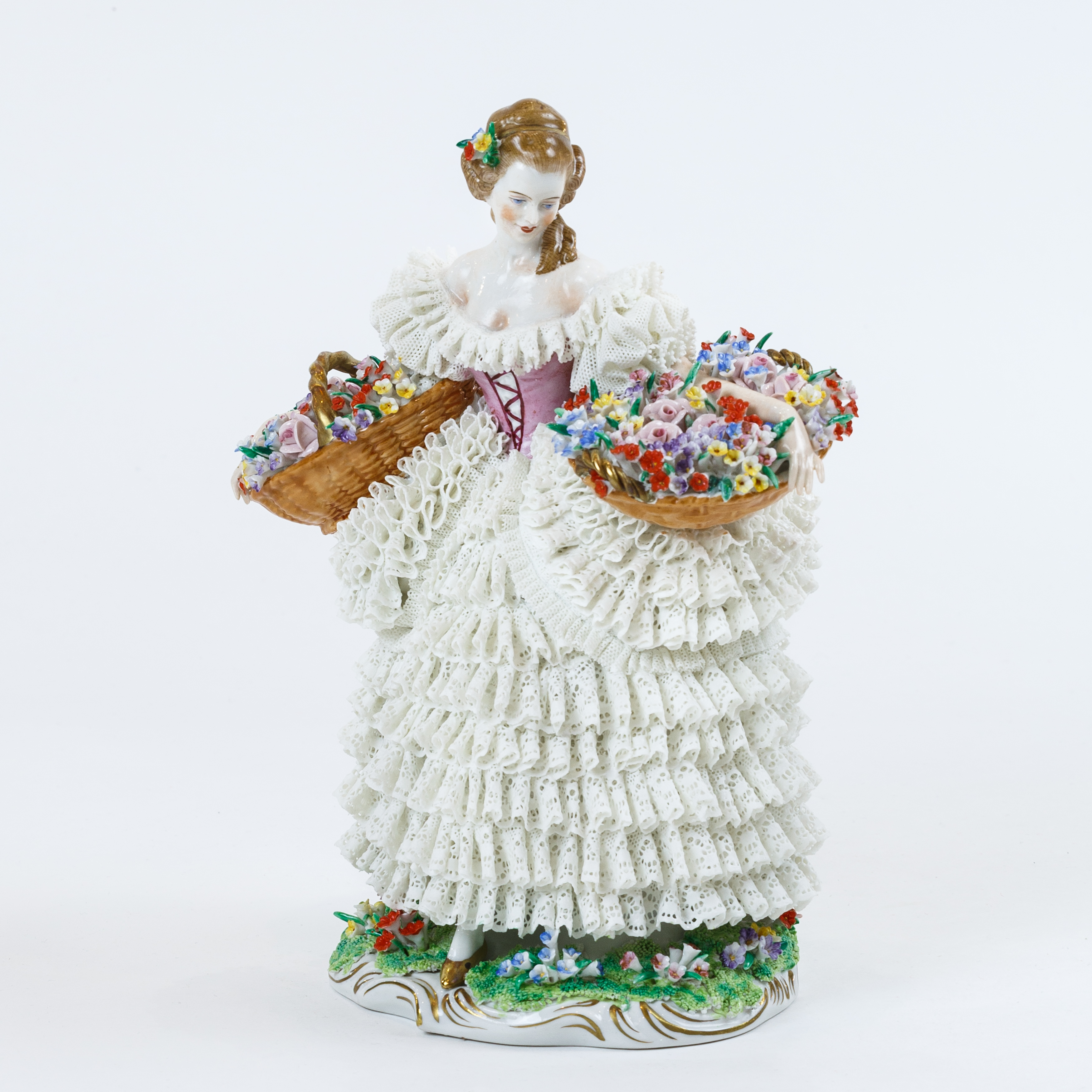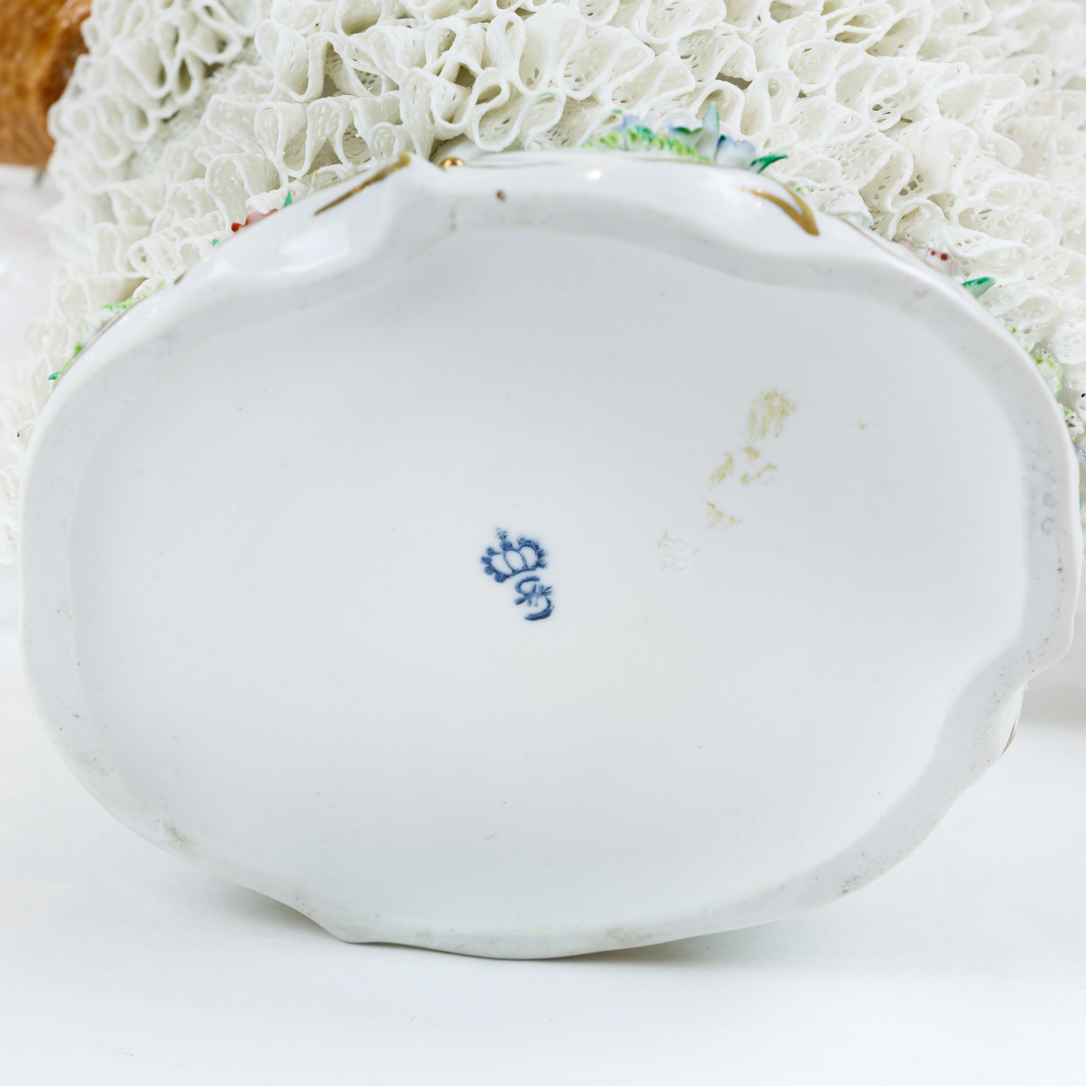 Фарфор, надглазурная полихромная роспись, золочение, кружевной фарфор, клеймо подглазурное кобальтом фарфоровой мануфактуры Зитцендорф, «86» в тесте, высота – 24,5 см.