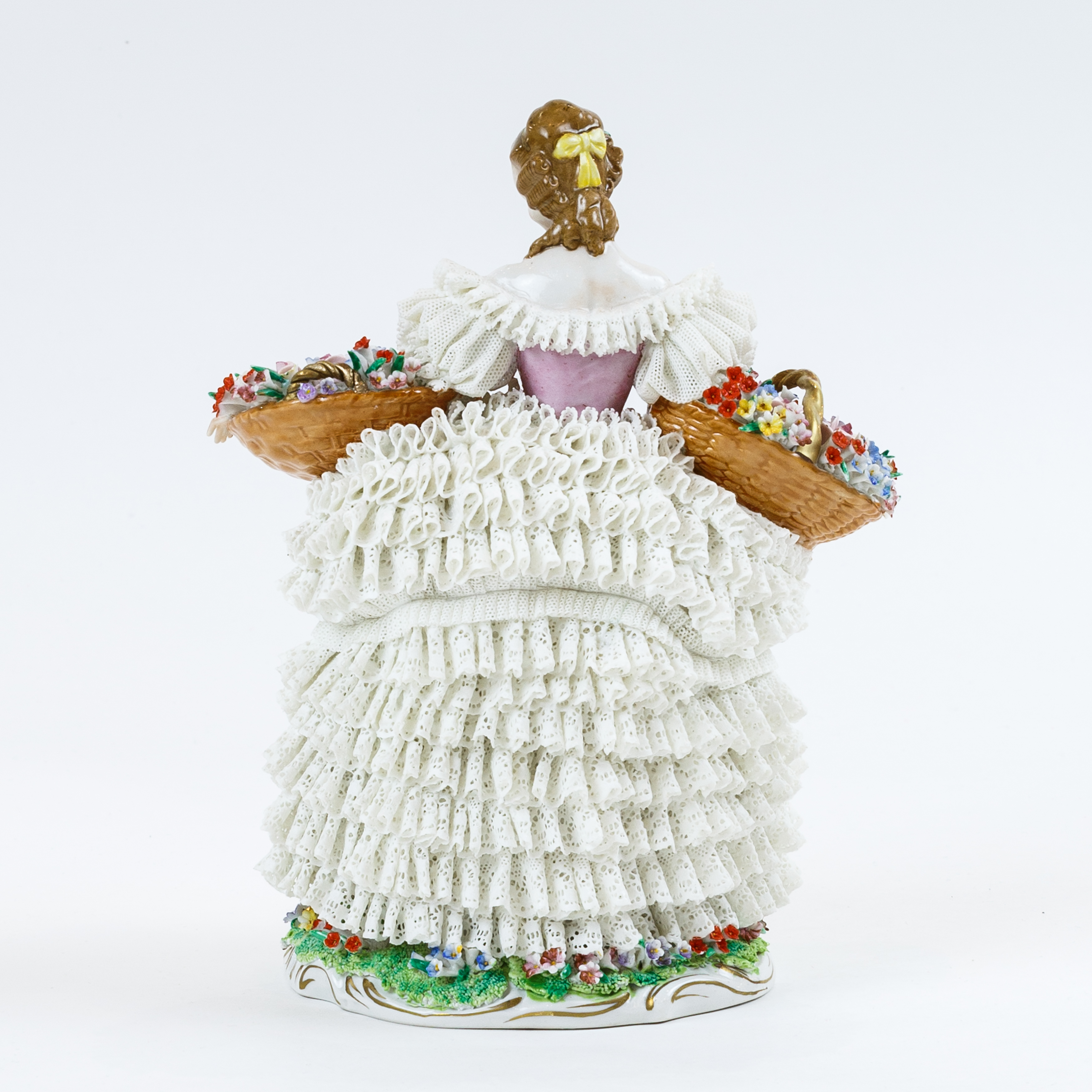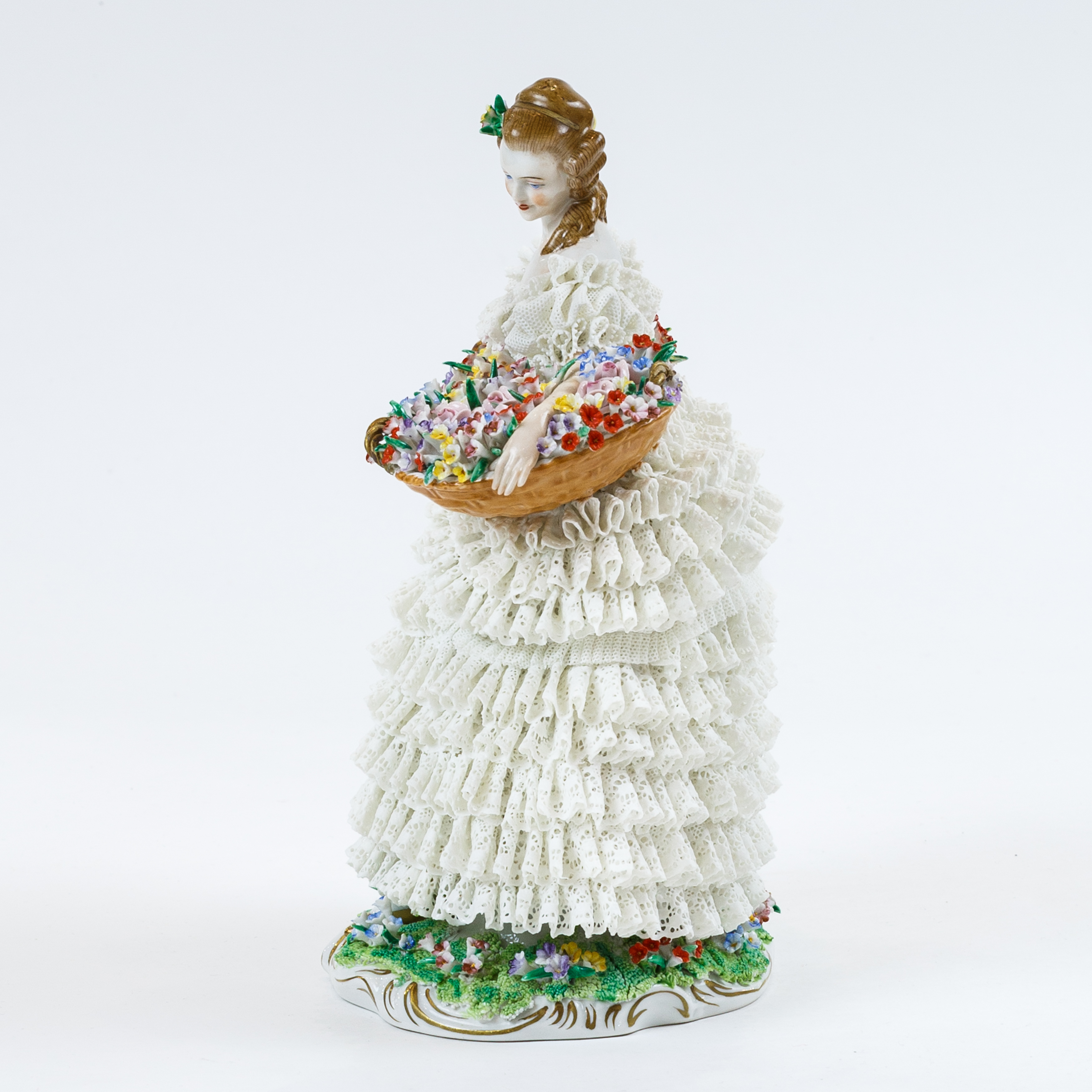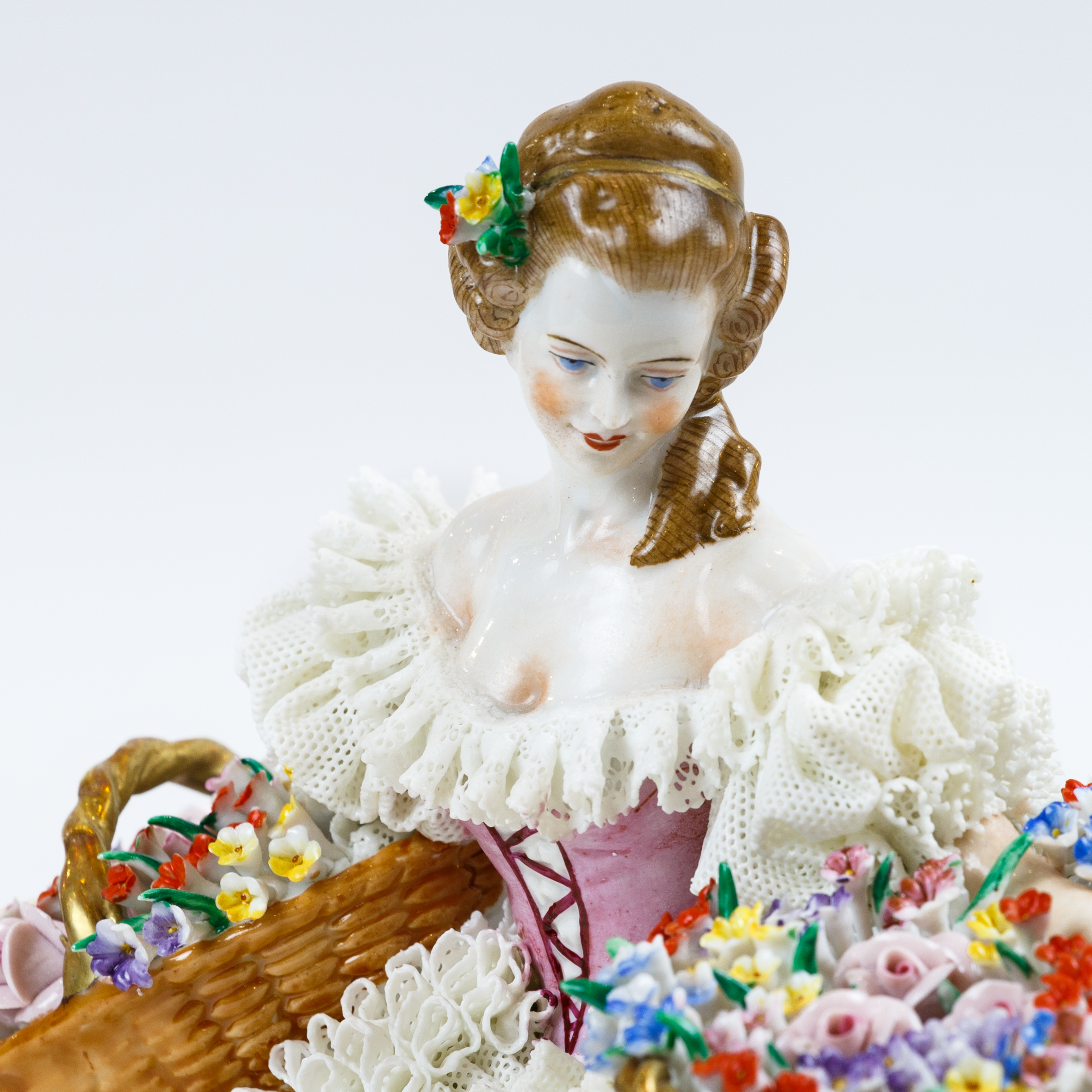 Фарфор, надглазурная полихромная роспись, золочение, кружевной фарфор, клеймо подглазурное кобальтом фарфоровой мануфактуры Зитцендорф, «86» в тесте, высота – 24,5 см.