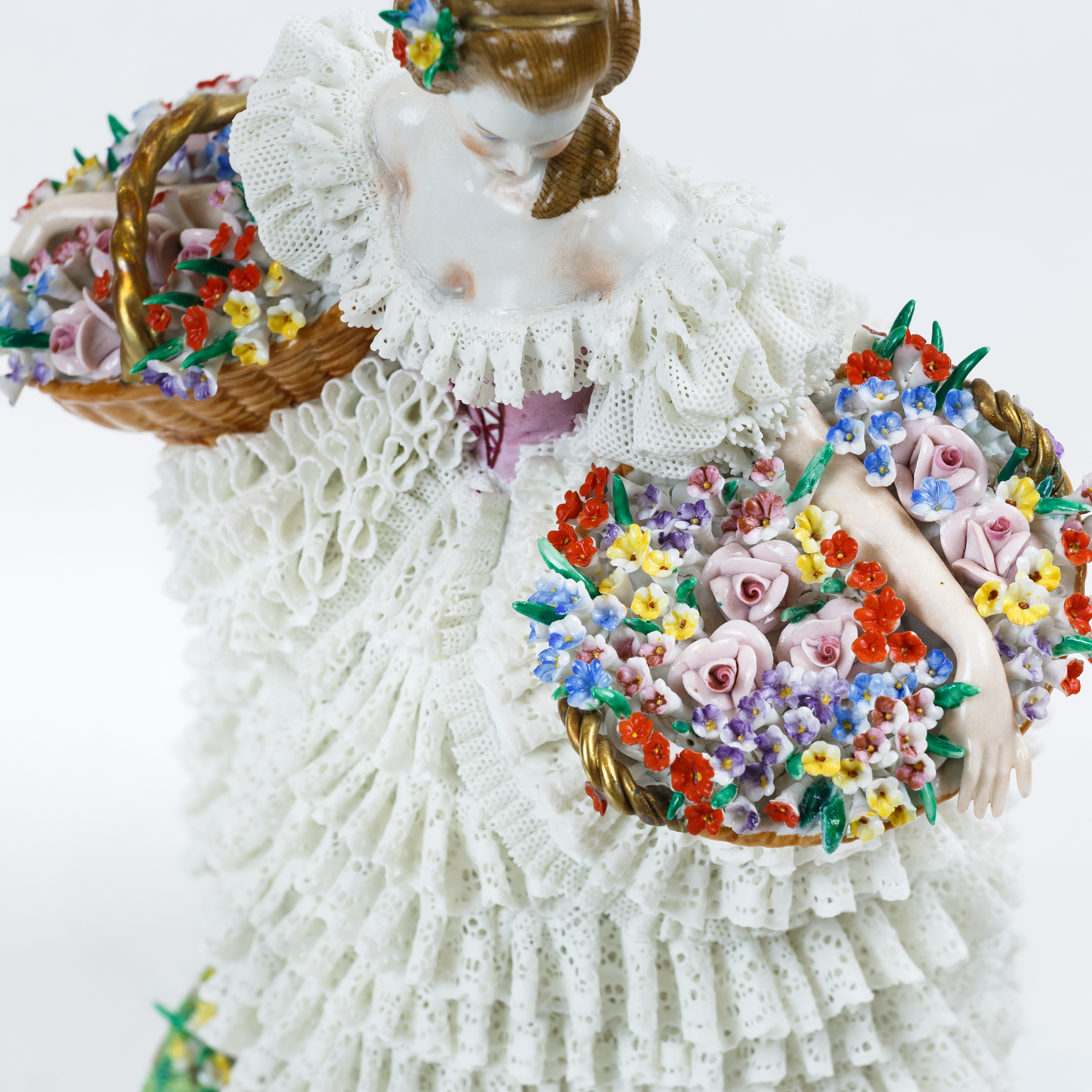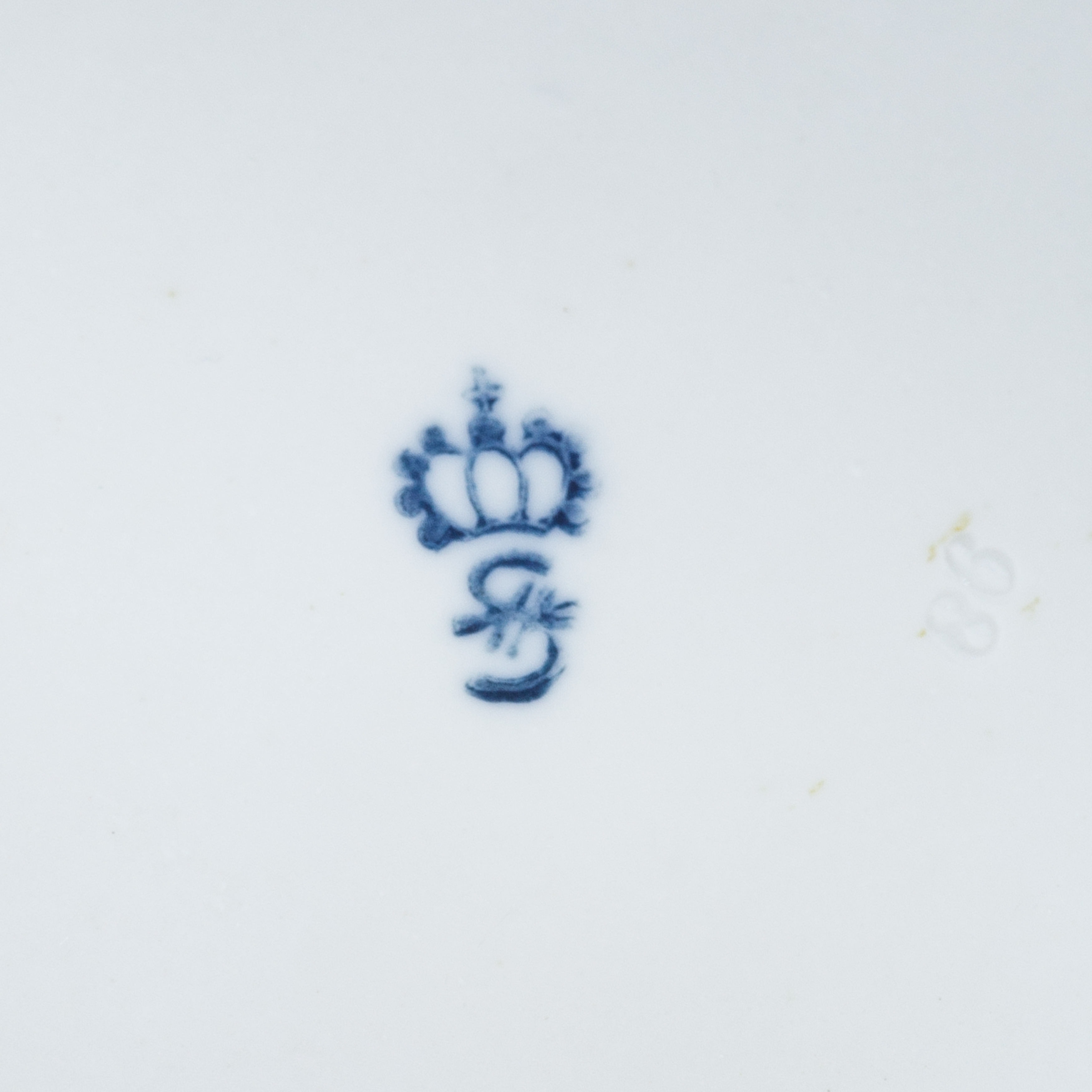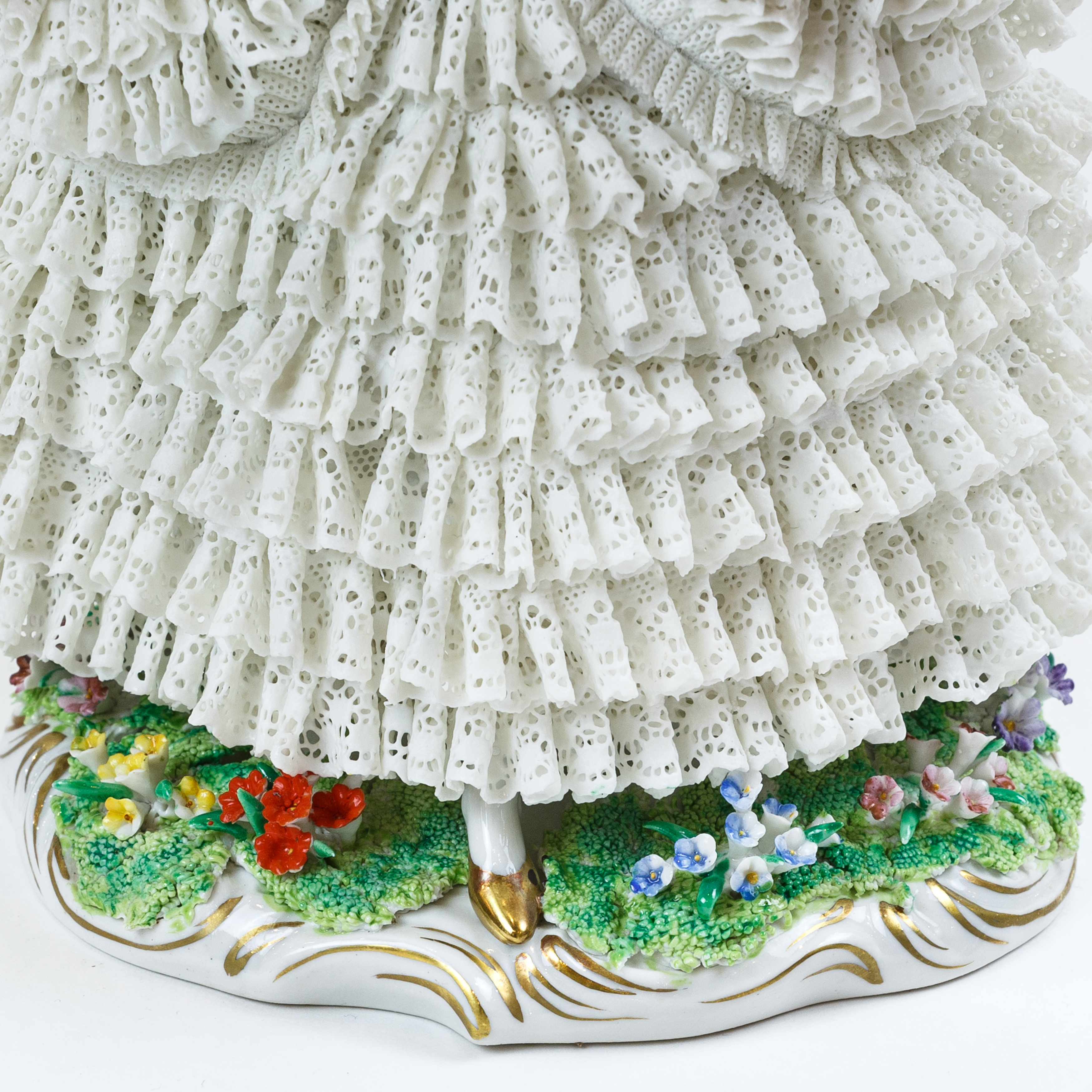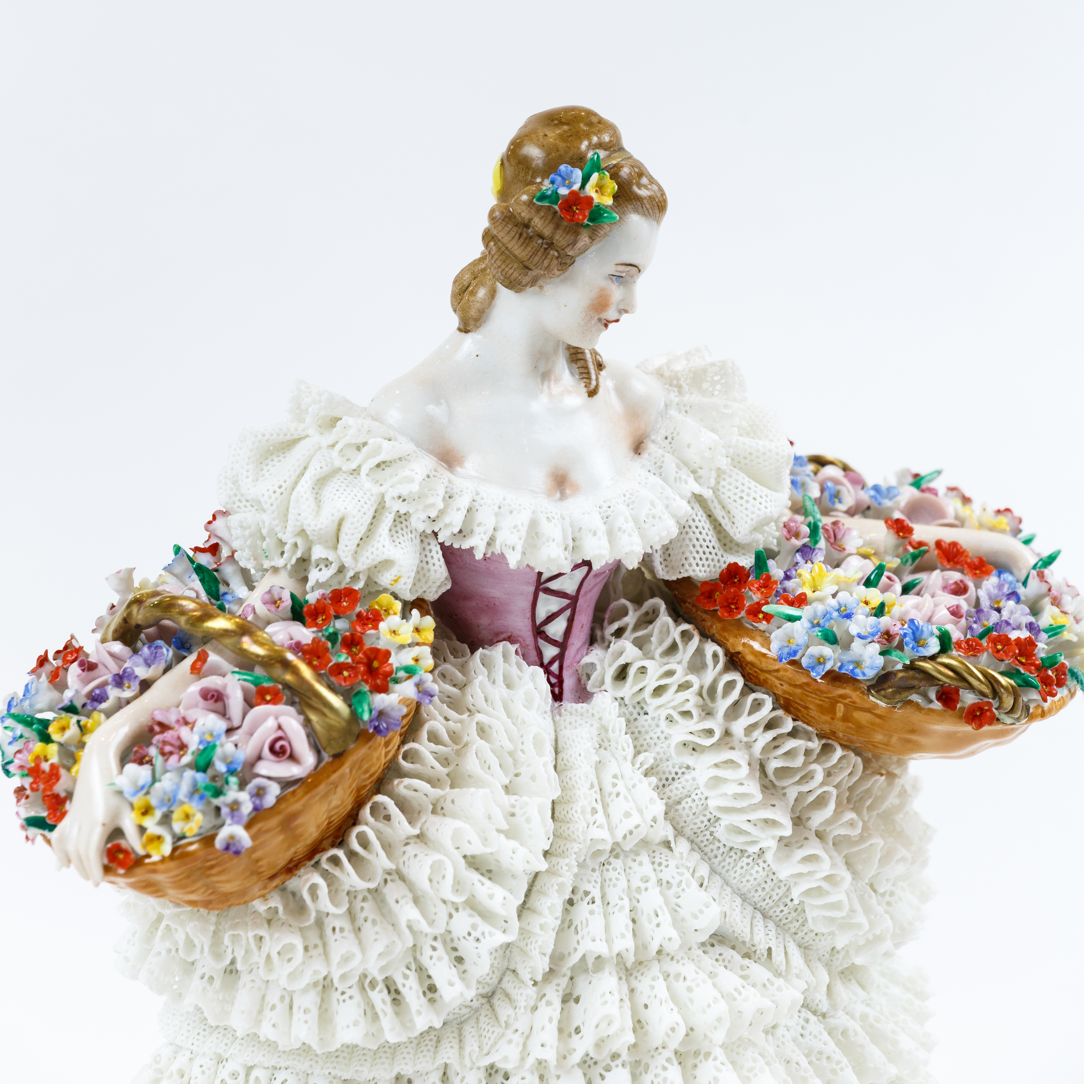 Фарфор, надглазурная полихромная роспись, золочение, кружевной фарфор, клеймо подглазурное кобальтом фарфоровой мануфактуры Зитцендорф, «86» в тесте, высота – 24,5 см.