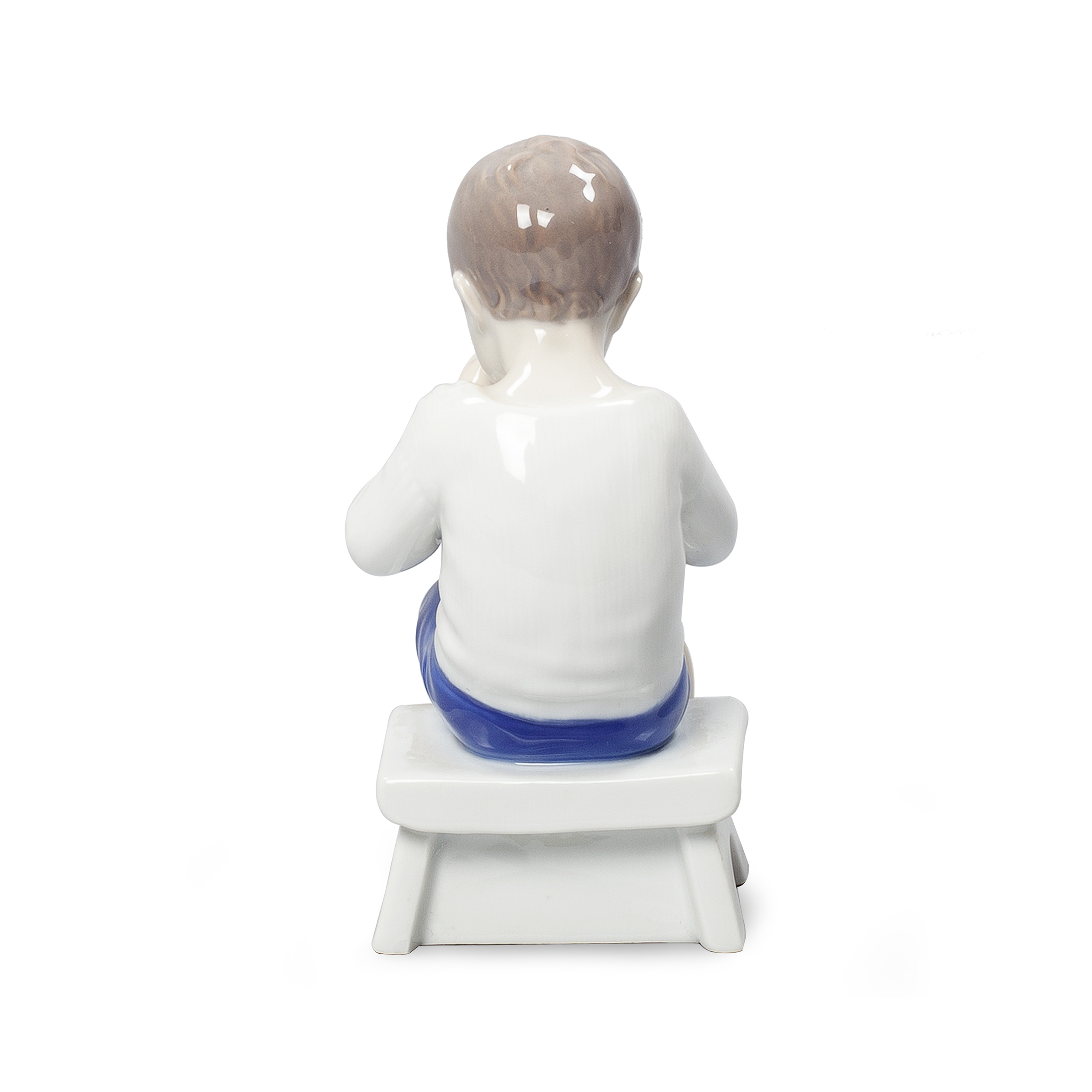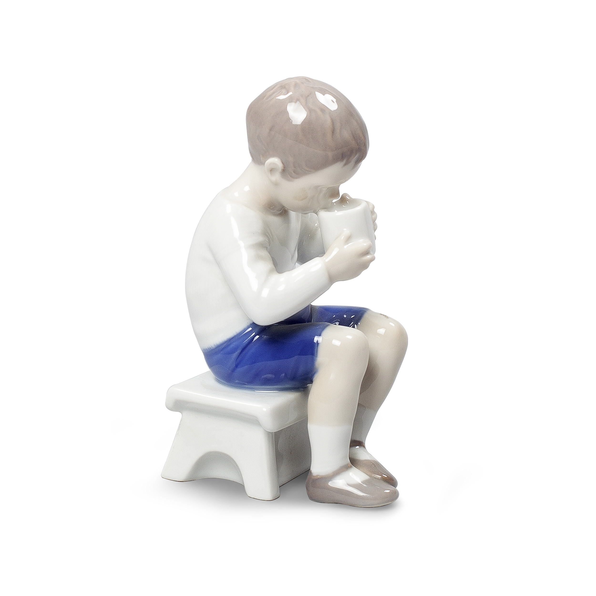 Маленький мальчик, сидящий на невысокой белоснежной скамейке и пьющий молоко из чашки, вызывает самое искреннее умиление благодаря мастерству автора и невероятно гармоничному подбору красок. Естественность и точность исполнения мельчайших деталей статуэтки, легкие пастельные оттенки создают ощущение присутствия, динамики, одушевленности. Такой предмет искусства станет настоящей находкой для коллекции фарфора или же прекрасно дополнит уютную обстановку гостиной.