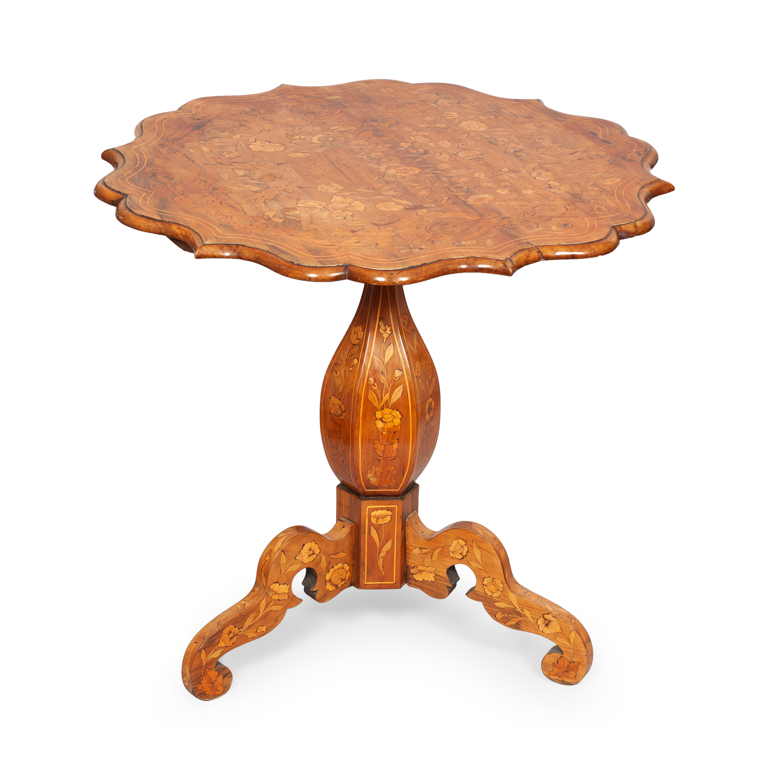 Украшением этого изящного стола выступает замысловатая композиция, выполненная в технике маркетри и помещенная на плоскость столешницы волнистых очертаний. Цветочный мотив, взятый из голландской и фламандской живописи, очень долго сохранял популярность в европейской мебели. Тонкие, флоральные орнаменты и акантовые перевивы обрамляют центральное изображение цветочного букета и античной вазы, украшенной гирляндой-драпировкой. Столешница покоится на балясине-колонне, которая переходит в основание треножник, также украшенные в технике маркетри.