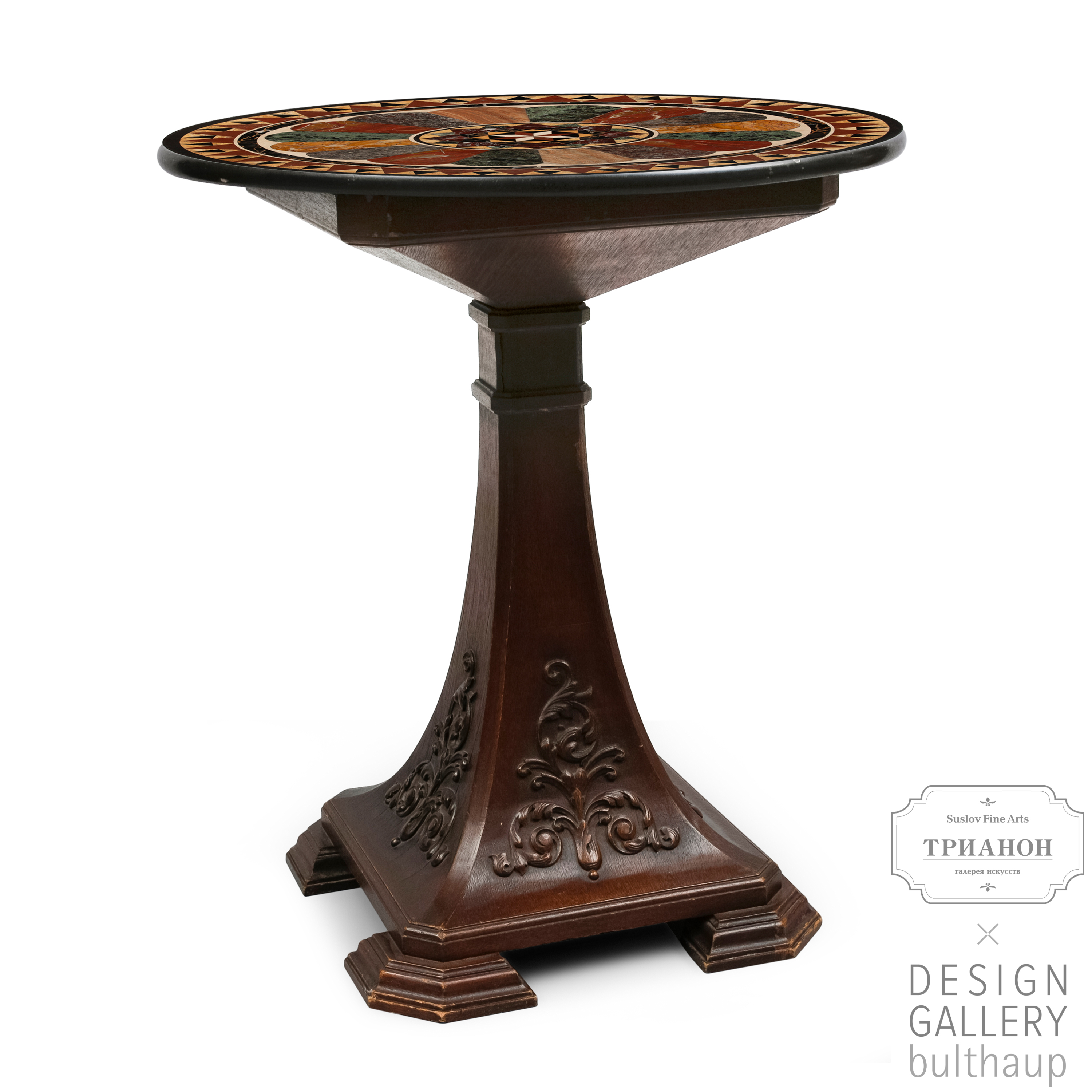 Столешница – флорентийская мозаика («pietra dura» итал. «поделочный камень»), подстолье – орех, массив, резьба.