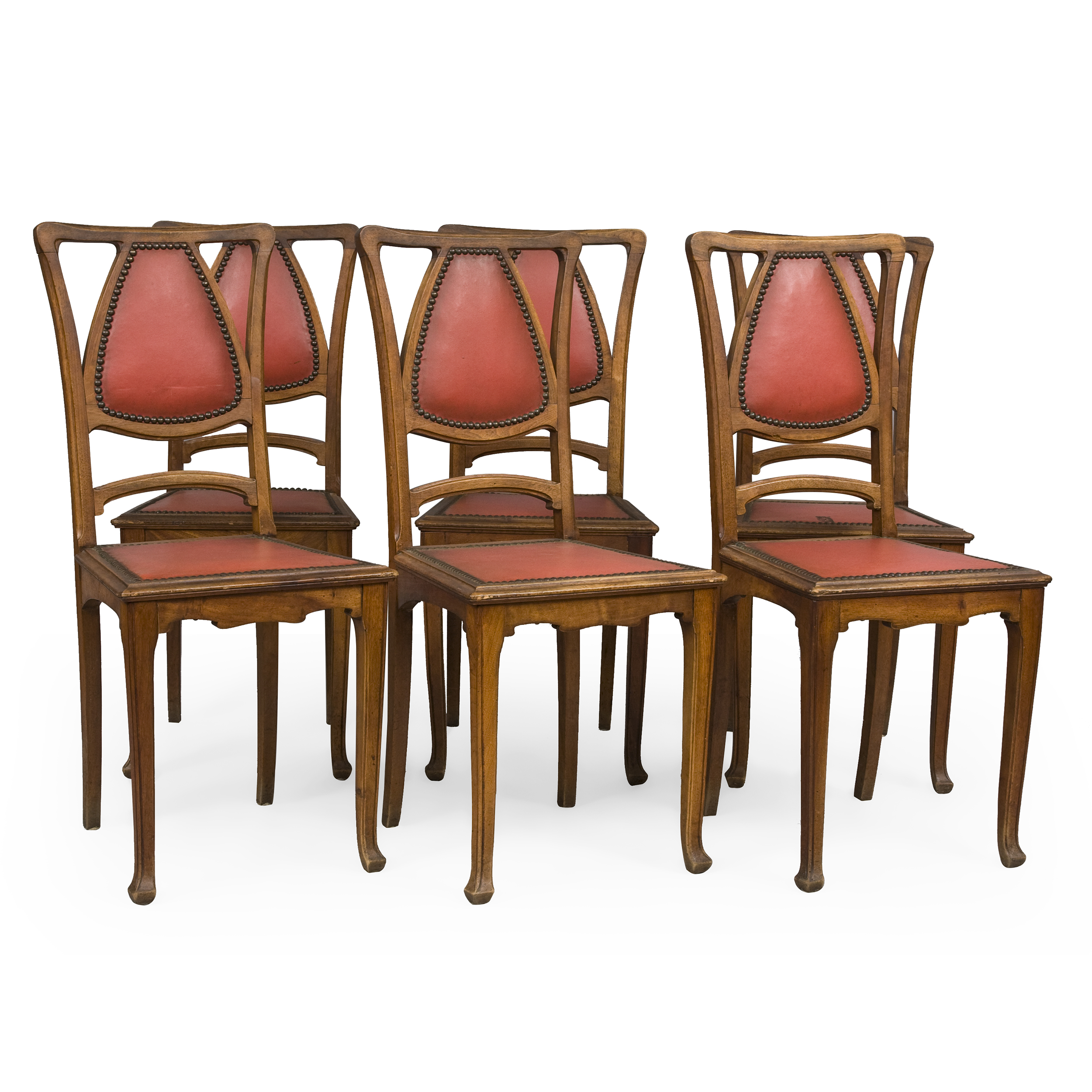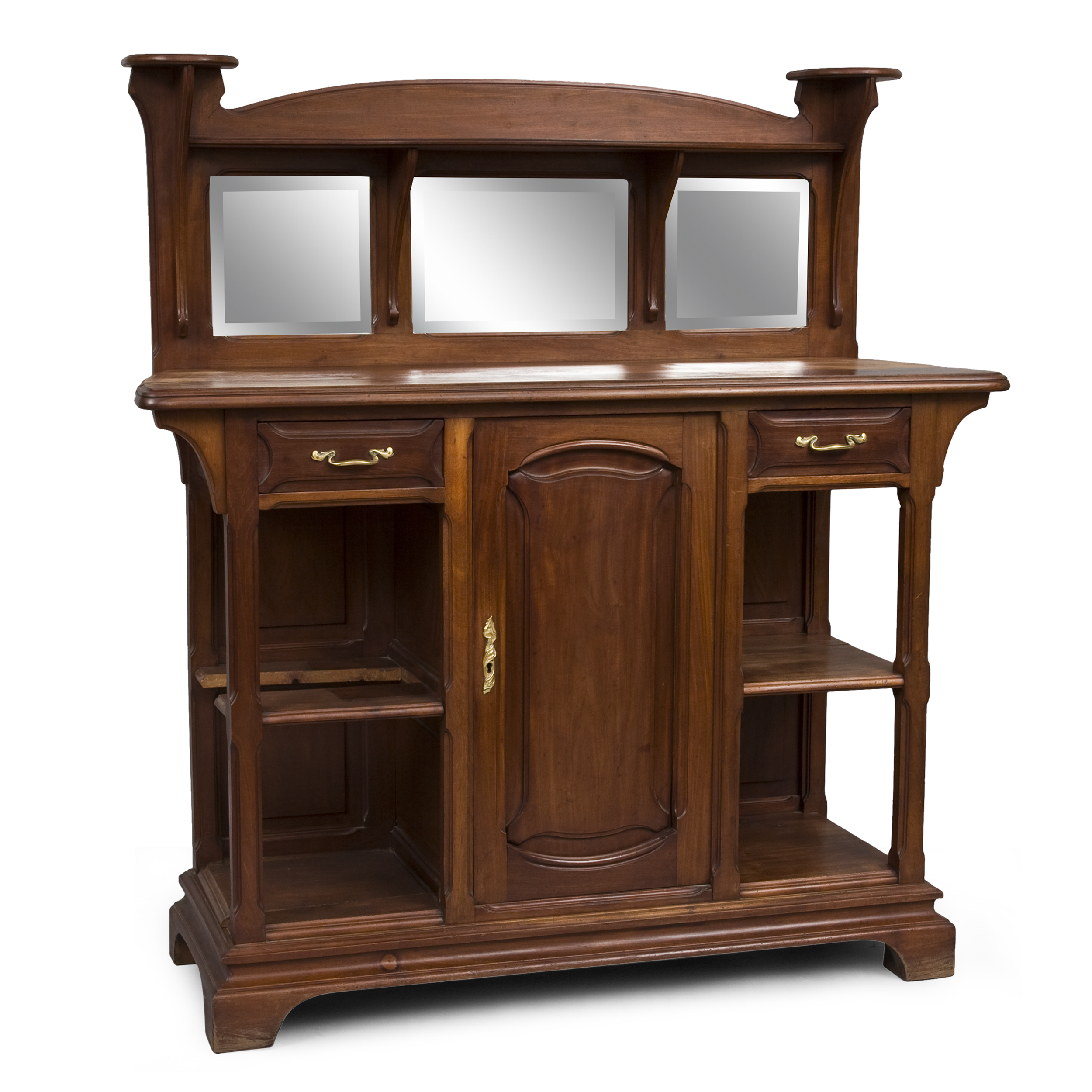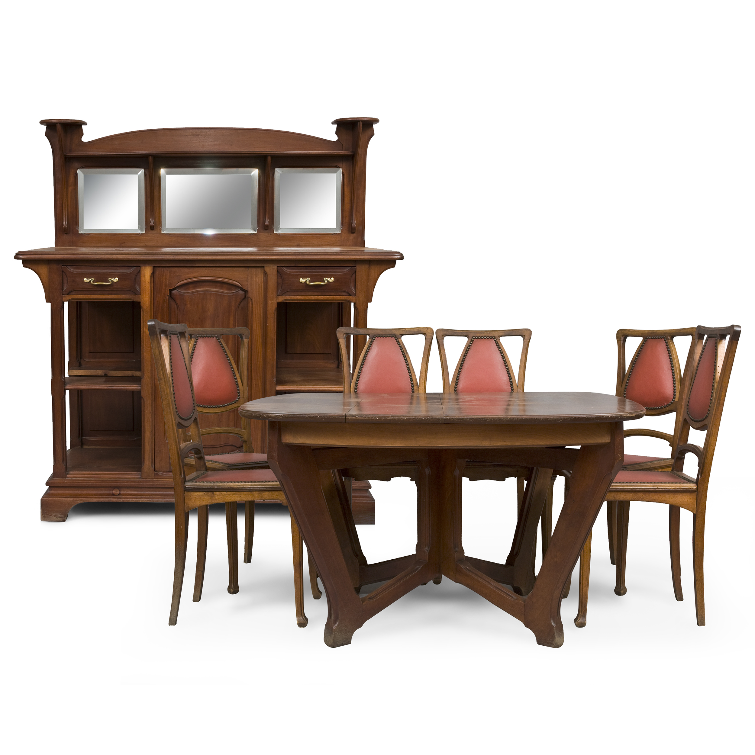 Полубуфет, стол и шесть стульев. Орех, массив, кожа, зеркала с фацетом, Франция, начало ХХ века, размеры (в/ш/г): полубуфет - 144 х 133 х 45 см,