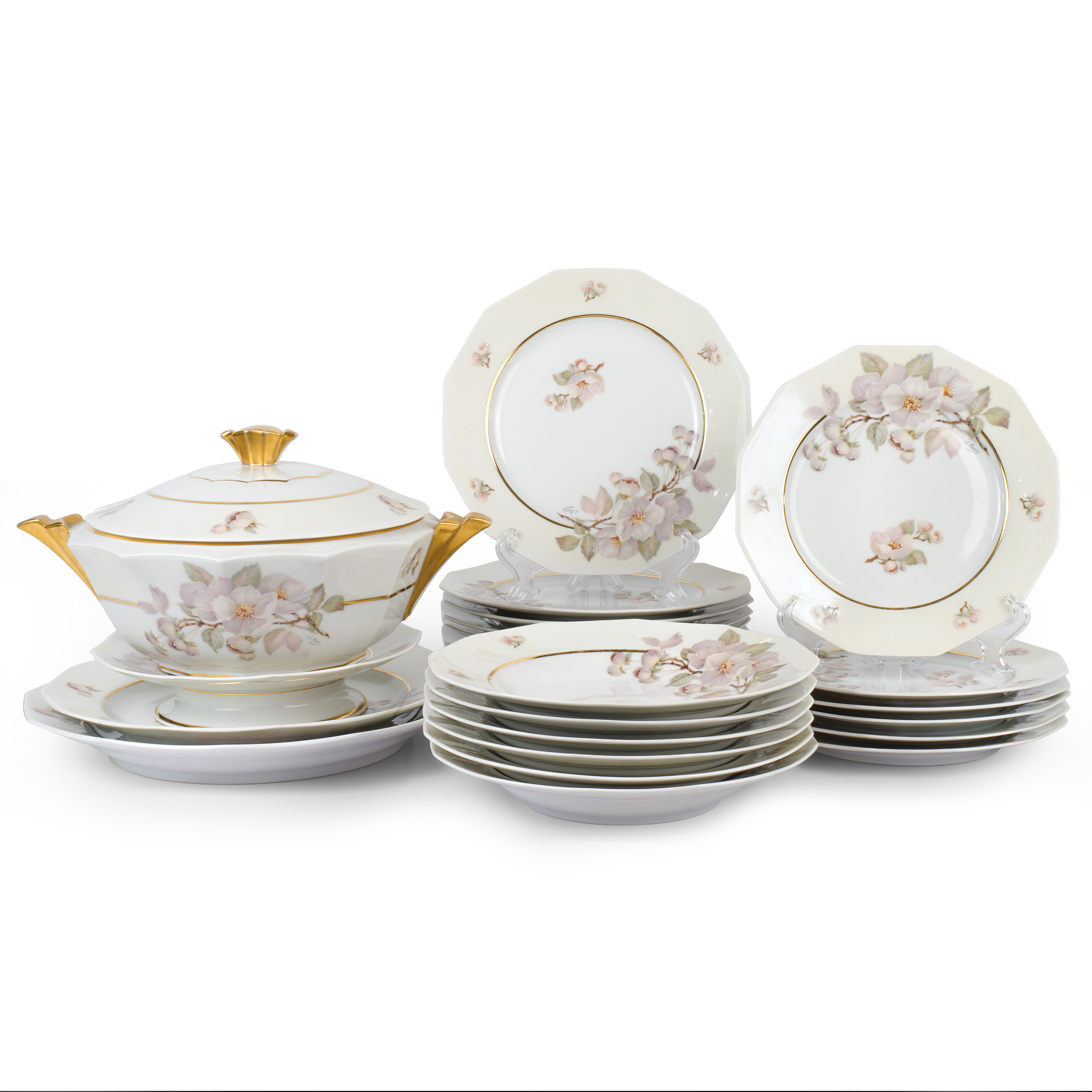 27 предметов: супница, тарелка для десертов, тарелки плоские малые - 6 шт, суповые тарелки 6 шт, большие плоские тарелки 8 шт, малое блюдо, большое блюдо.