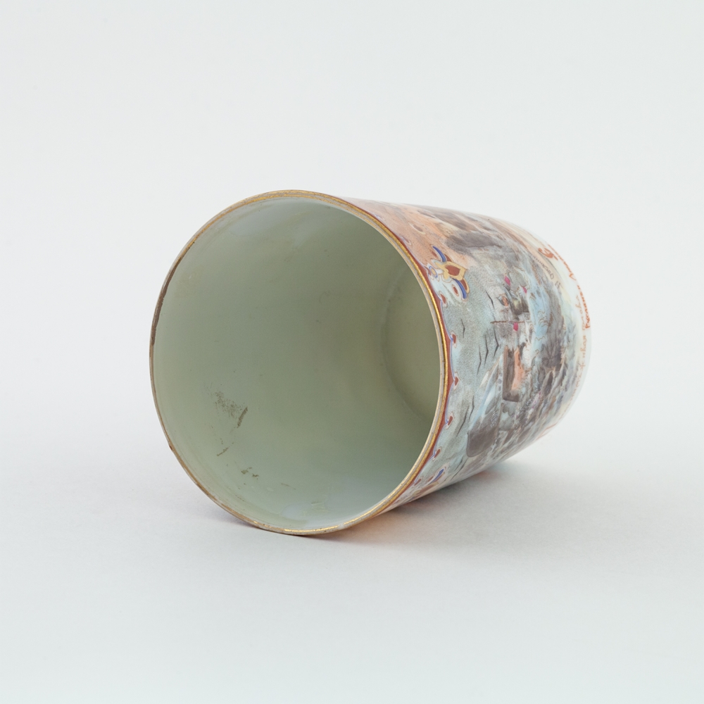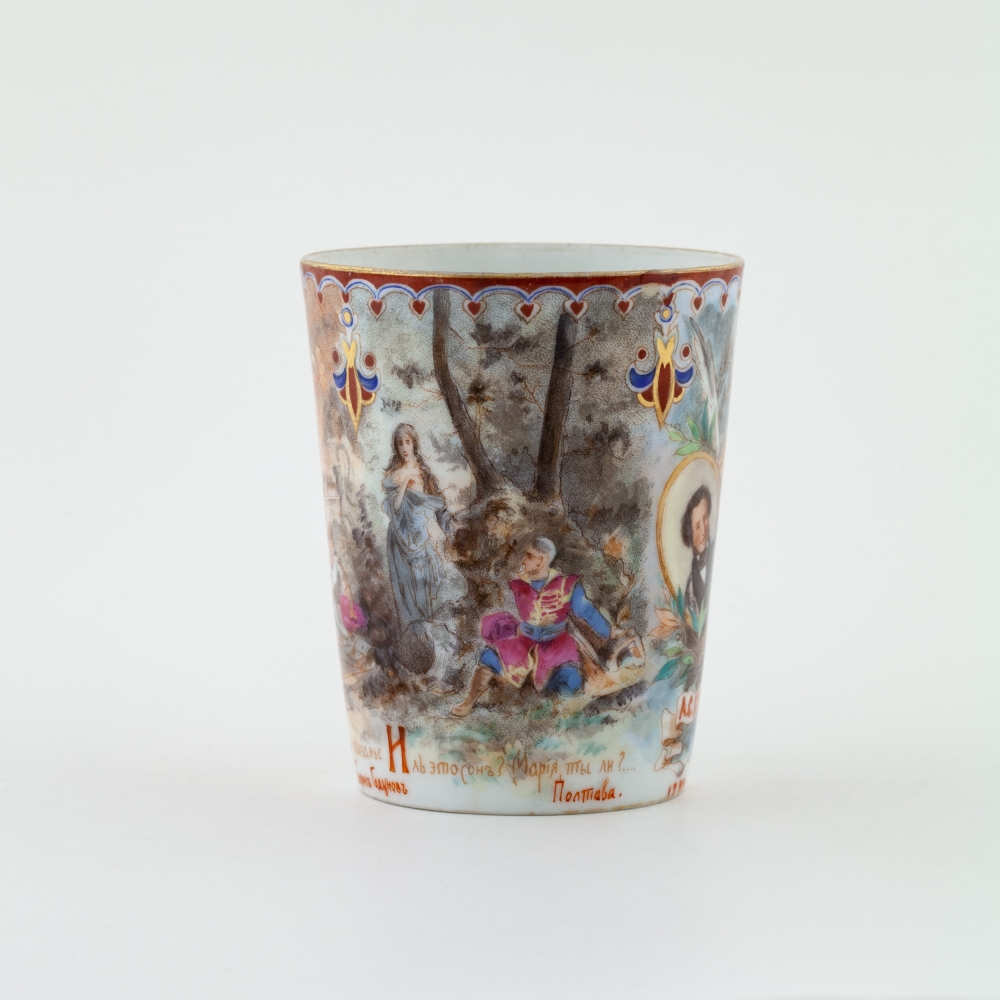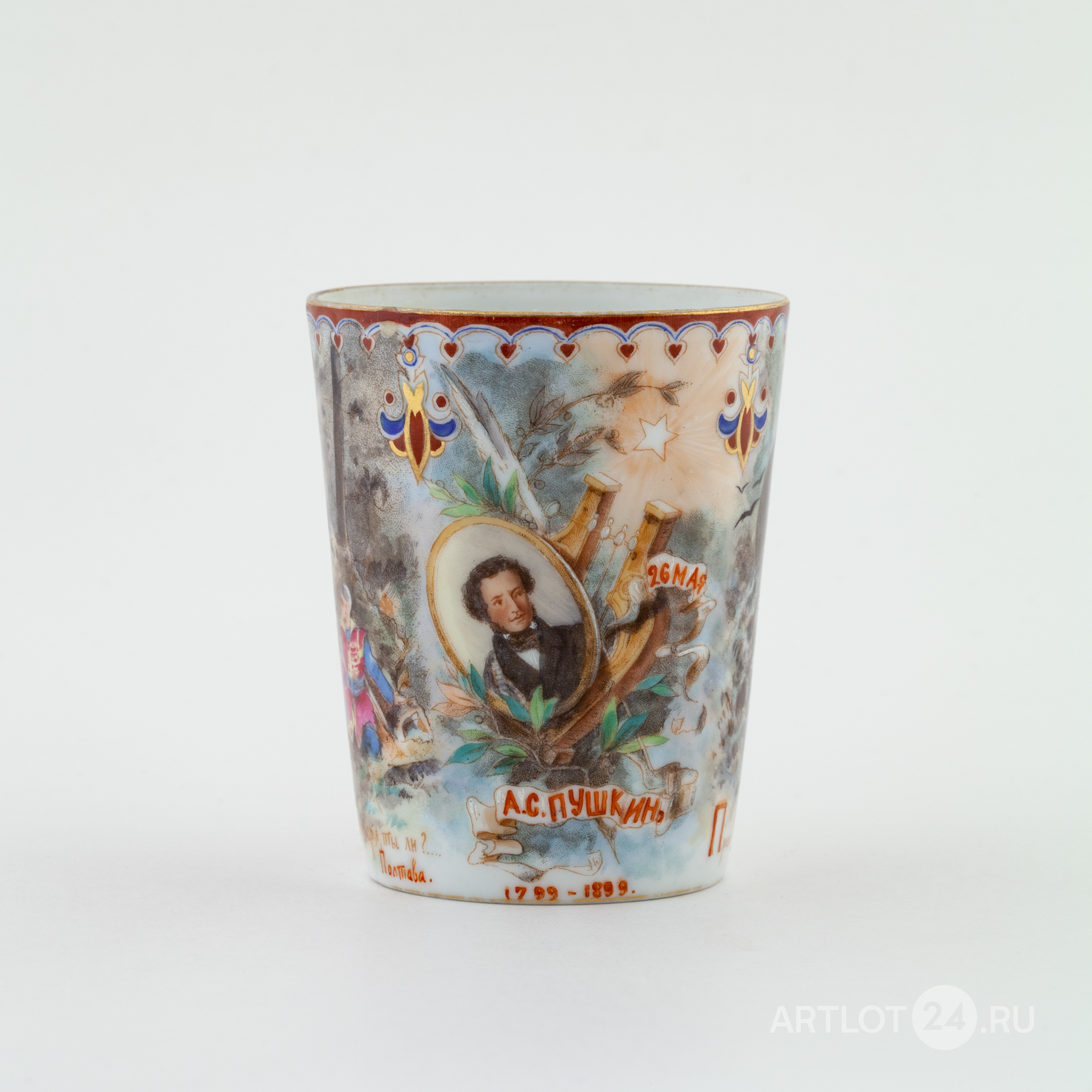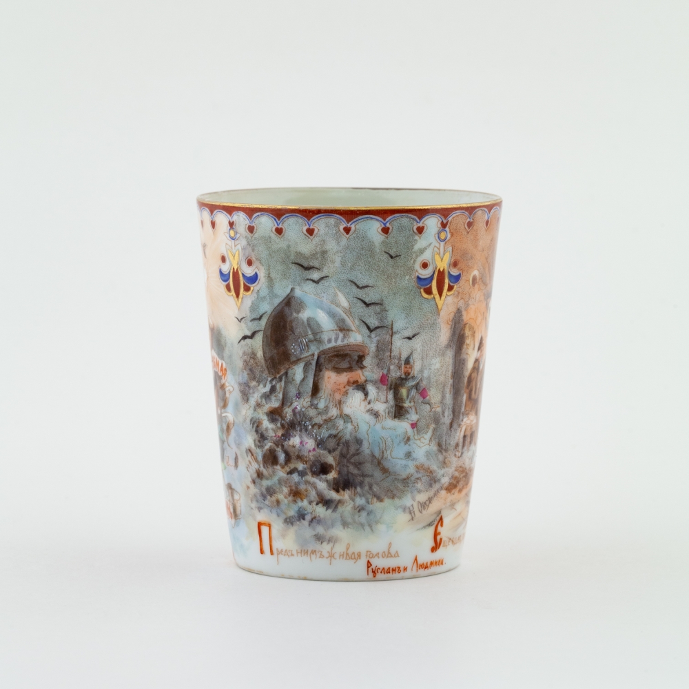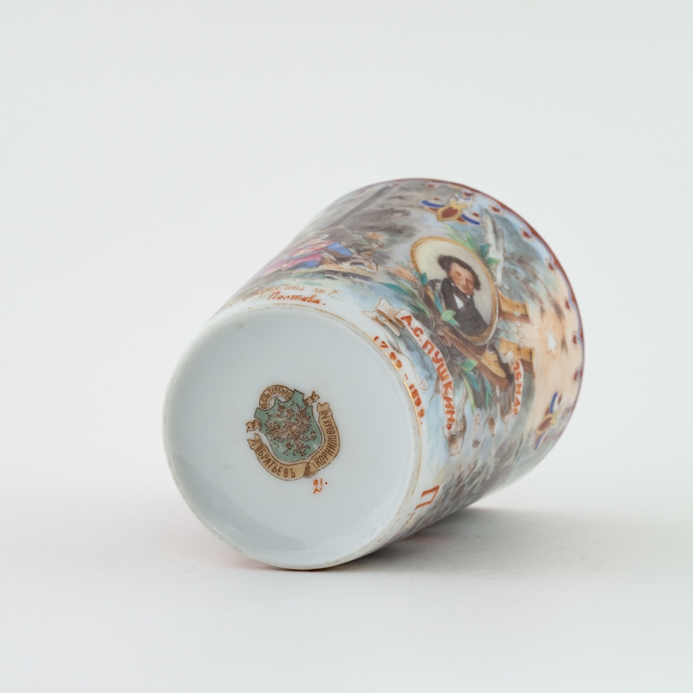 С изображением героев его произведений. Фарфор, деколь с подрисовкой, золочение, клеймо надглазурное печатное завода братьев Корниловых, Санкт-Петербург, 1899 – 1917 годы, высота – 9,5 см