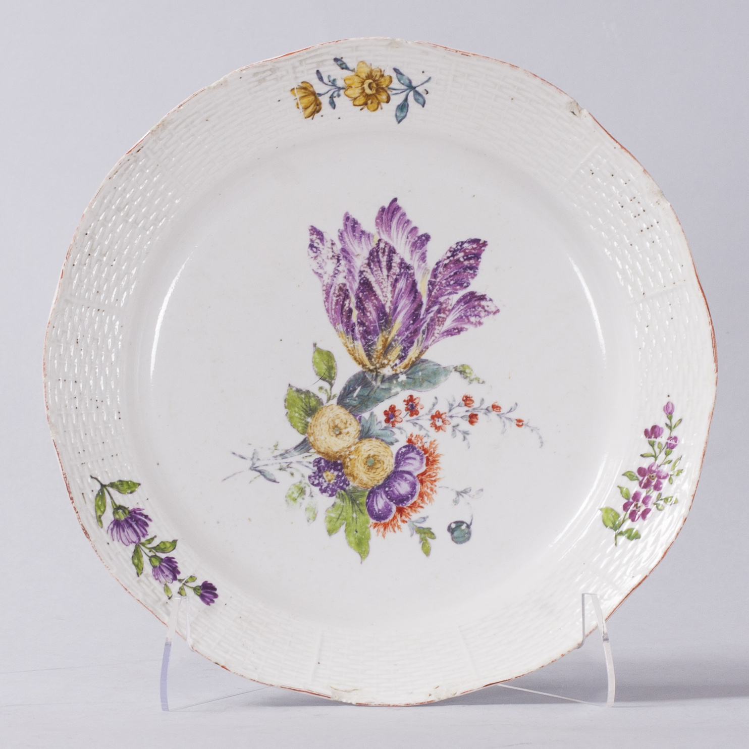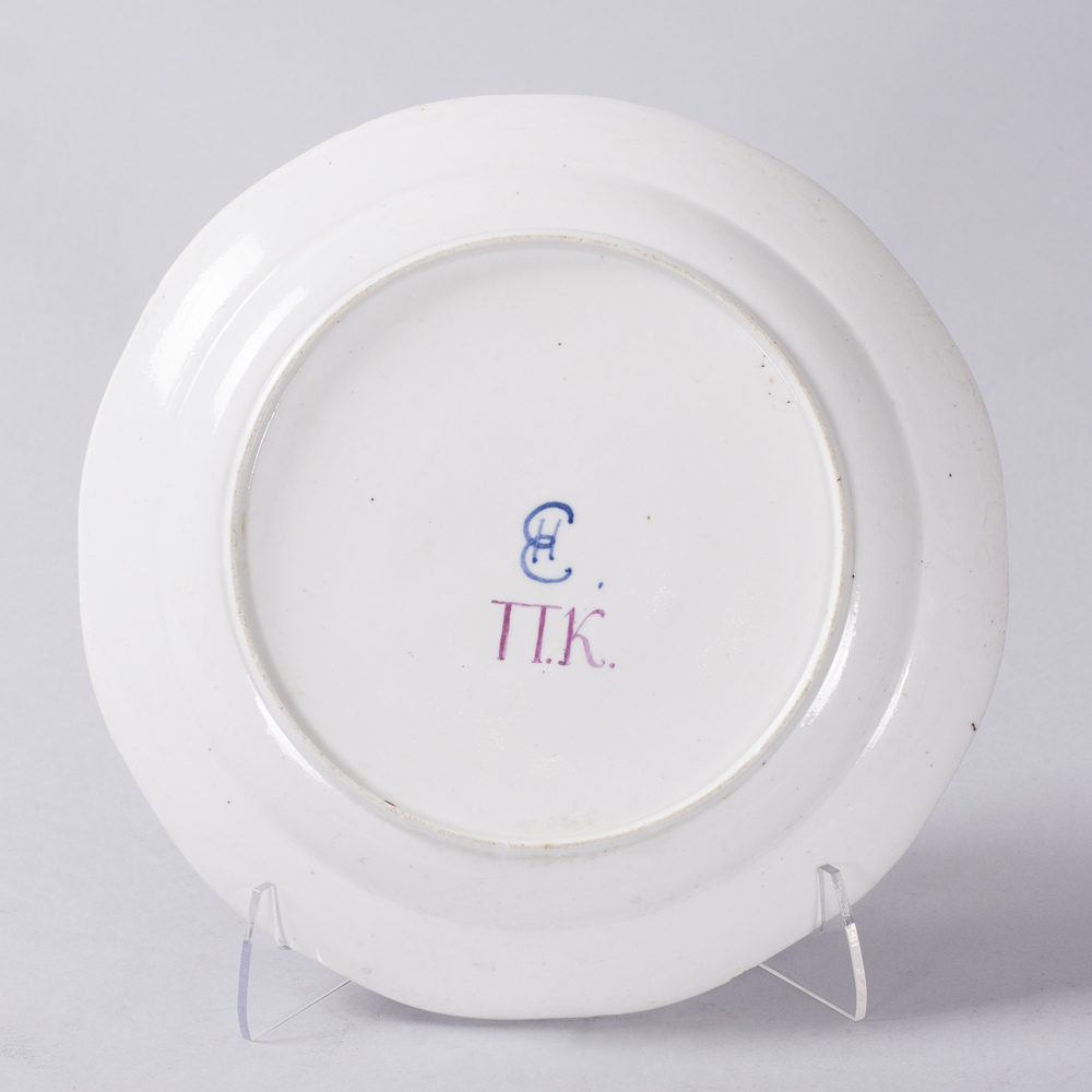 Тарелка из Вседневного сервиза "Сервиз с розанами". Фарфор, надглазурная полихромная роспись, синяя подглазурная марка от руки «Е II», пурпуром от руки - надглазурная аббревиатура «П. К.» (Придворная контора), Россия, (ИФЗ), Императорский фарфоровый заво
