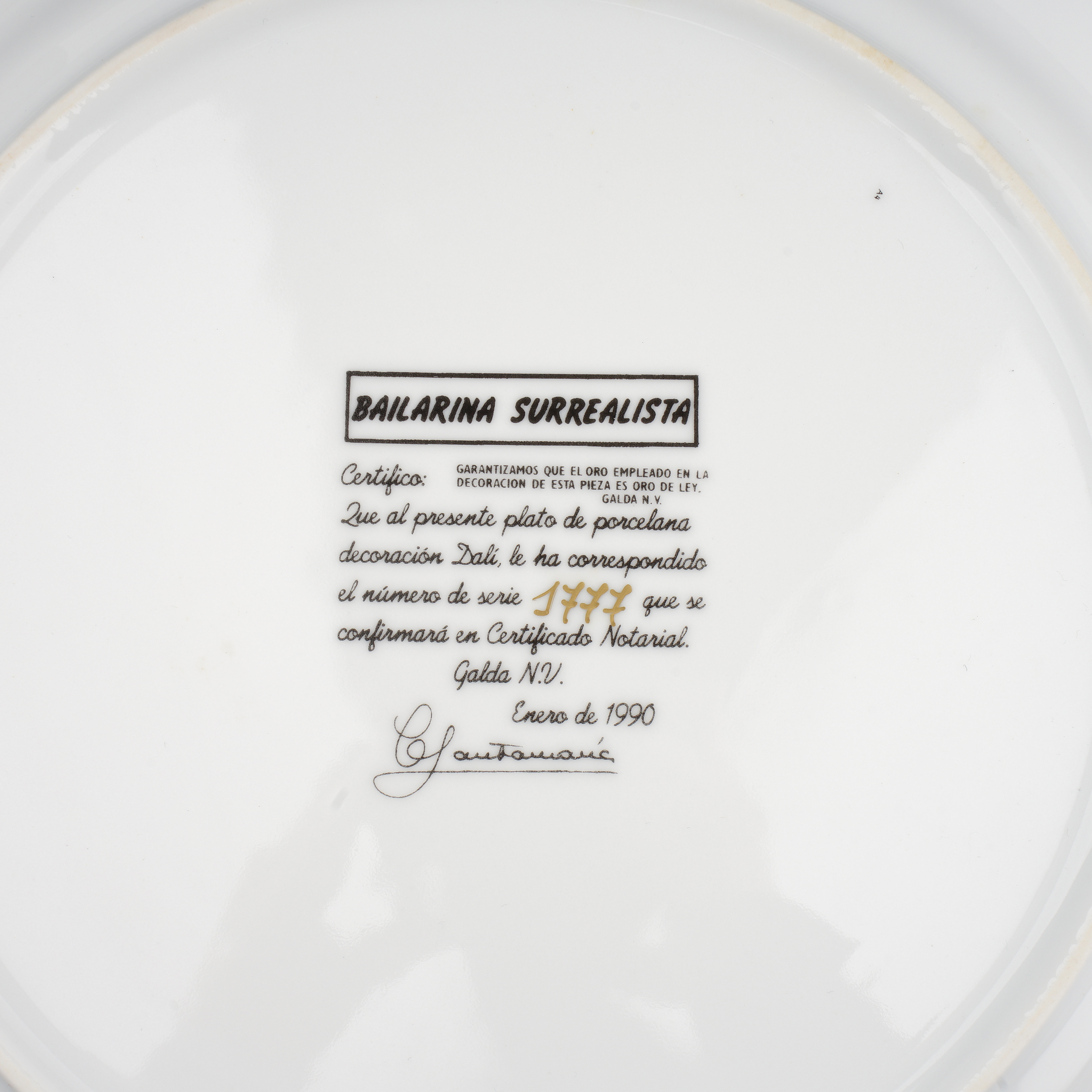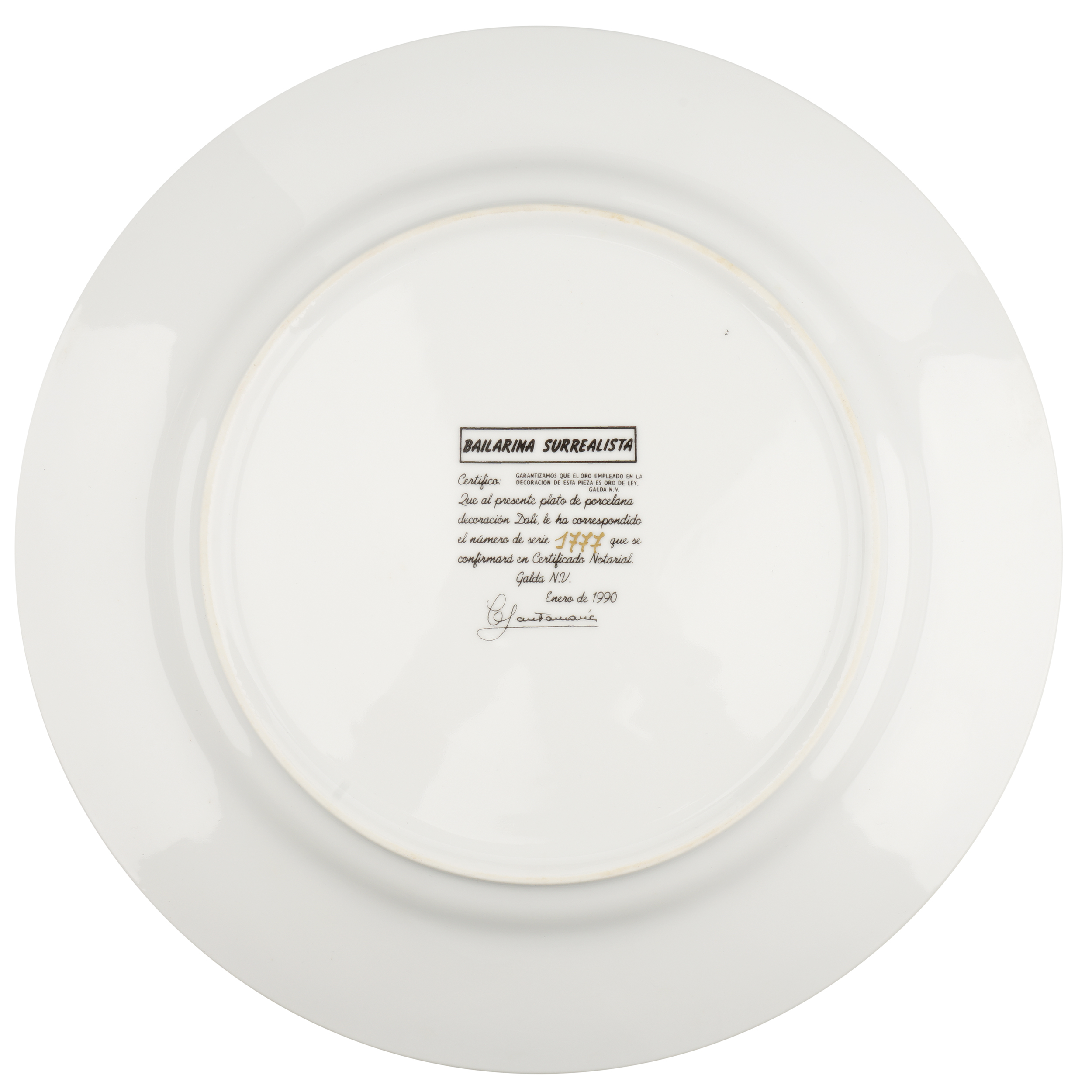 Фарфор, сериграфия, золочение, №1777 золотом на оборотной стороне, Dalí Porcelanas Galda N.V., диаметр – 30,6 см. В родном картонном футляре с сертификатом подлинности.