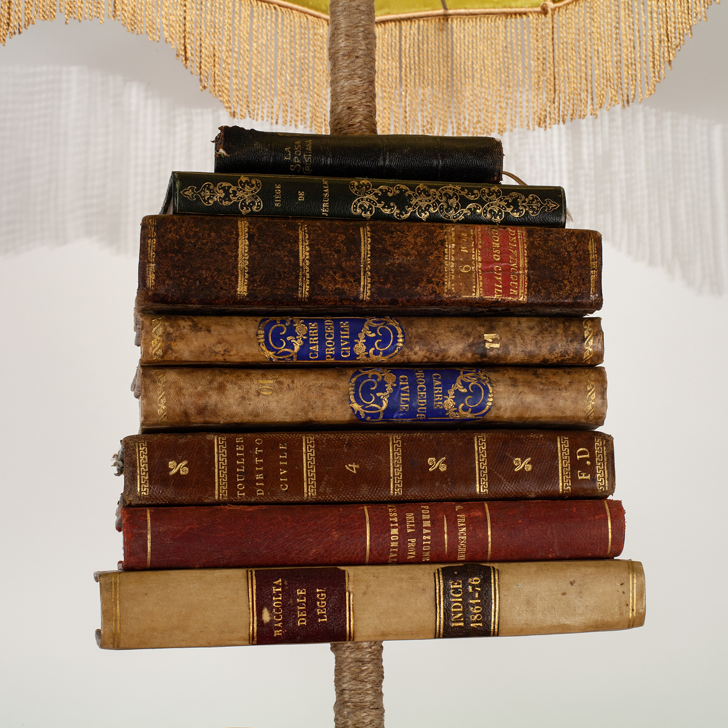 Выполнен в виде тенорной тубы (эуфониума) и стопок старинных книг. Медный сплав, папье-маше, бумага, коленкоровые переплеты с золотым тиснением по корешку; на корпусе духового инструмента штамп «FABRICATION ARTISTIQUE», «MILLEREAU H. SCHOENAERS succR, Brevete` du Conservatoire, 66 Rue D`angoule`me, PARIS», художественное производство Франсуа Миллеро, Франция, конец XIX – начало XX века, высота - 200 см, основание - 28 х 20 см, современный абажур – 60 х 60 см