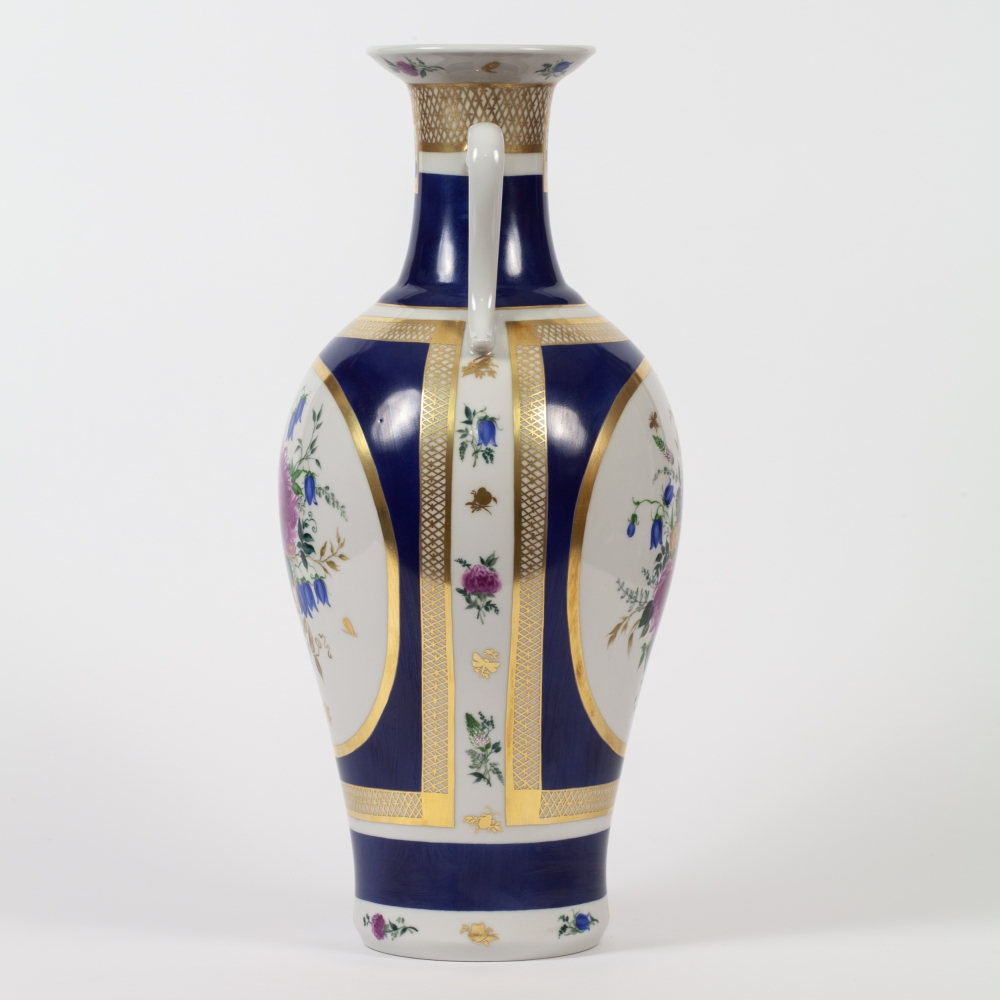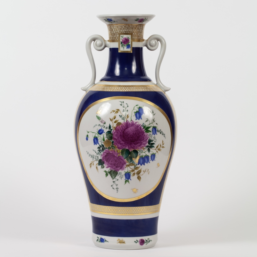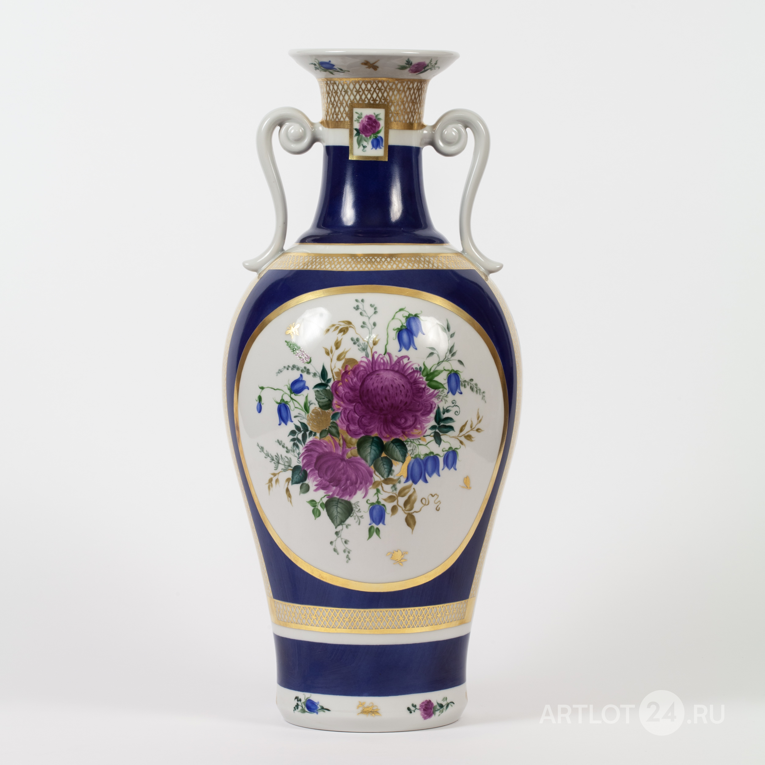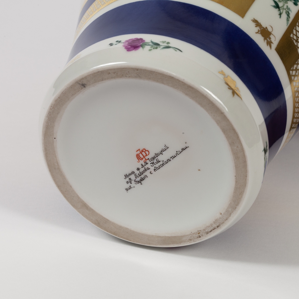 Фарфор, крытье, полихромная надглазурная роспись, золочение, марка красная печатная «ЛФЗ» и подпись: «Автор ф. В.М. Городецкий, худ. Павлова Н.М., рис. «Букет с колокольчиками», автор формы «Малая ленинградская» В.М. Городецкий (1924-1977), Ленинградский фарфоровый завод, 1980-1991 годы, высота – 48,4 см