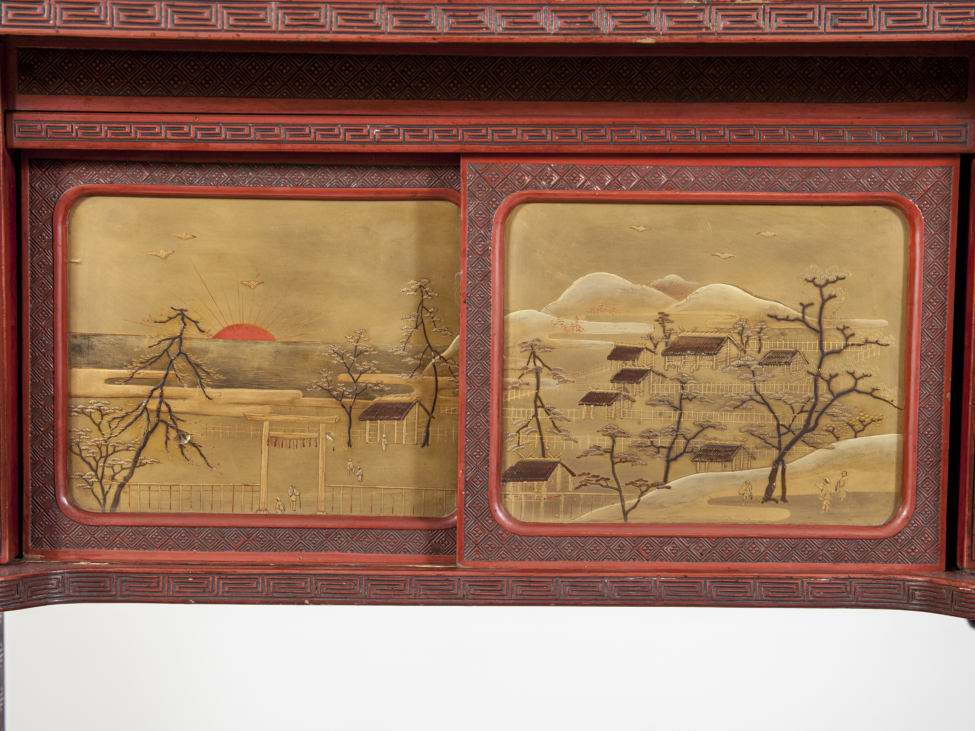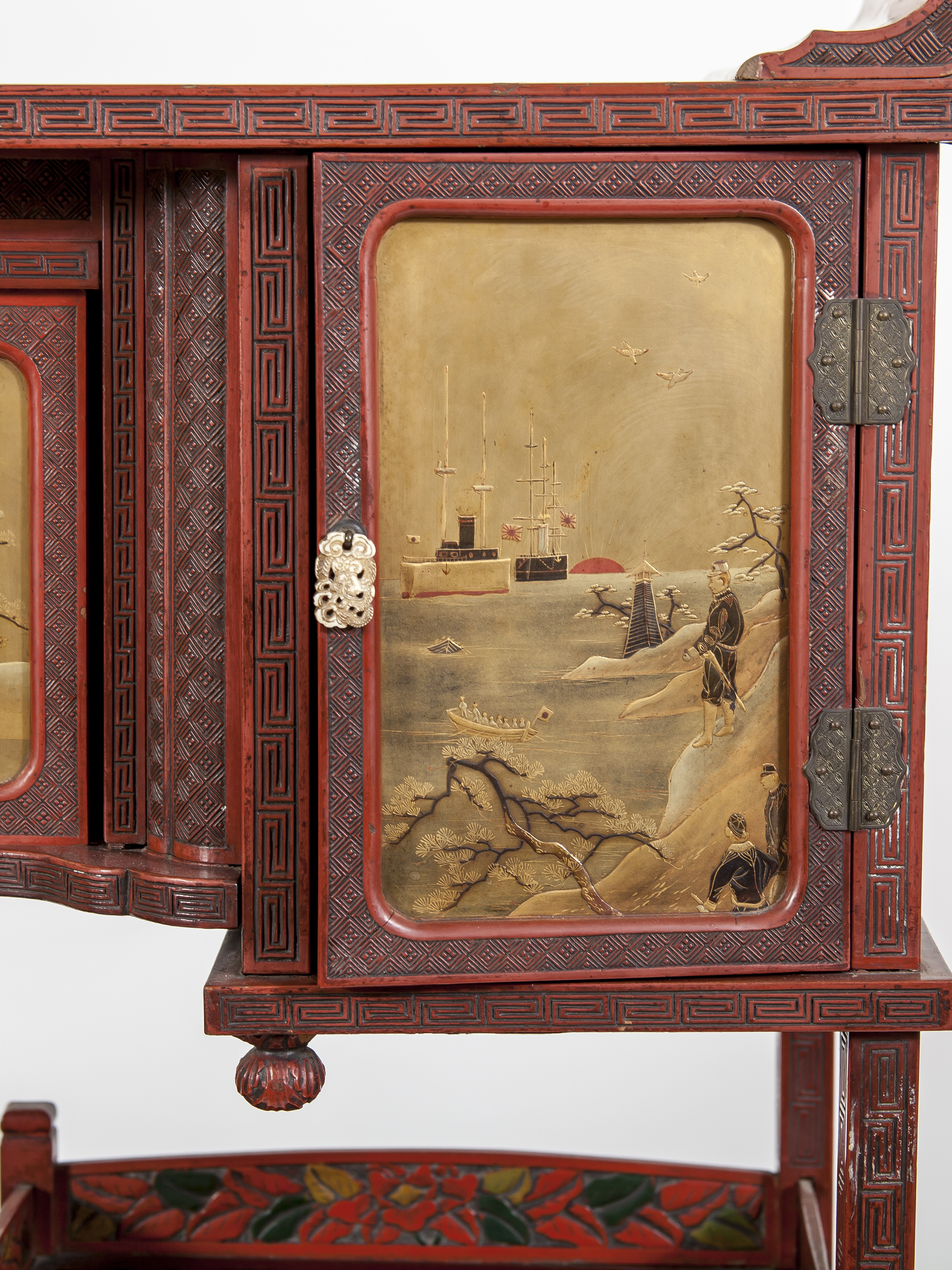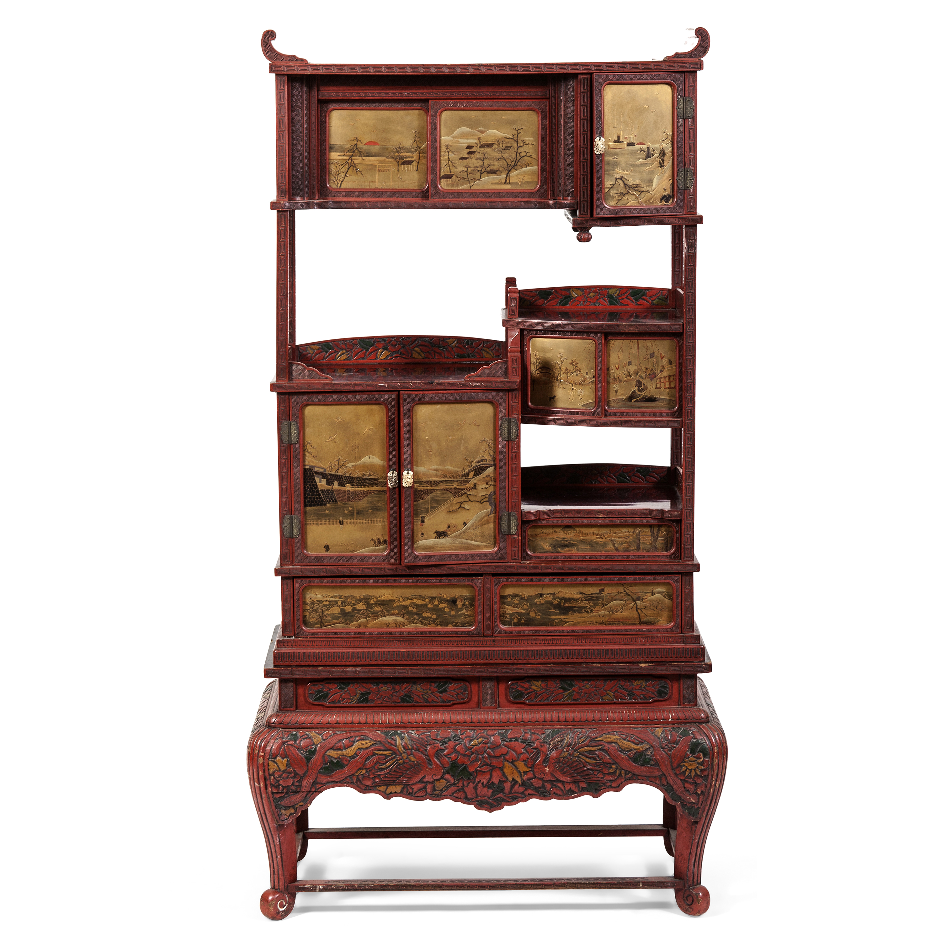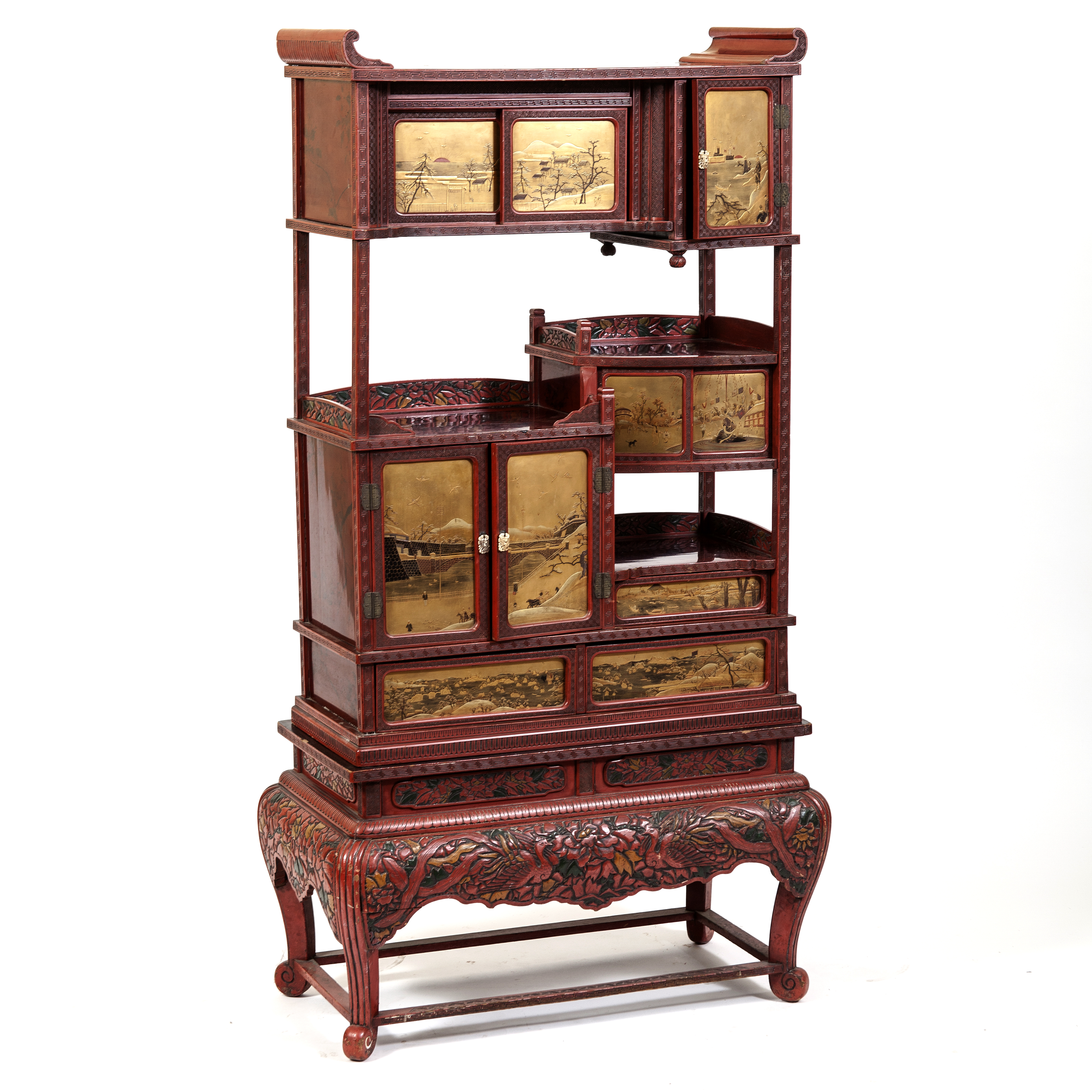 Предмет представляет собой многоярусную экспозиционную горку (shodana) — тип мебели, сложившийся в позднем Мэйдзи как адаптация традиционных японских открытых полок к формату закрытой мебельной единицы для демонстрации коллекционных предметов.