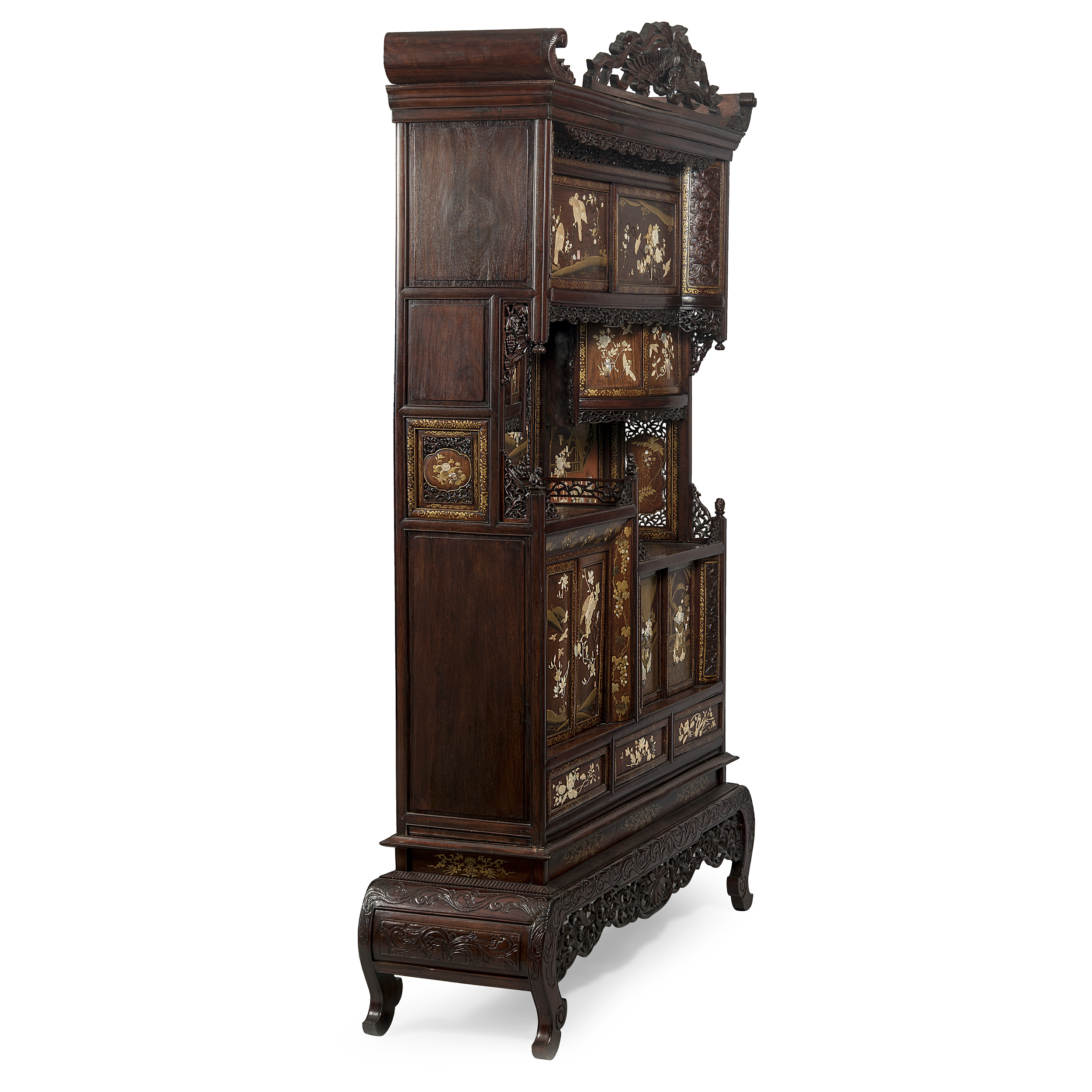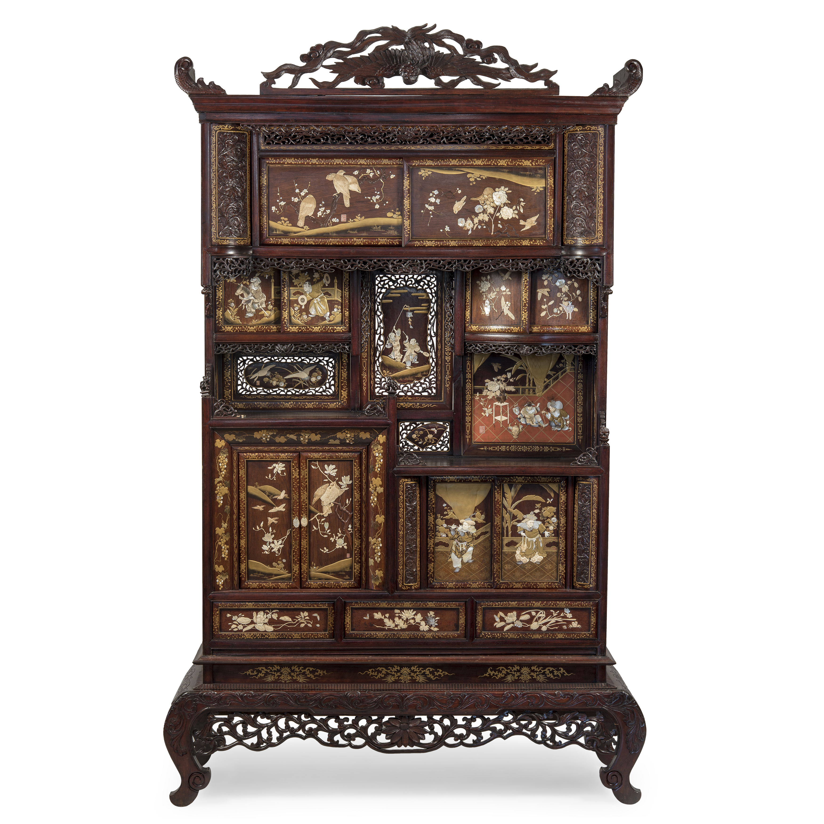Японский кабинет эпохи Мэйдзи, созданный в 1880-1890-е годы, воплощает собой синтез высочайшего художественного мастерства и культурного диалога между Востоком и Западом. Этот период в истории Японии, ознаменованный открытостью миру, породил особый класс предметов роскоши, предназначавшихся как для внутреннего рынка, так и для взыскательной западной клиентуры. Кабинет выполнен из массива тропических пород дерева, глубокая и благородная текстура служит идеальной основой для сложнейшего декора. Его монументальная форма, несущая в себе влияние европейской мебельной традиции, полностью подчинена эстетике японского искусства.