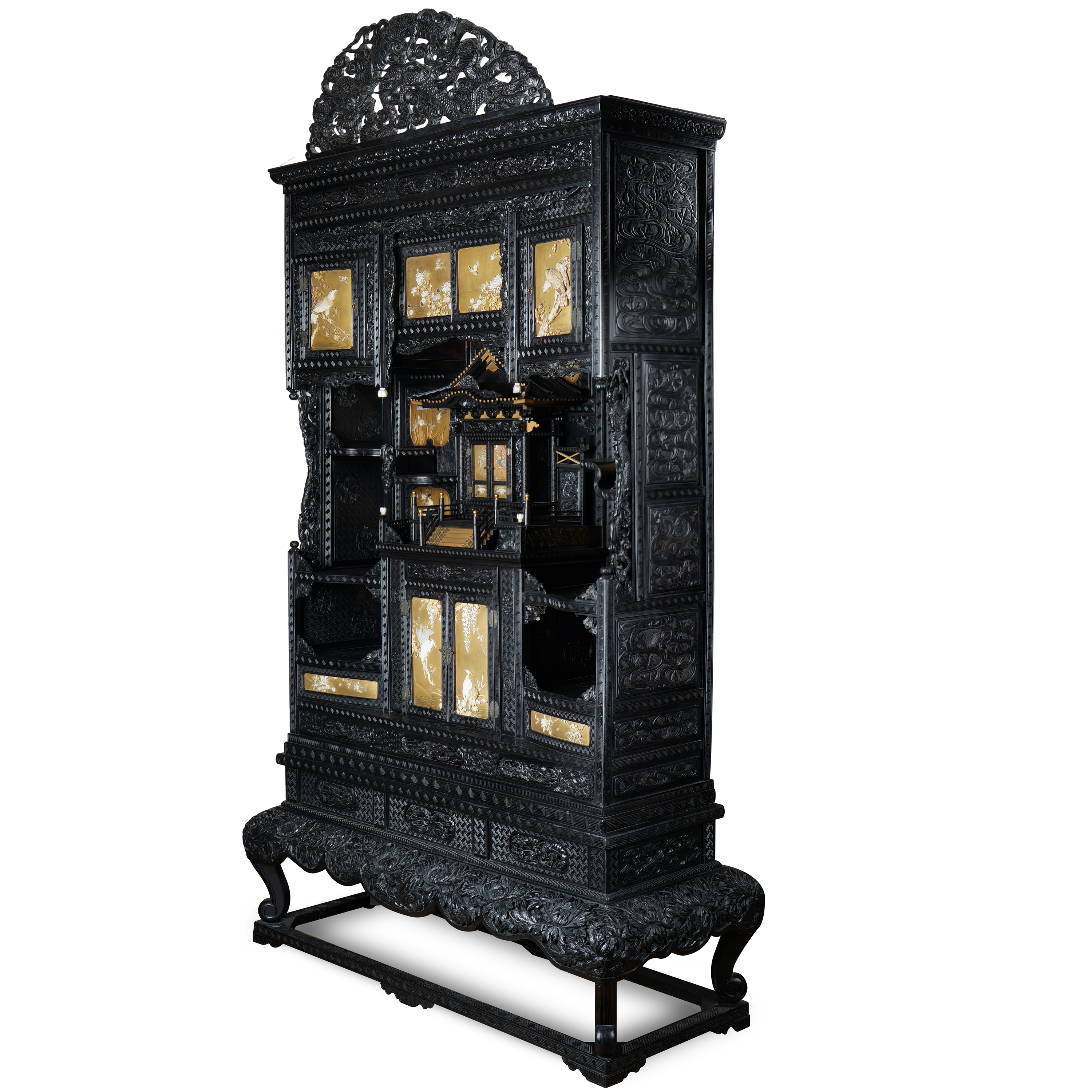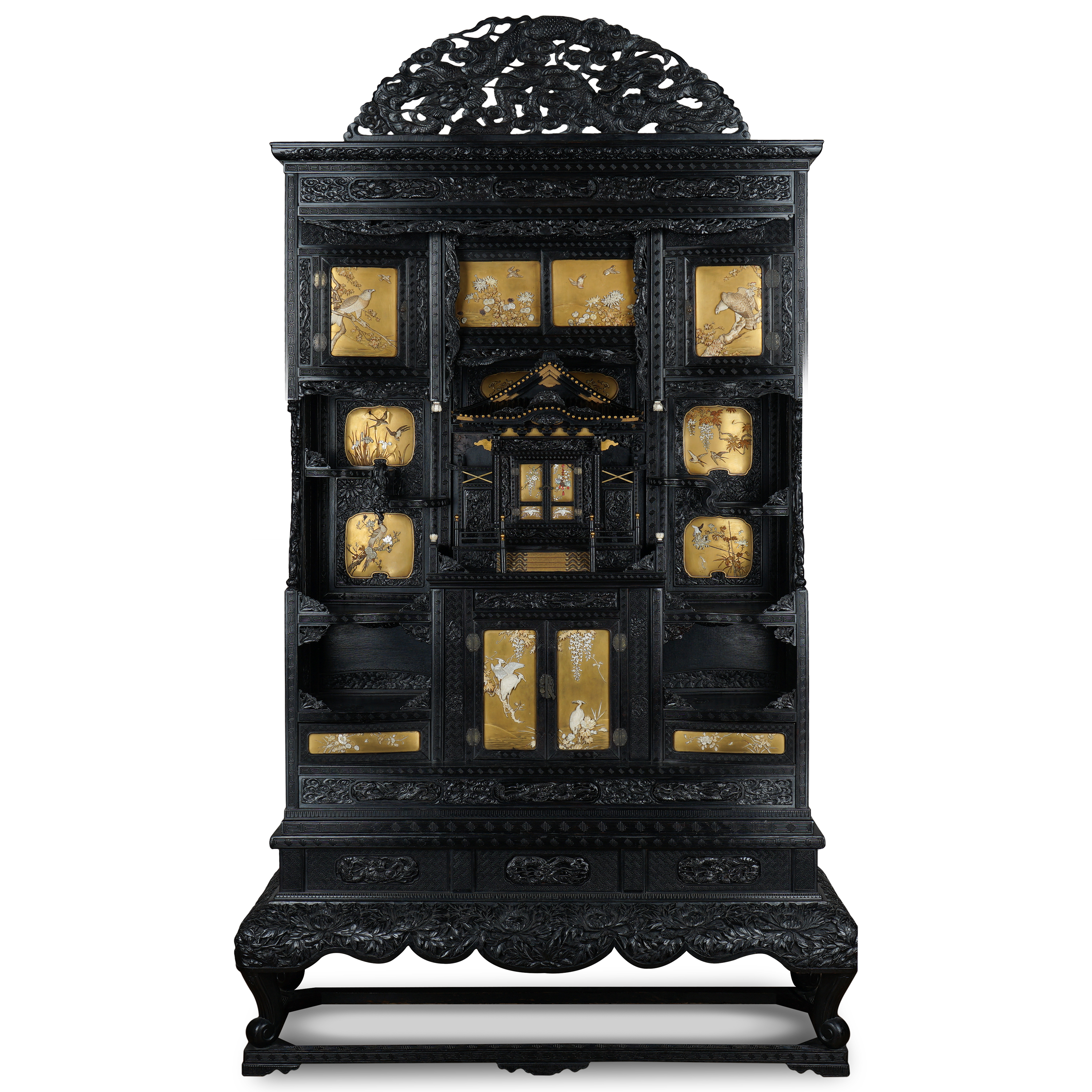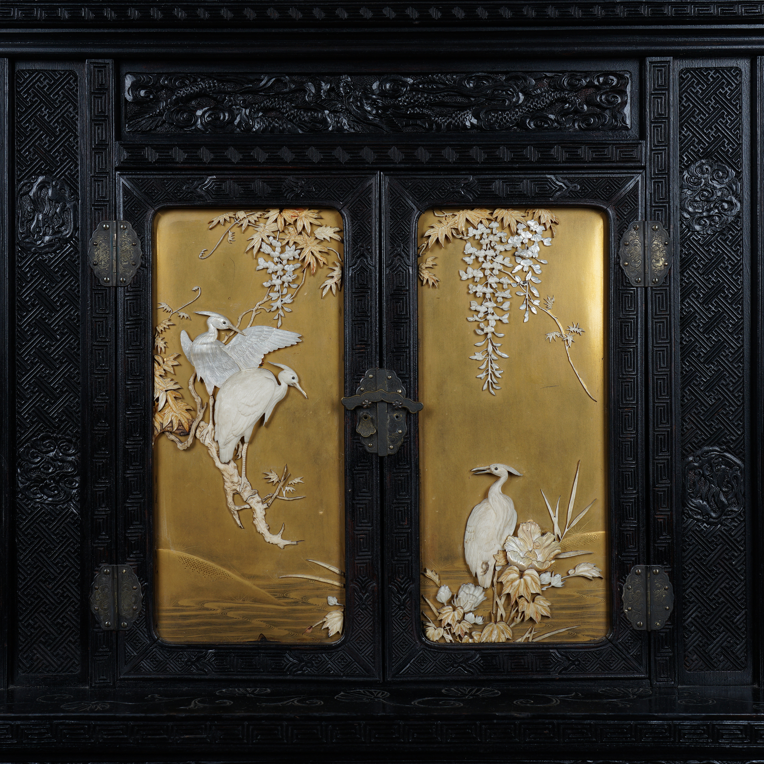 Япония, эпоха Мэйдзи (1868-1912). Дерево, резьба, золотой и цветной лак, инкрустация слоновой костью перламутром в традиционной японской технике сибаяма. Размеры по основанию: 244 х 143 х 56 см; размеры основной части: 244 х 126 х 41 см.